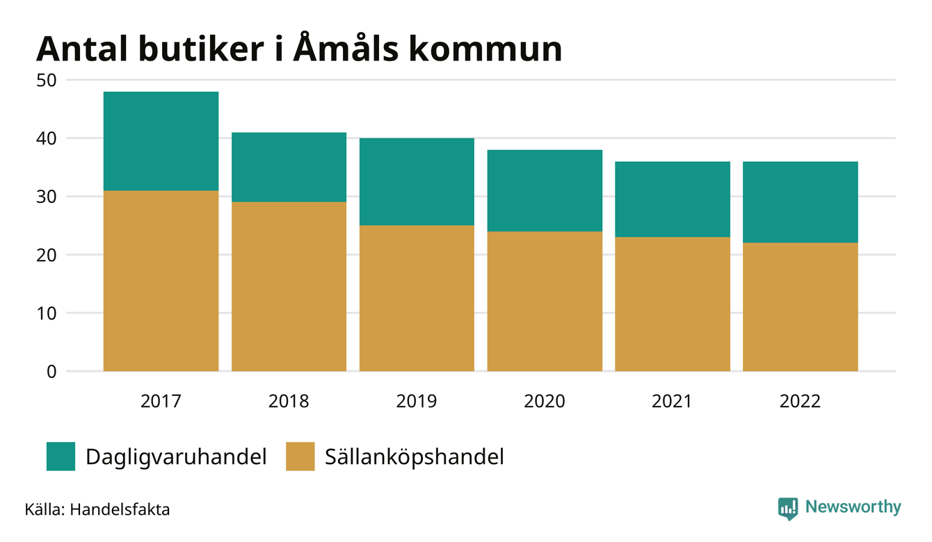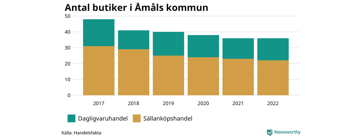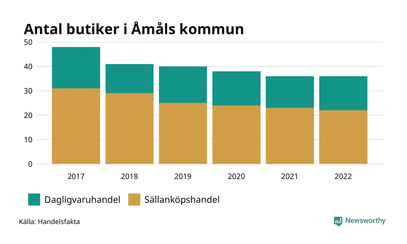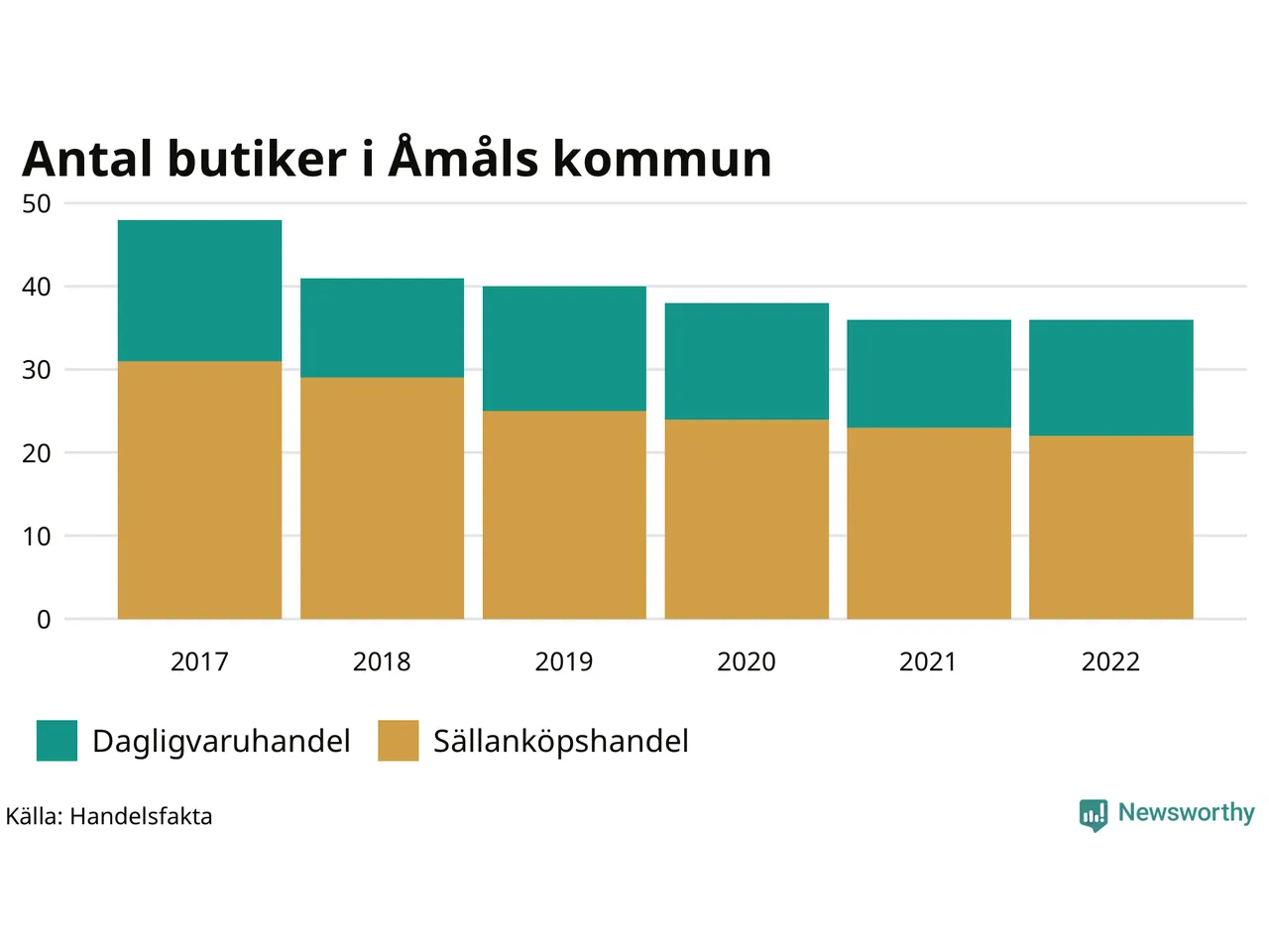 I Åmåls kommun har utvecklingen gått ännu fortare. Här har var fjärde butik försvunnit. Den 30 november 2022 fanns 36 butiker i kommunen, vilket är lika många som året innan men tolv färre än 2017.