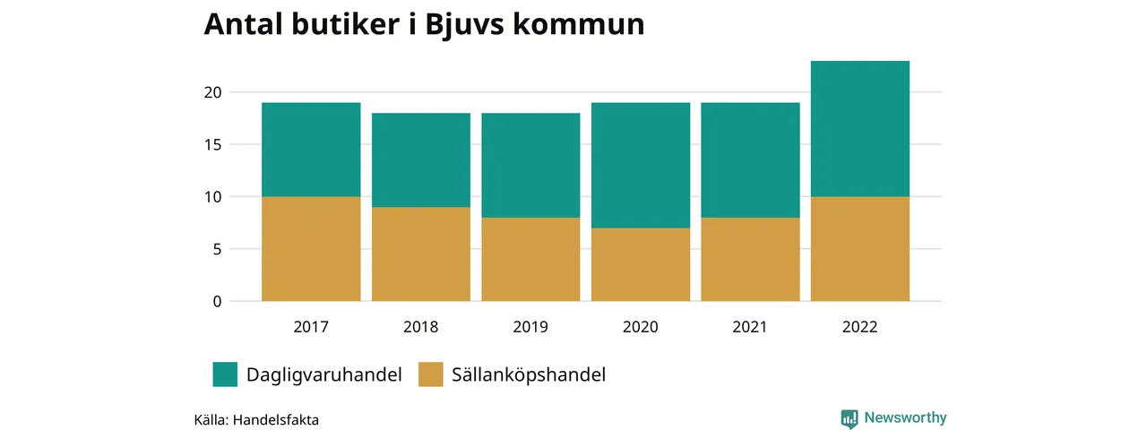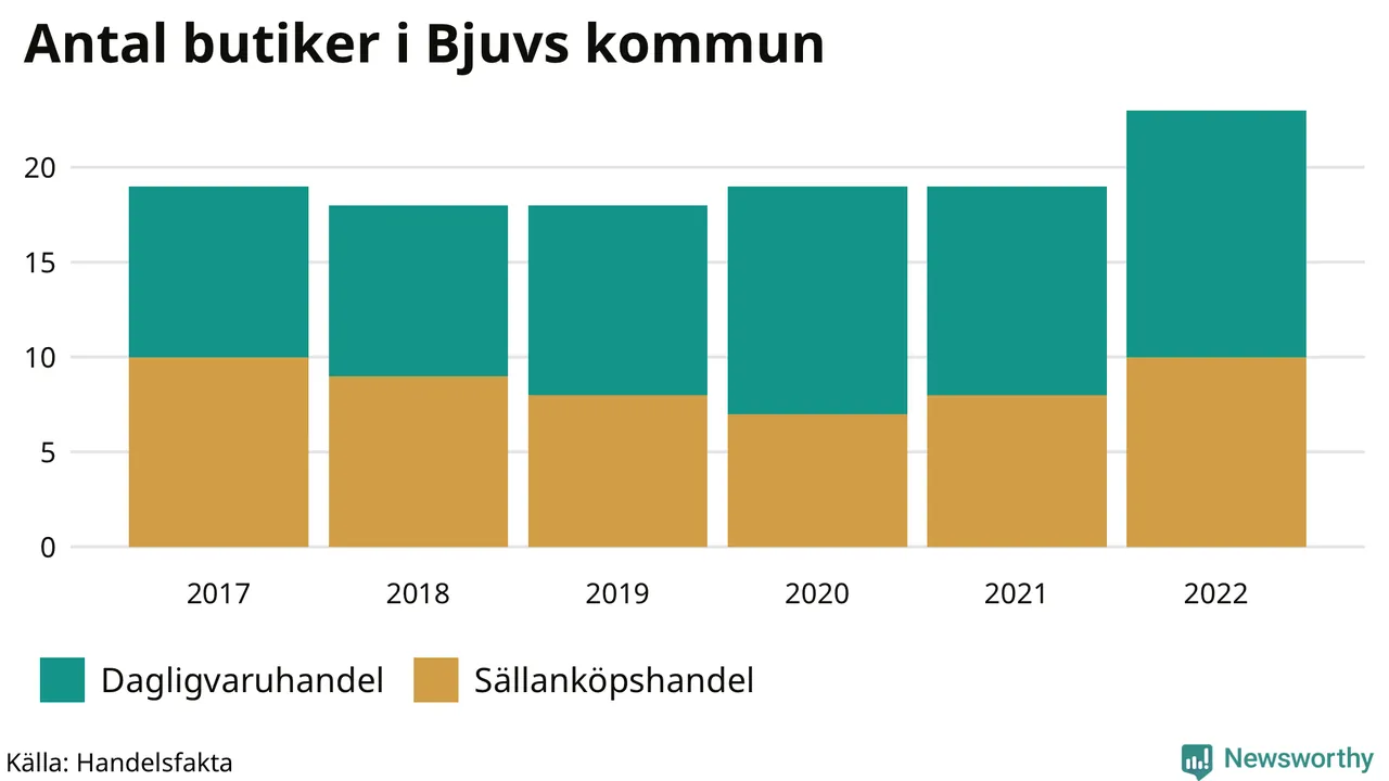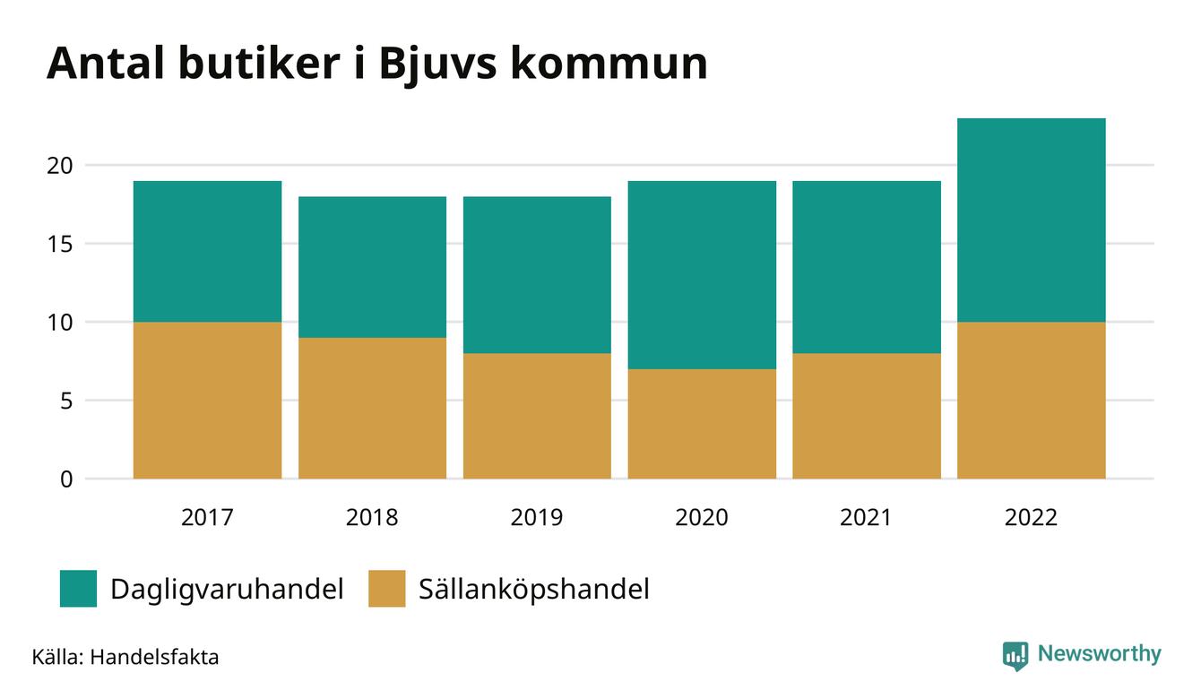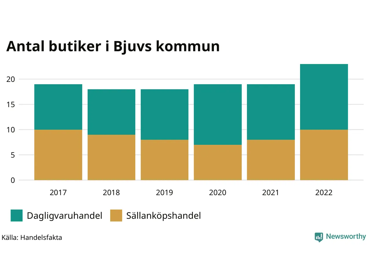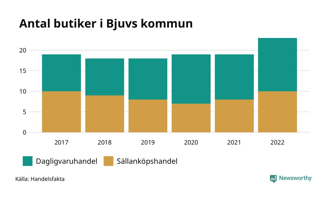 I Bjuv rör det sig om små tal. Den 30 november 2022 fanns 23 butiker i kommunen, vilket är fyra fler än året innan och fyra fler än 2017.