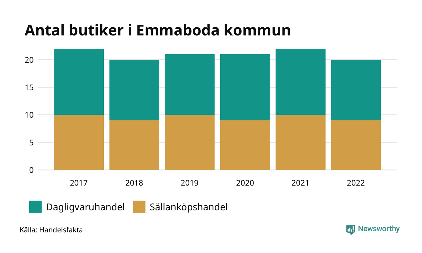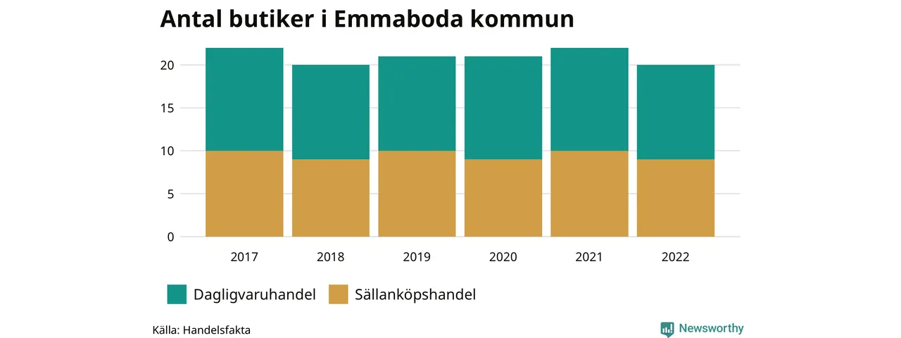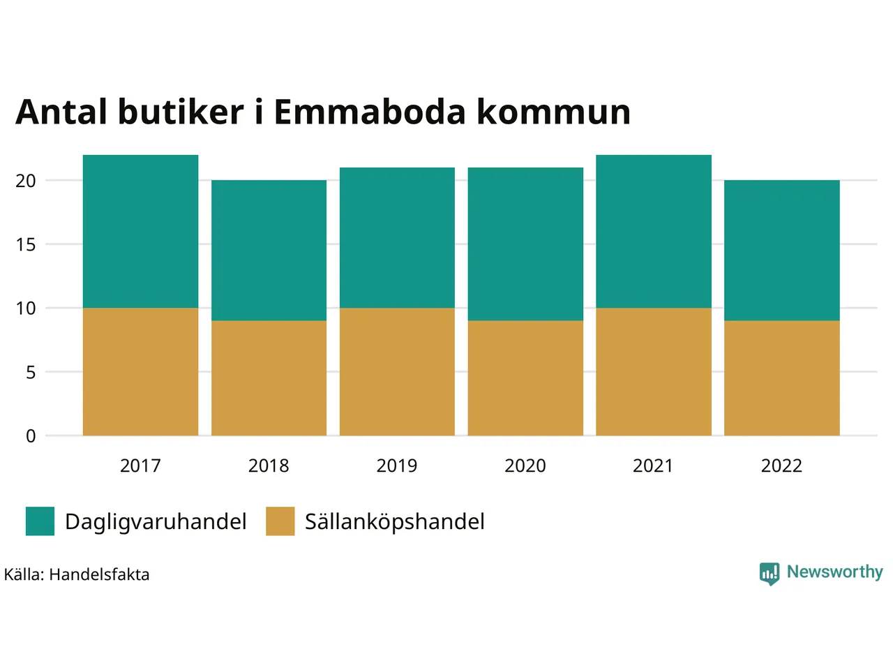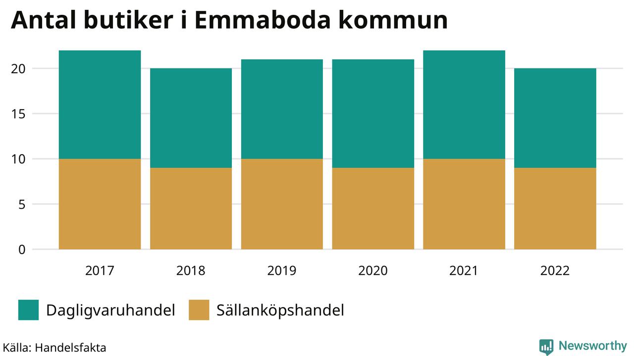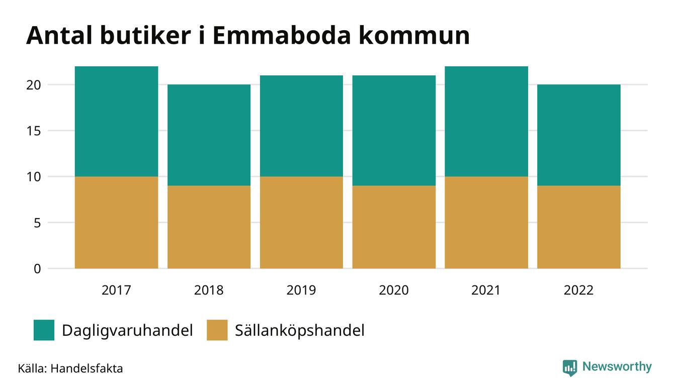 I Emmaboda rör det sig om små tal. Den 30 november 2022 fanns 20 butiker i kommunen, vilket är två färre än året innan och två färre än 2017.