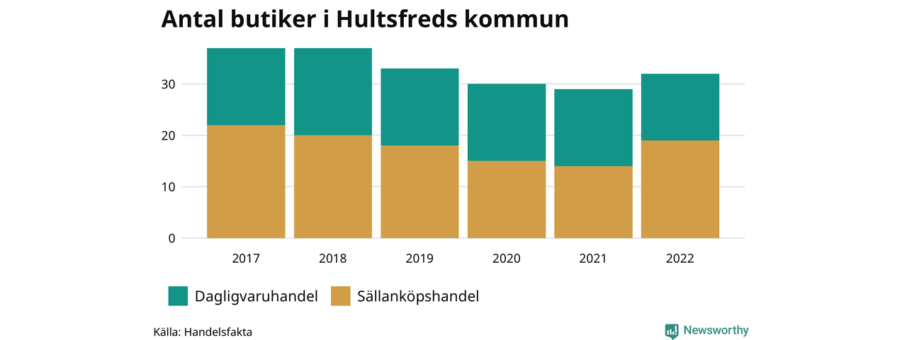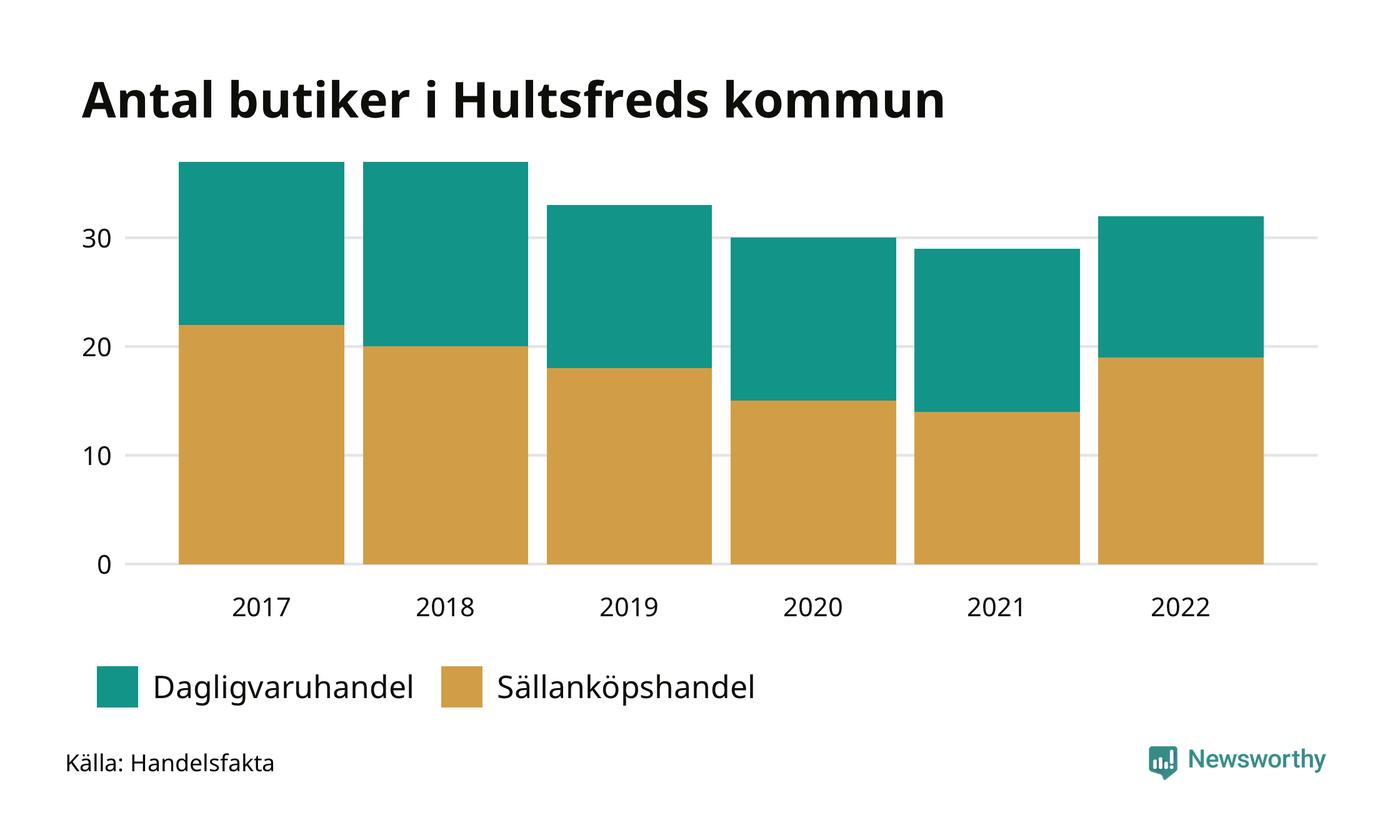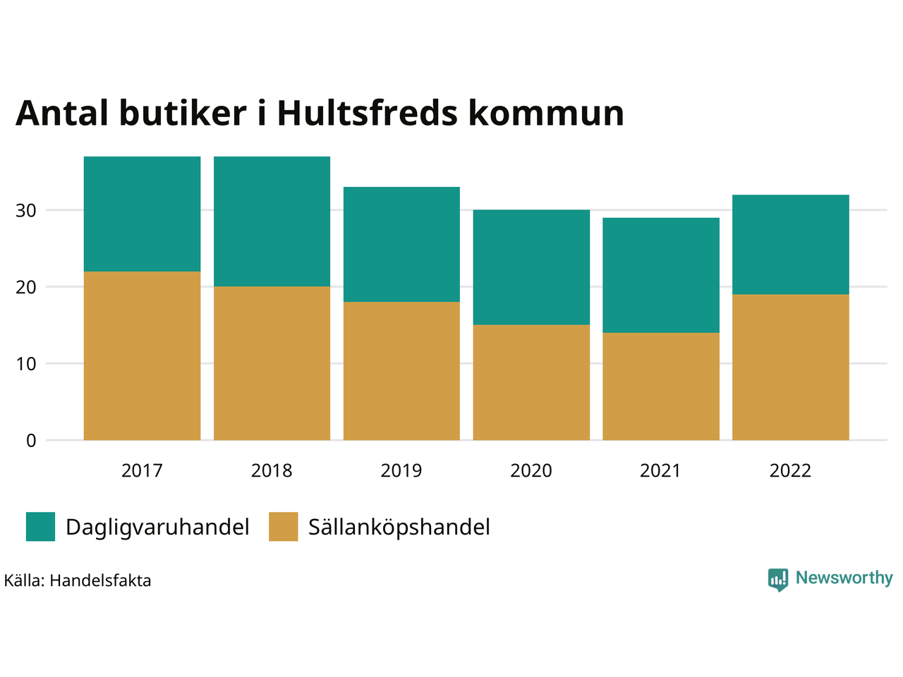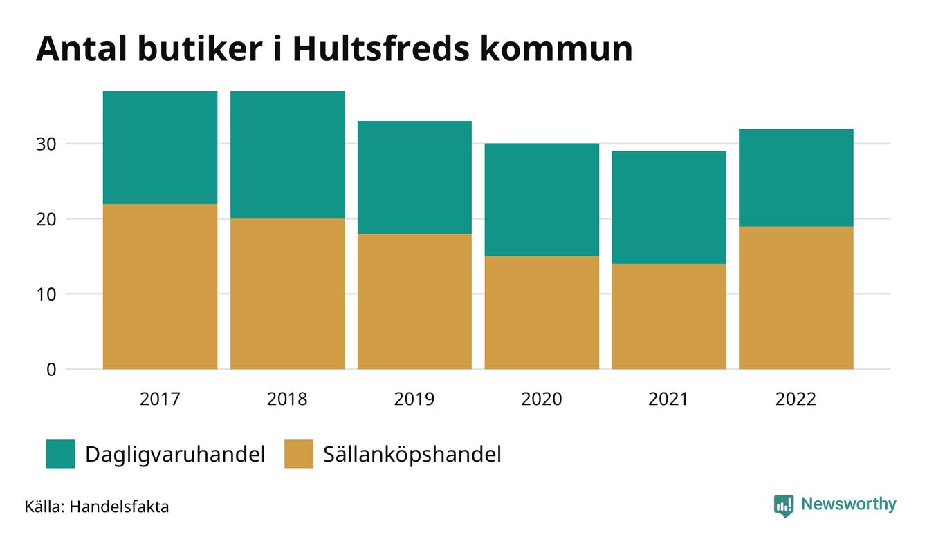 I Hultsfreds kommun har utvecklingen gått ännu fortare. Här har var sjunde butik försvunnit. Den 30 november 2022 fanns 32 butiker i kommunen, vilket är tre fler än året innan men fem färre än 2017.