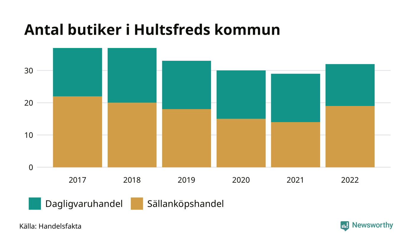 Flest butiker har försvunnit bland dem som kategoriseras som sällanköp, till exempel klädaffärer och bokhandlar. 2017 fanns 22 sådana butiker i kommunen – 2022 var de 19. Dagligvaruhhandeln, där bland annat mataffärer ingår, har minskat från 15 till 13 butiker.