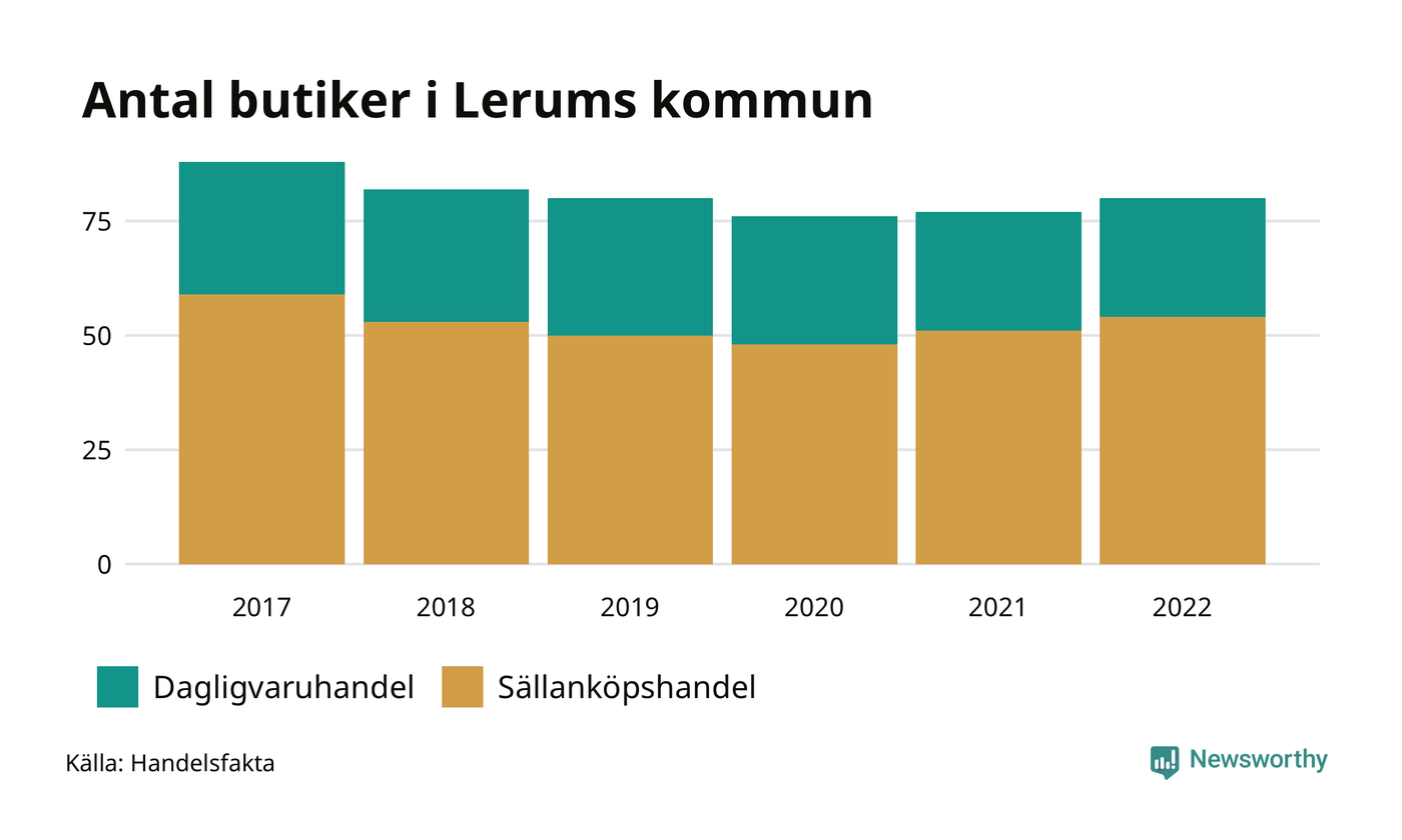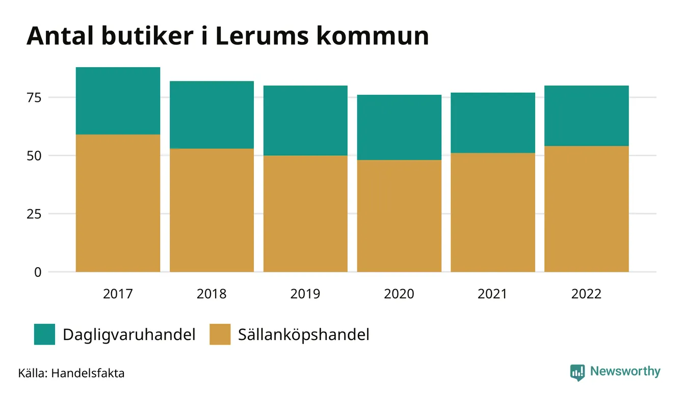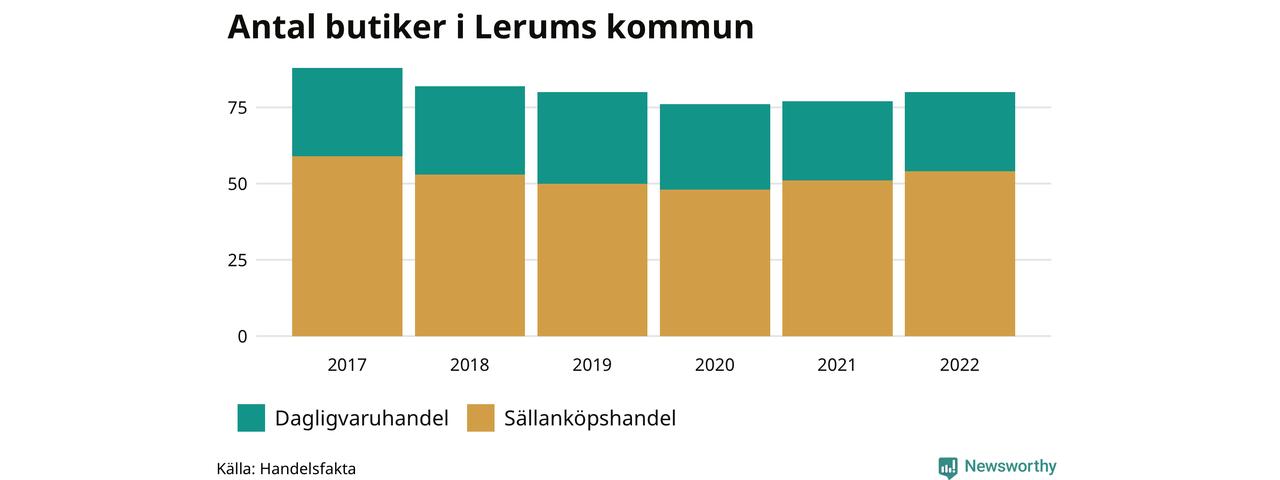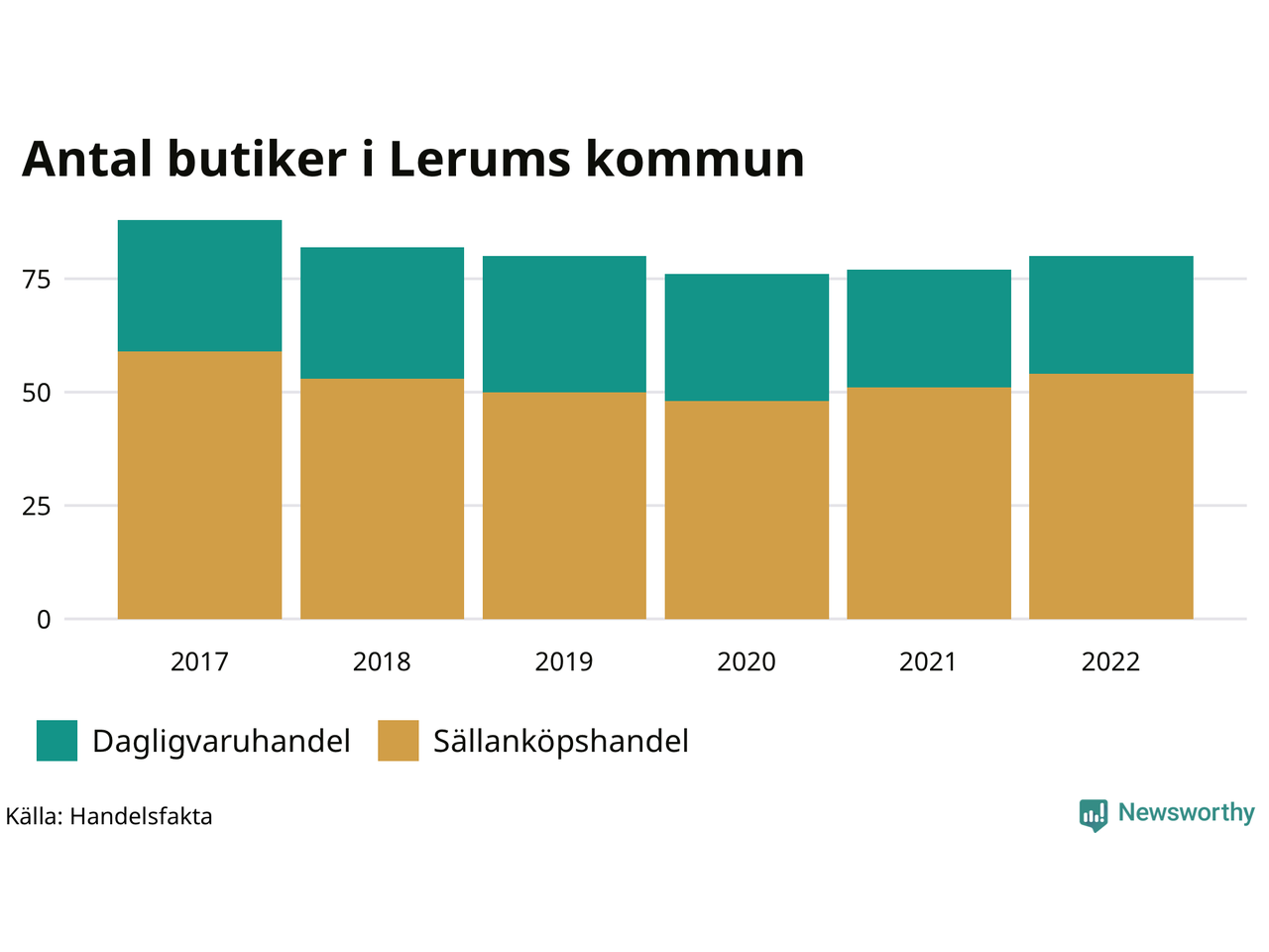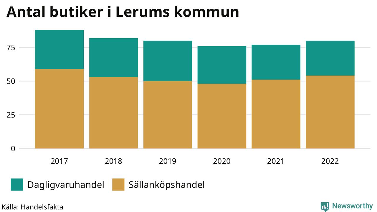 Samma utveckling ses i Lerums kommun. Den 30 november 2022 fanns 80 butiker i kommunen, vilket är tre fler än året innan men åtta färre än 2017.