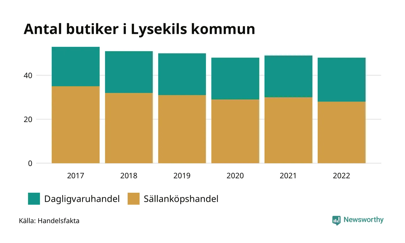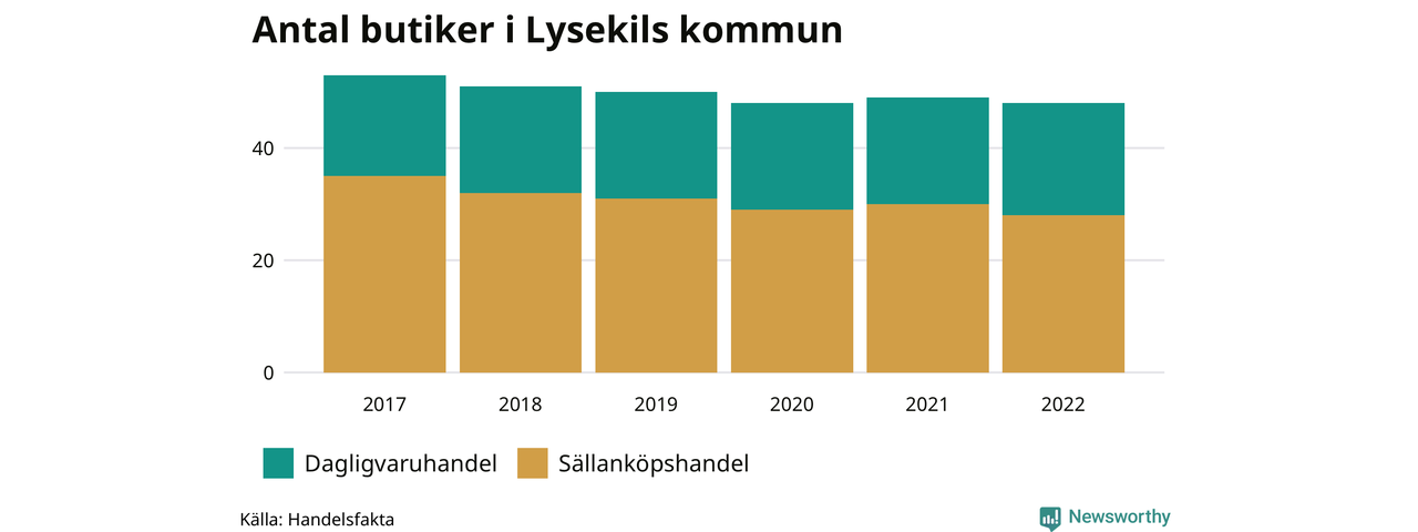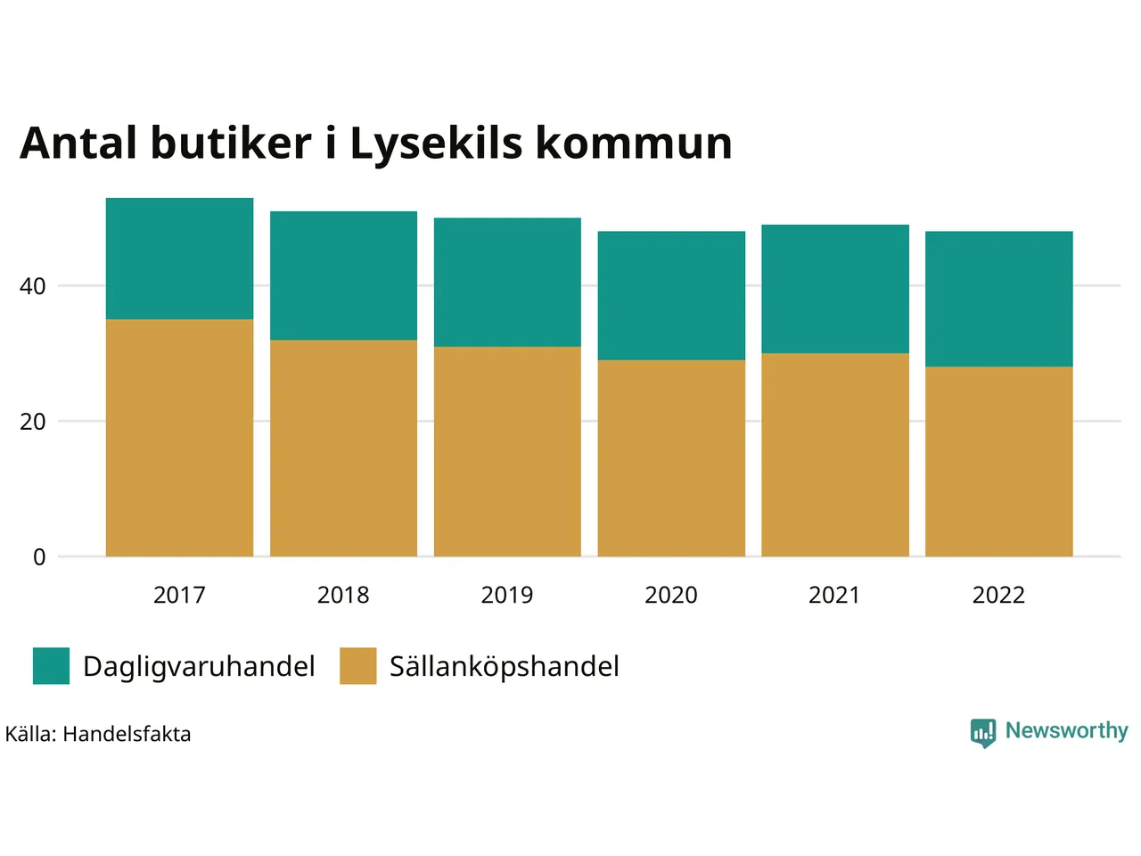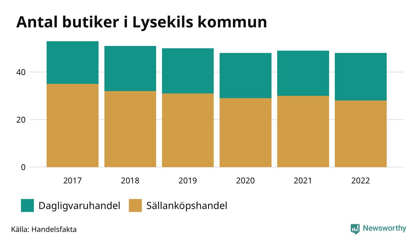 I Lysekils kommun har utvecklingen gått ännu fortare. Här har var tionde butik försvunnit. Den 30 november 2022 fanns 48 butiker i kommunen, vilket är en färre än året innan och fem färre än 2017.