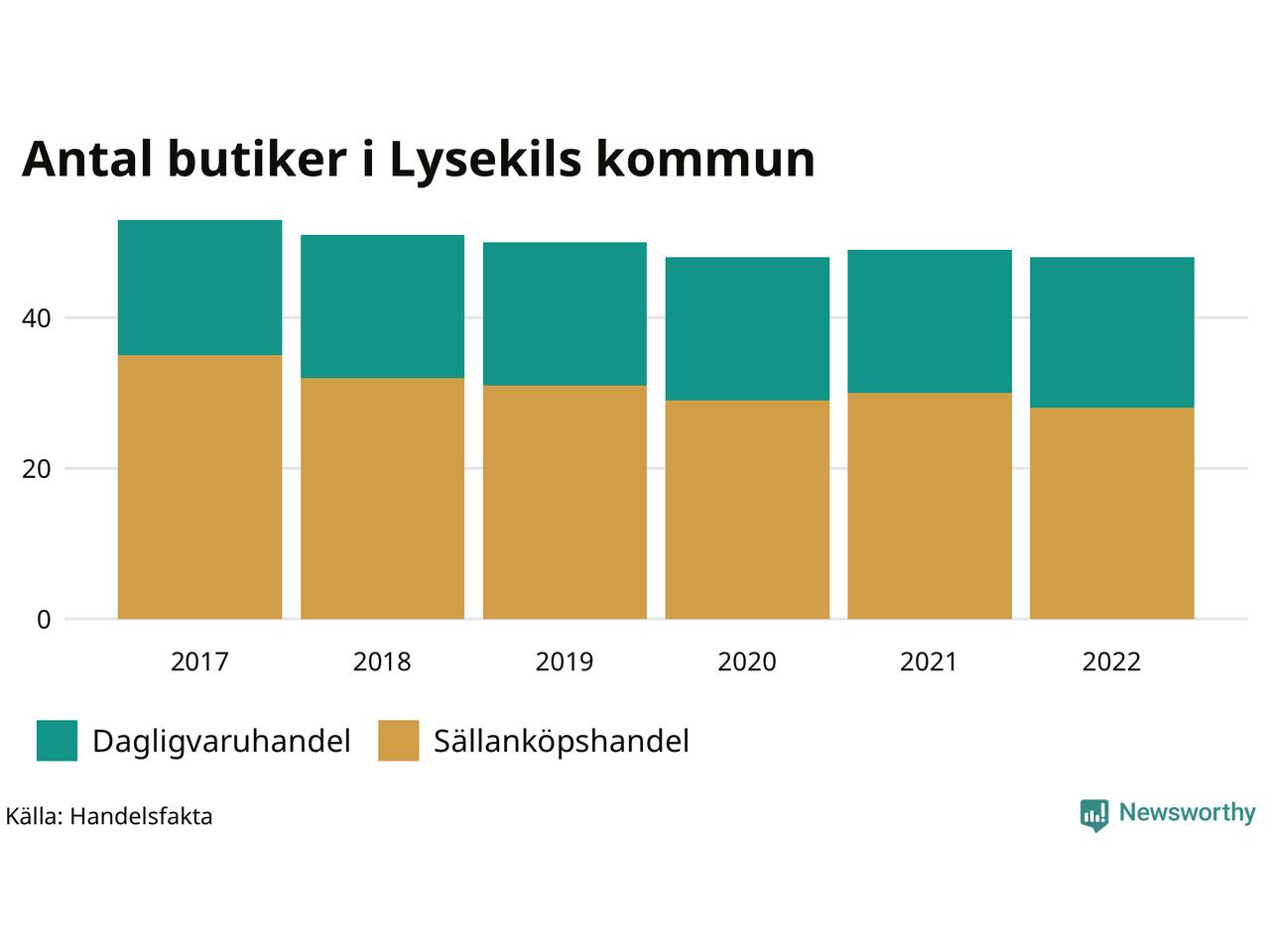 Av butikerna i Lysekil kategoriseras 20 som dagligvaruhandel, till exempel matbutiker. Det är tre fler än 2017. 28 butiker faller under kategorin sällanköp, till exempel kläd- och bygghandel, vilket är sju färre än 2017.