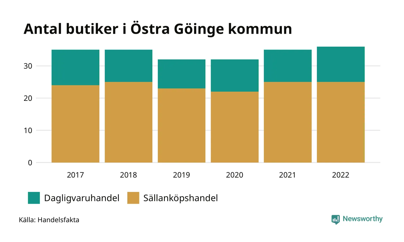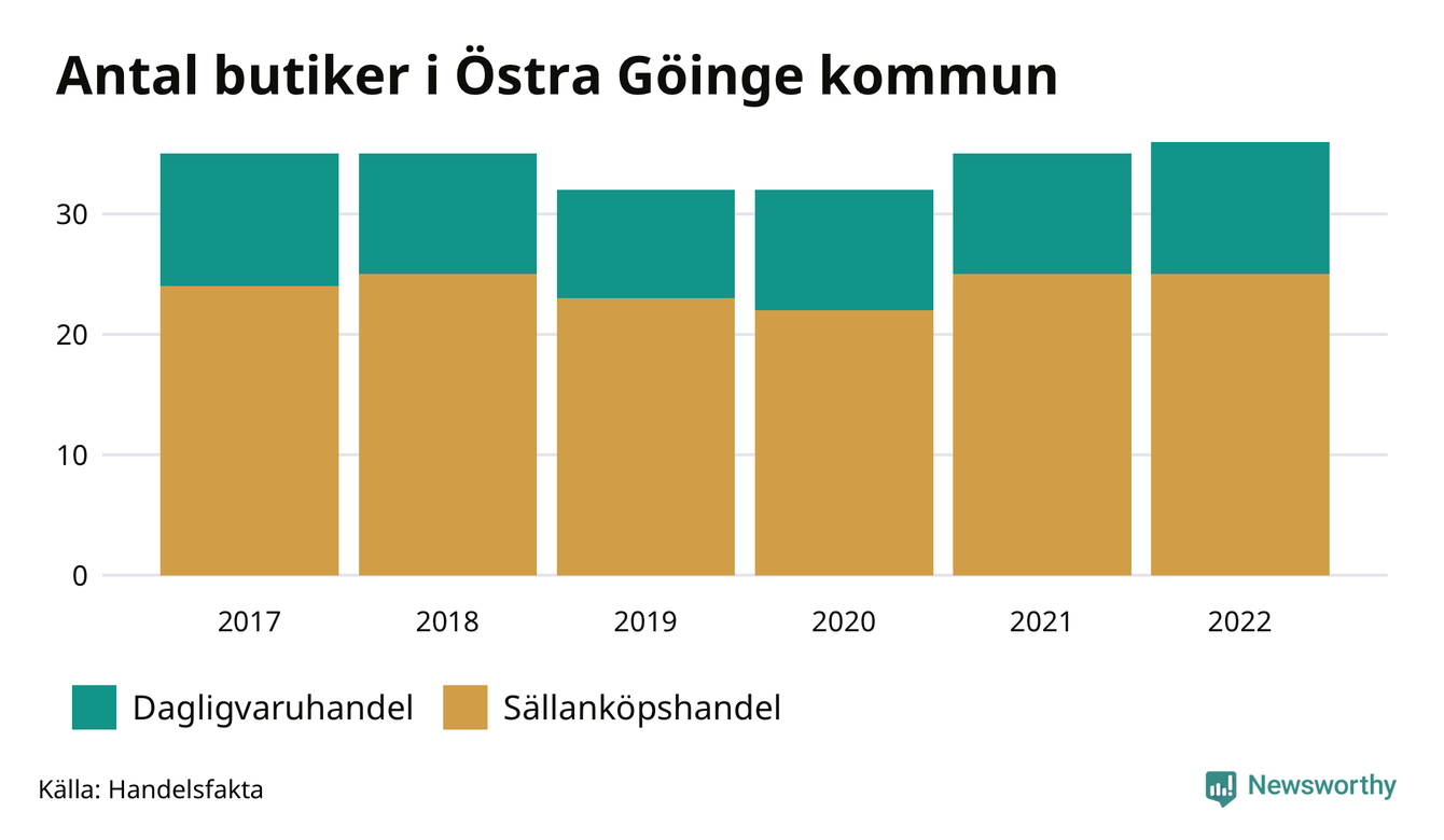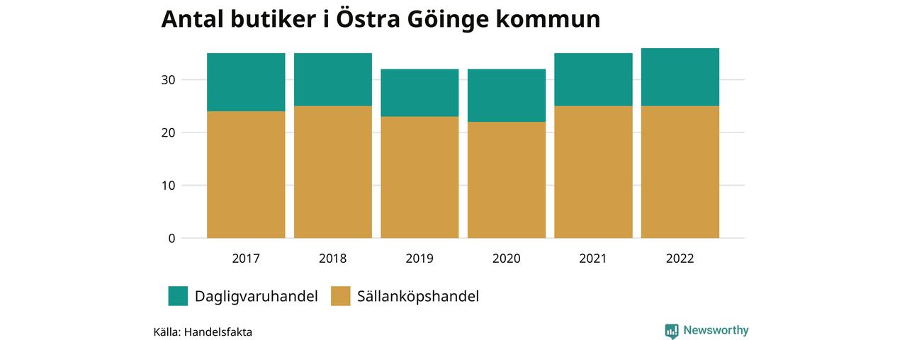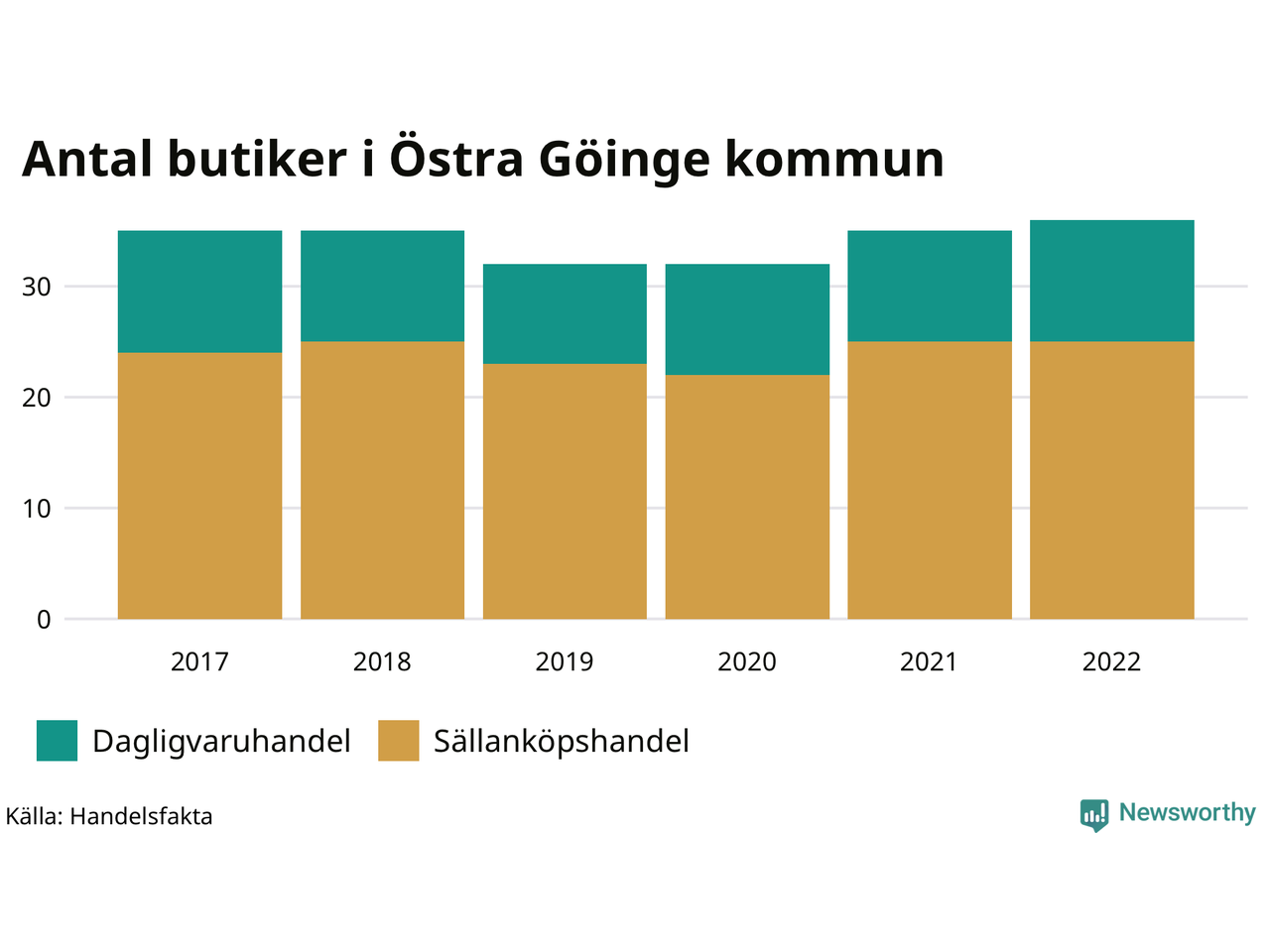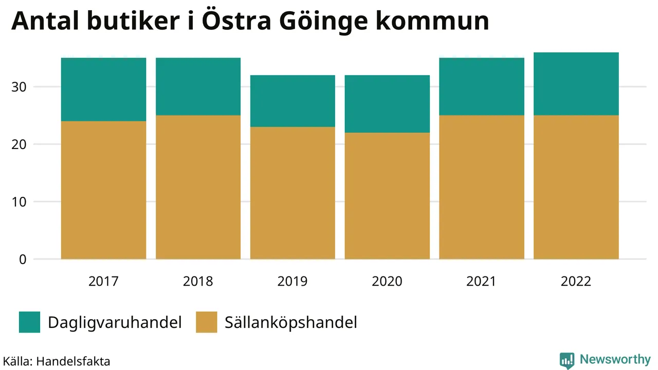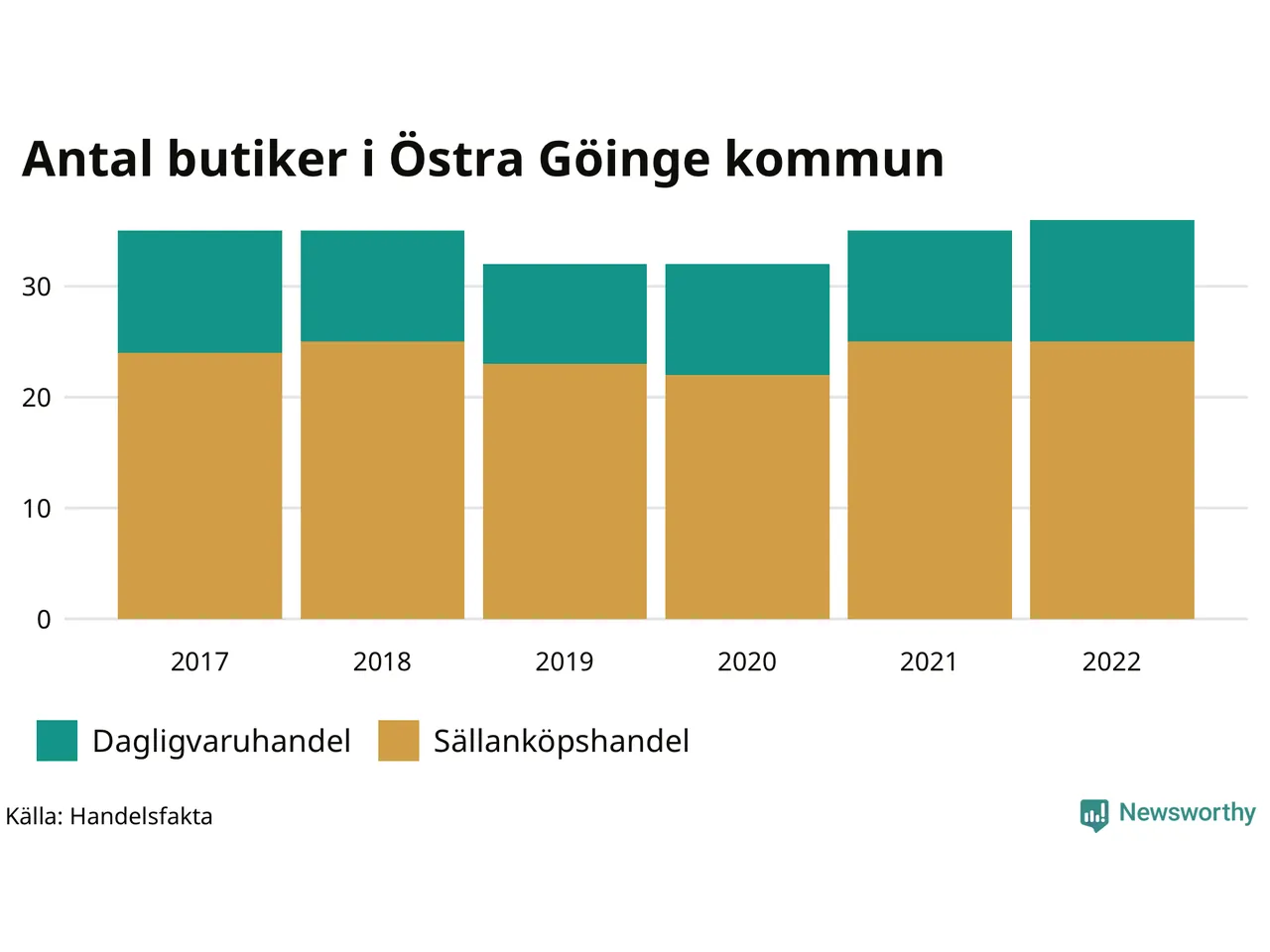 Av butikerna i Östra Göinge kategoriseras elva som dagligvaruhandel, till exempel matbutiker. Det är lika många som 2017. 25 butiker faller under kategorin sällanköp, till exempel kläd- och bygghandel, vilket är en fler än 2017.