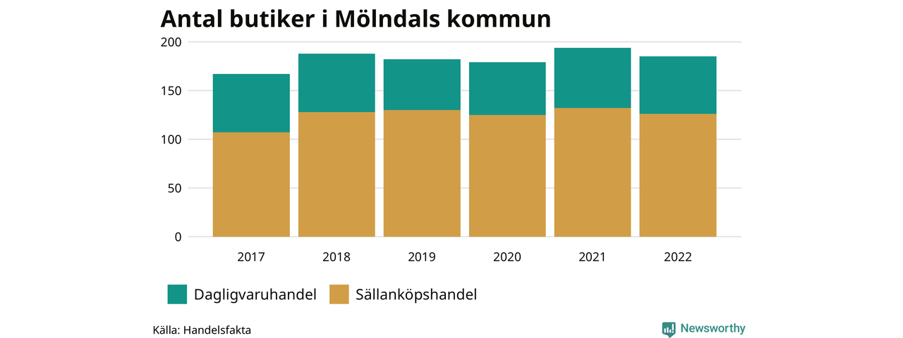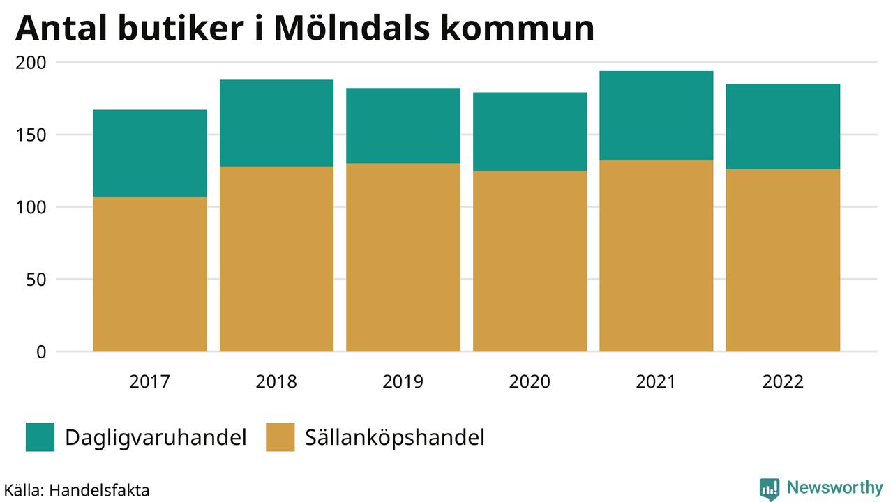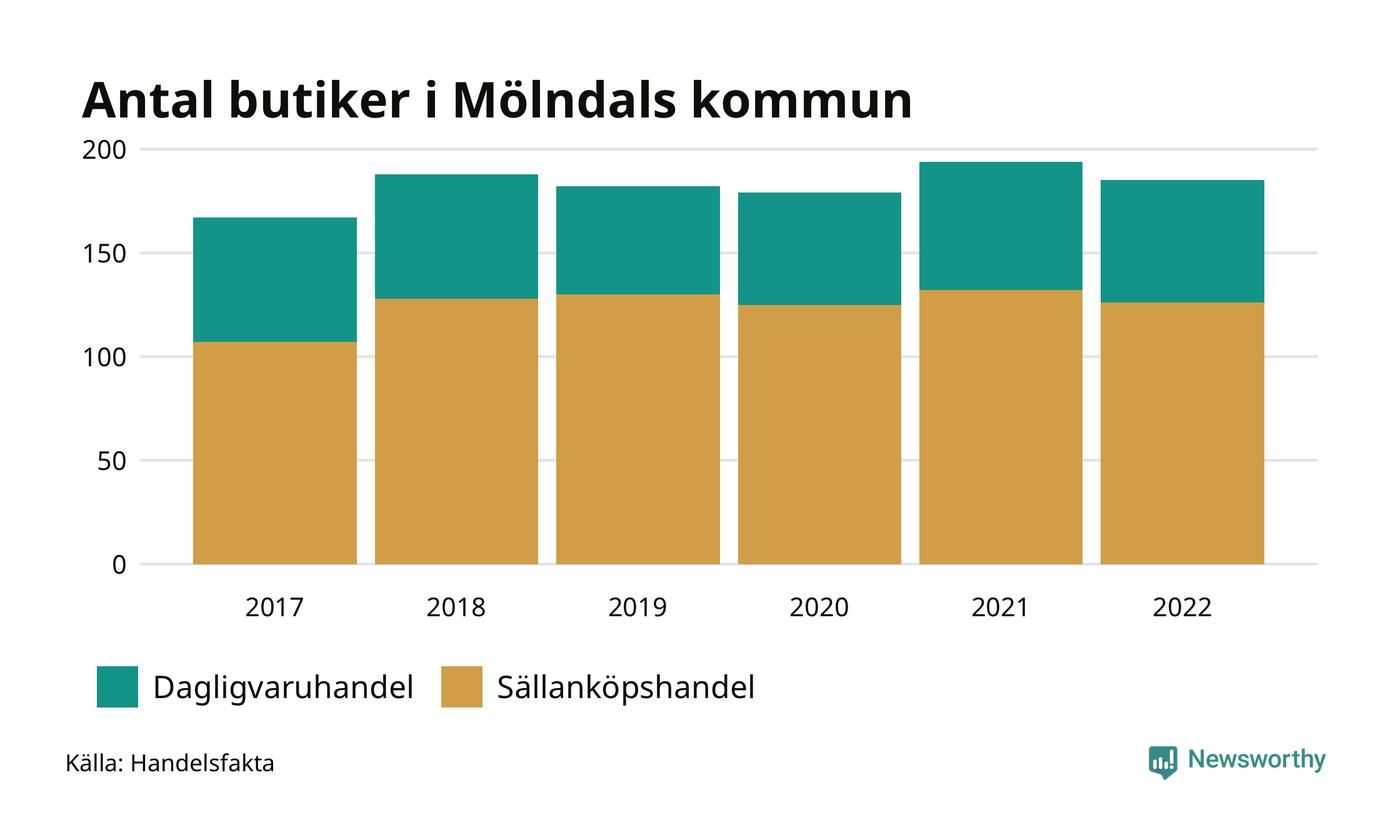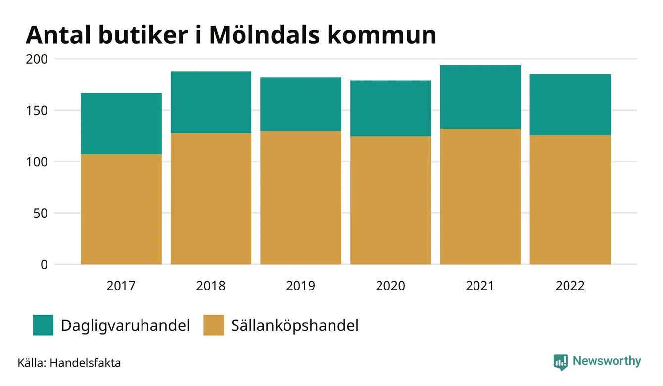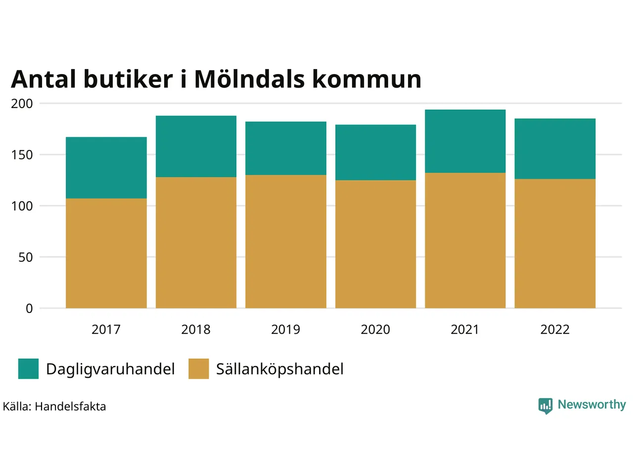 I Mölndals kommun har antalet butiker däremot ökat. Den 30 november 2022 fanns 185 butiker i kommunen, vilket är nio färre än året innan men 18 fler än 2017.