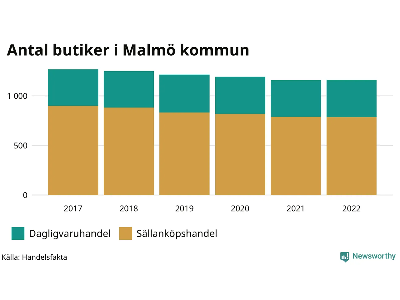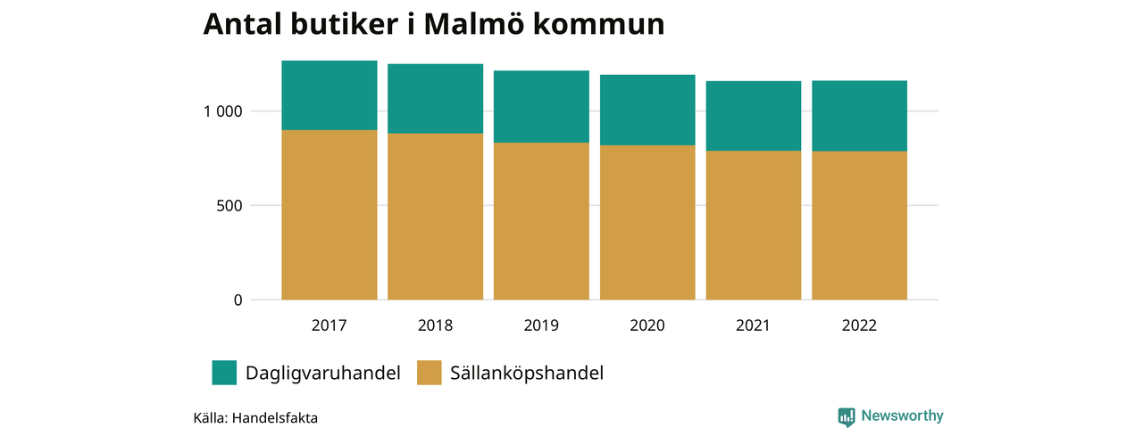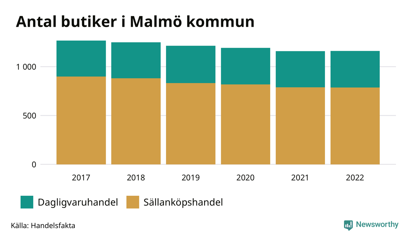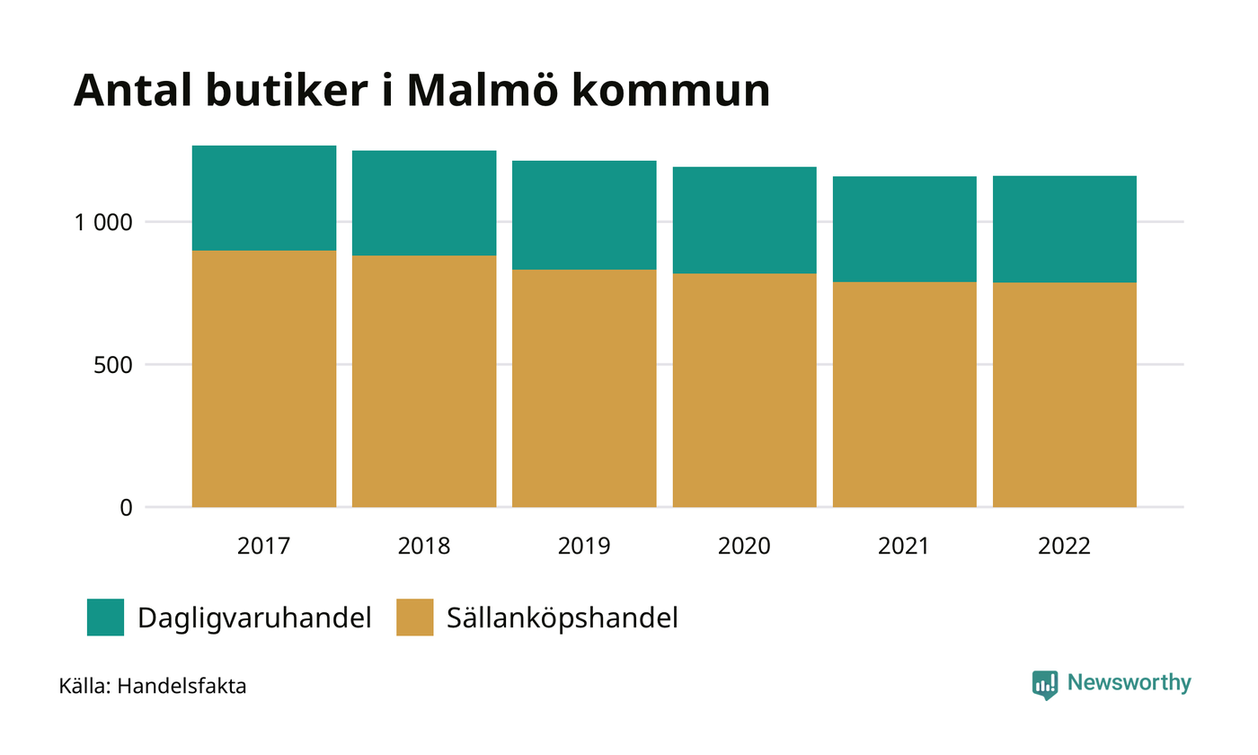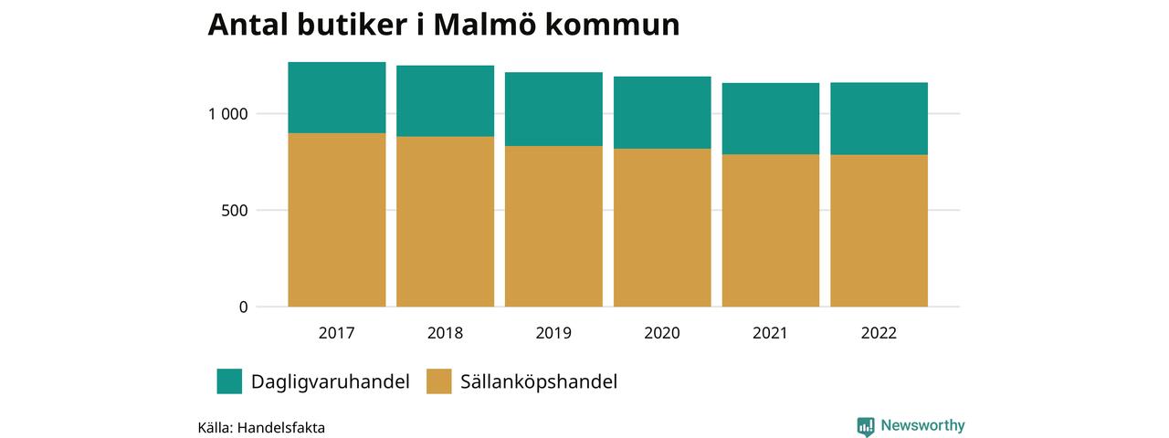 Samma utveckling ses i Malmö kommun. Den 30 november 2022 fanns 1 161 butiker i kommunen, vilket är två fler än året innan men 107 färre än 2017.