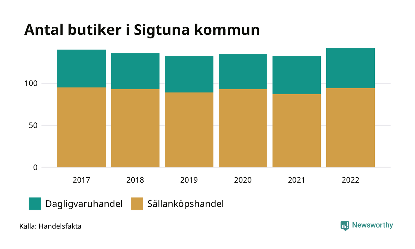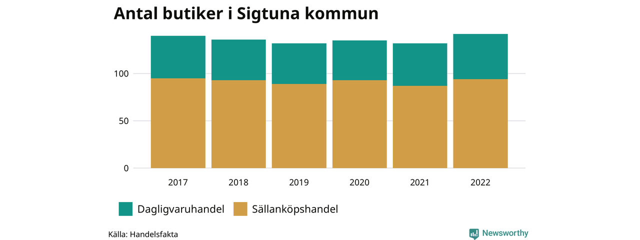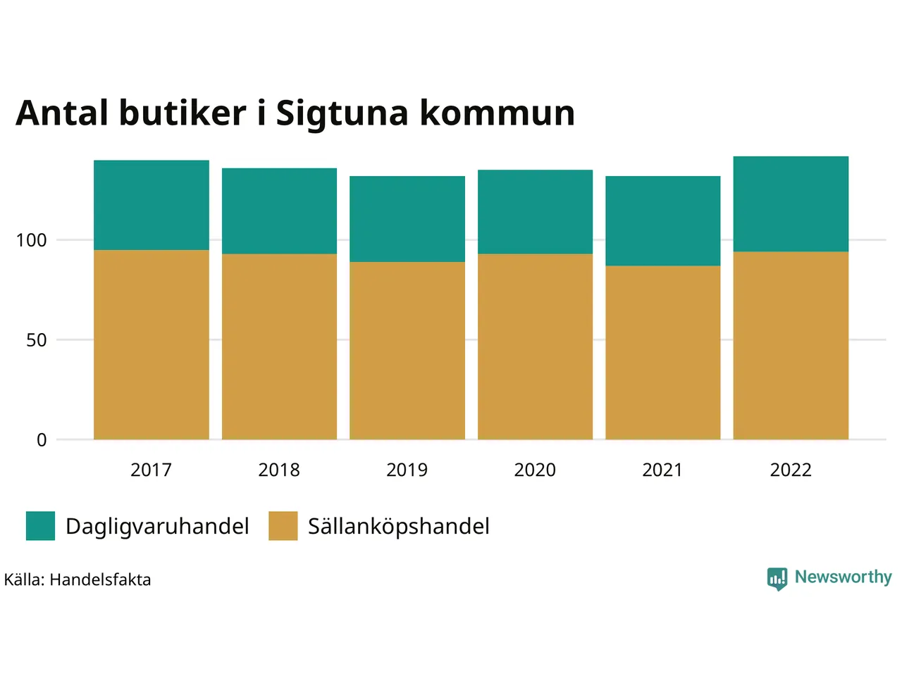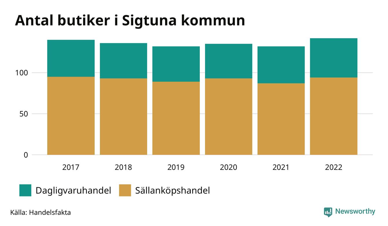I Sigtuna kommun har förändringarna varit relativt små. Den 30 november 2022 fanns 142 butiker i kommunen, vilket är tio fler än året innan och två fler än 2017.