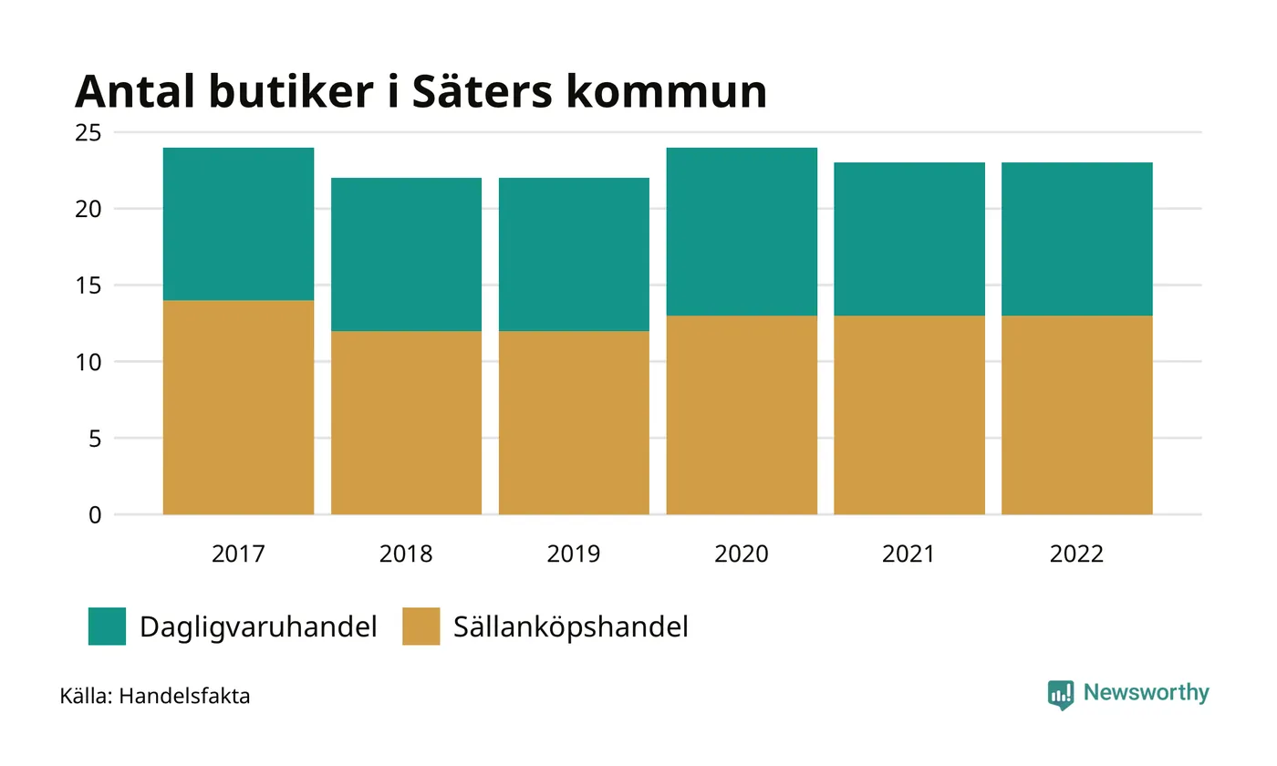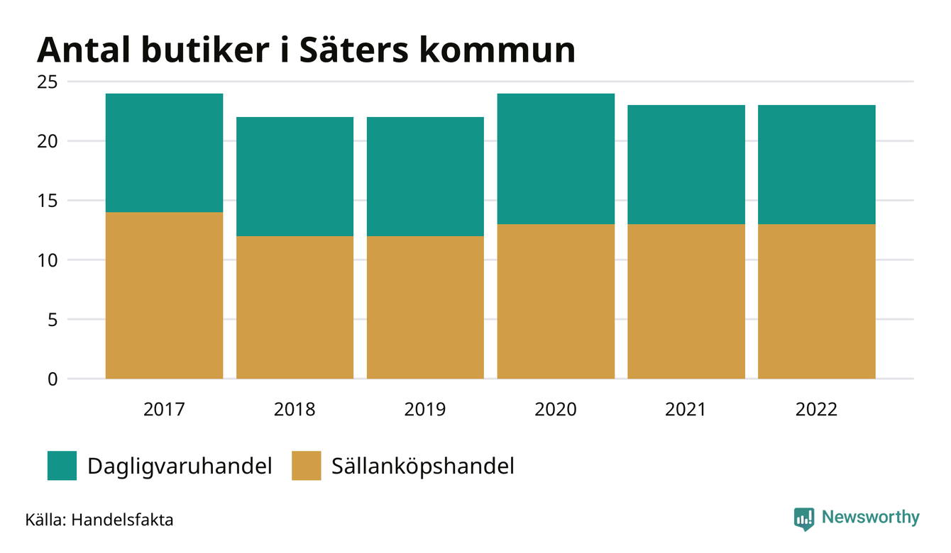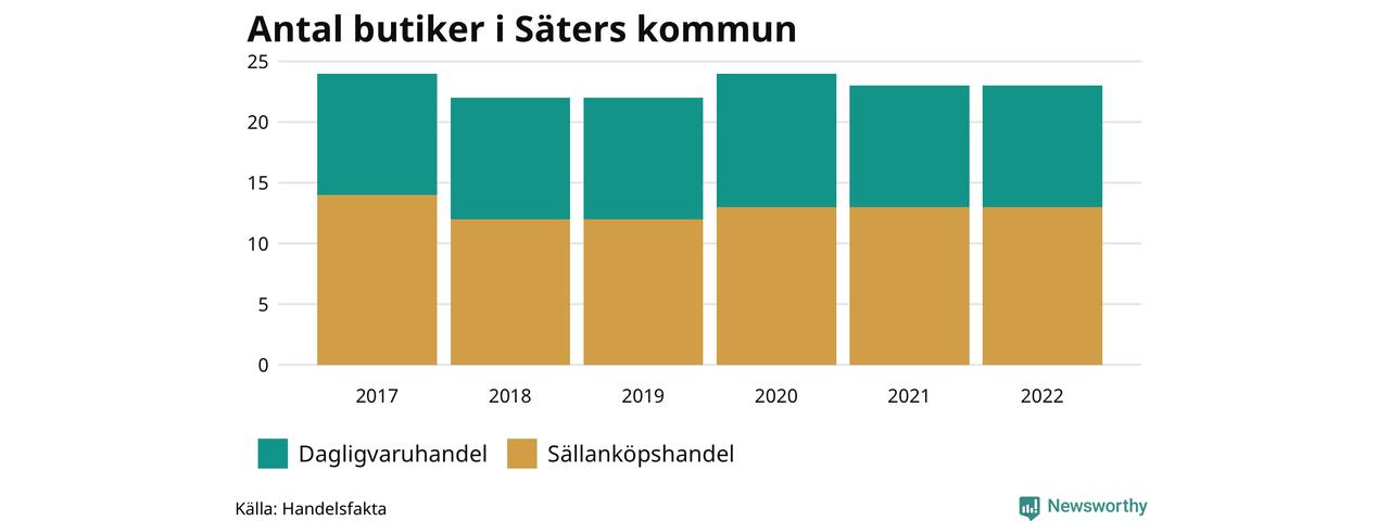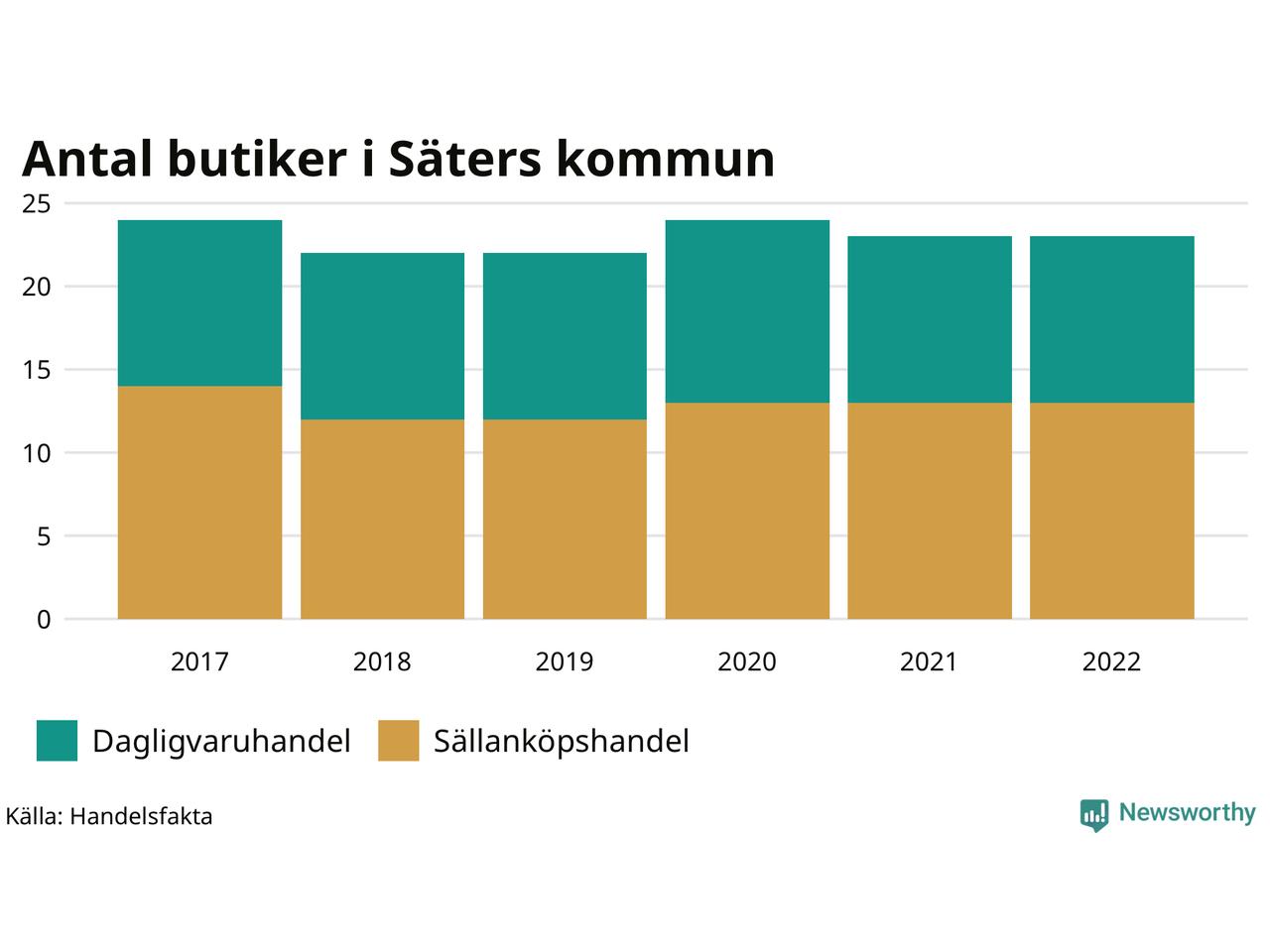 I Säter rör det sig om små tal. Den 30 november 2022 fanns 23 butiker i kommunen, vilket är lika många som året innan men en färre än 2017.
