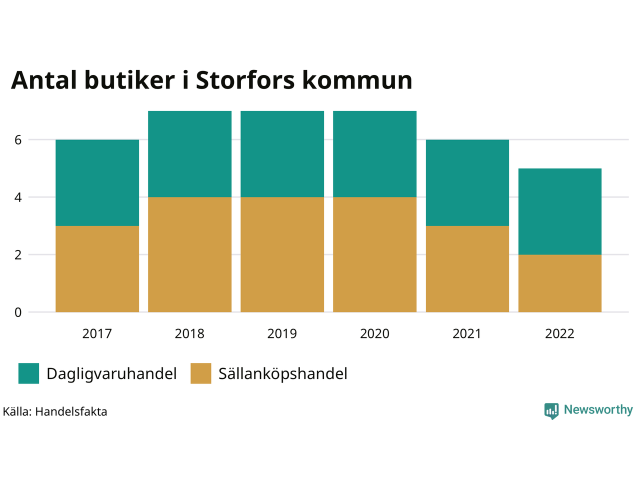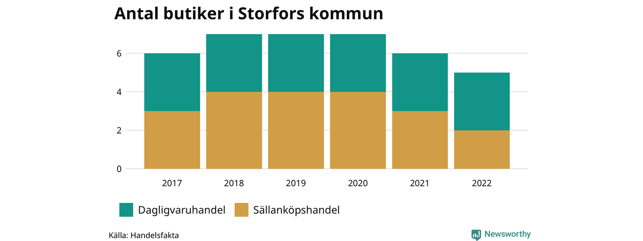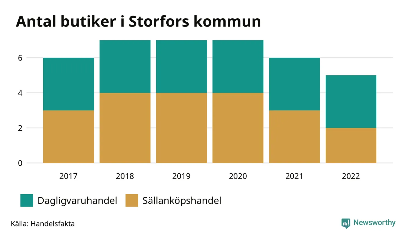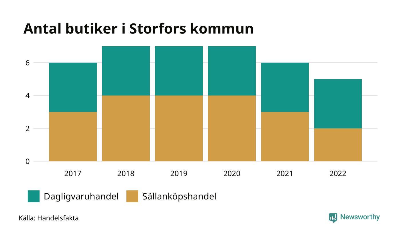 I Storfors rör det sig om små tal. Den 30 november 2022 fanns fem butiker i kommunen, vilket är en färre än året innan och en färre än 2017.