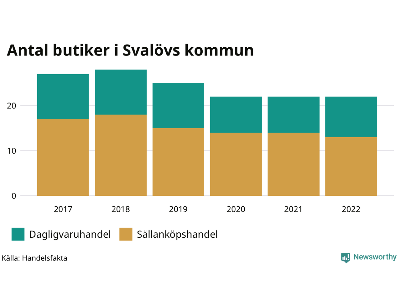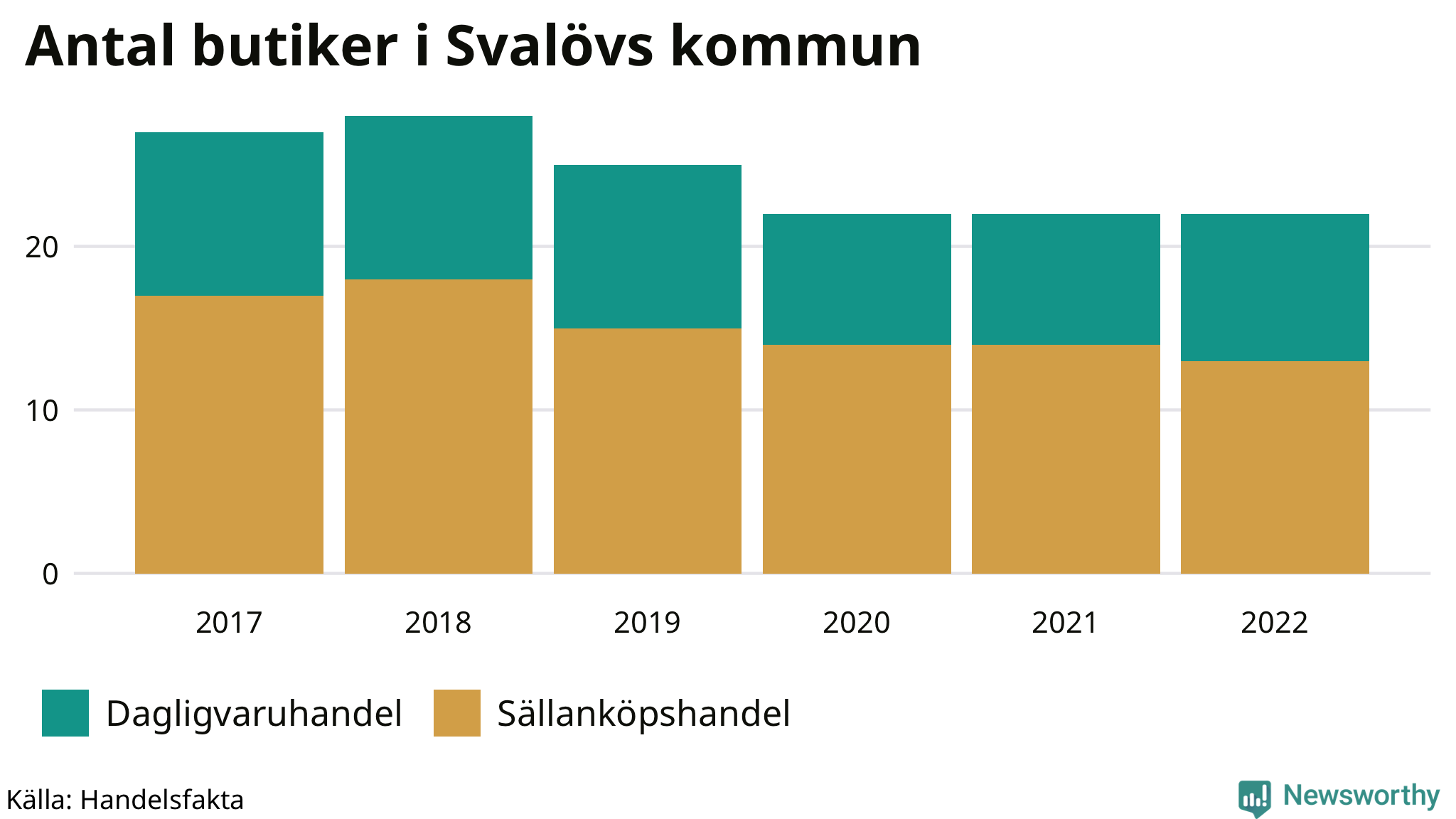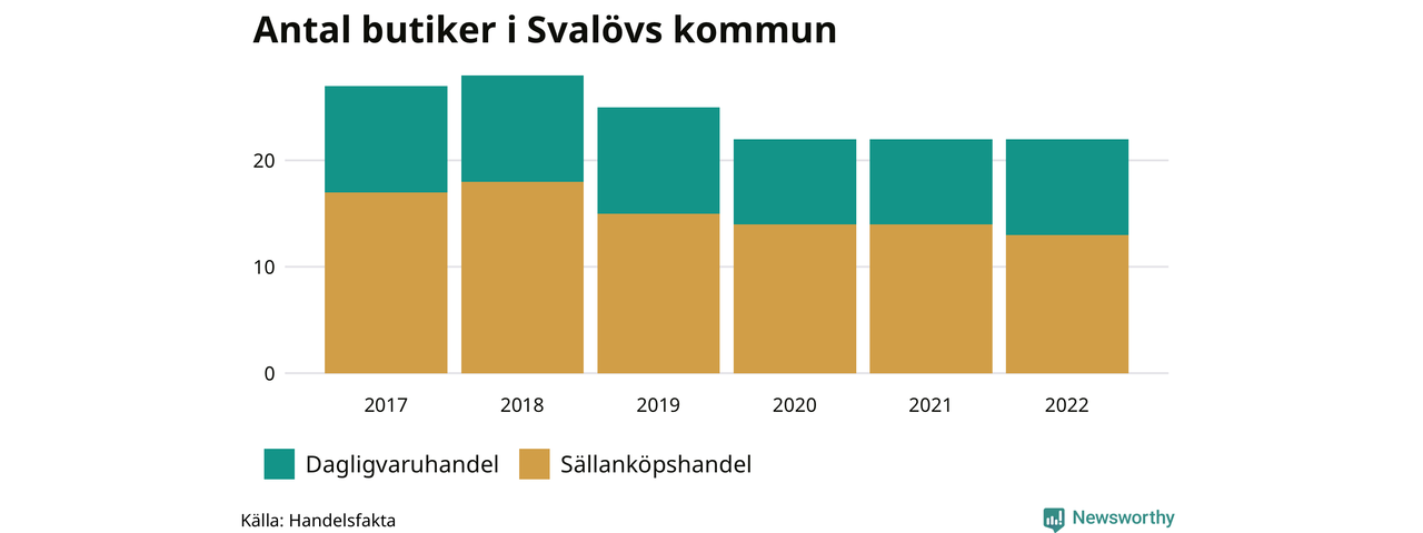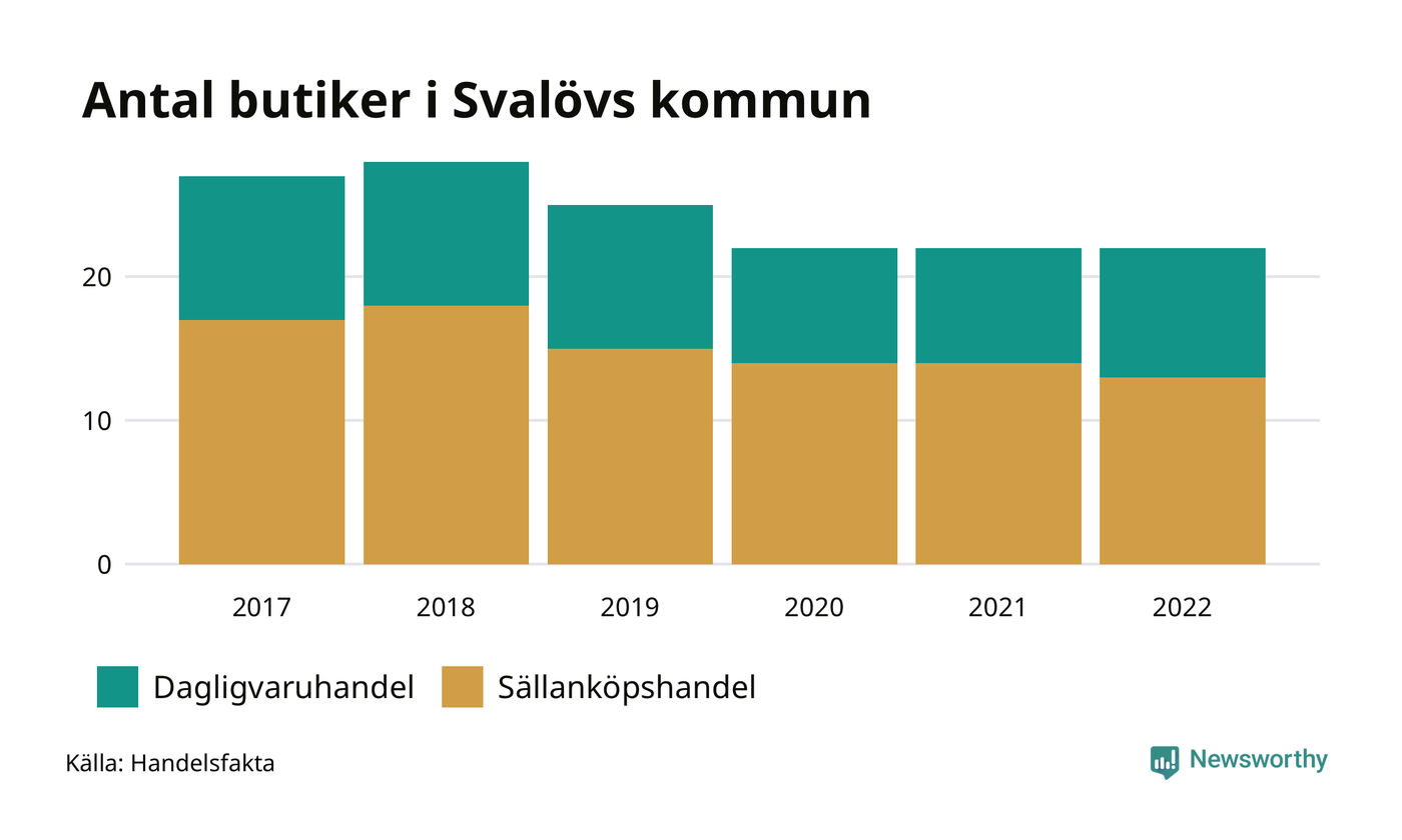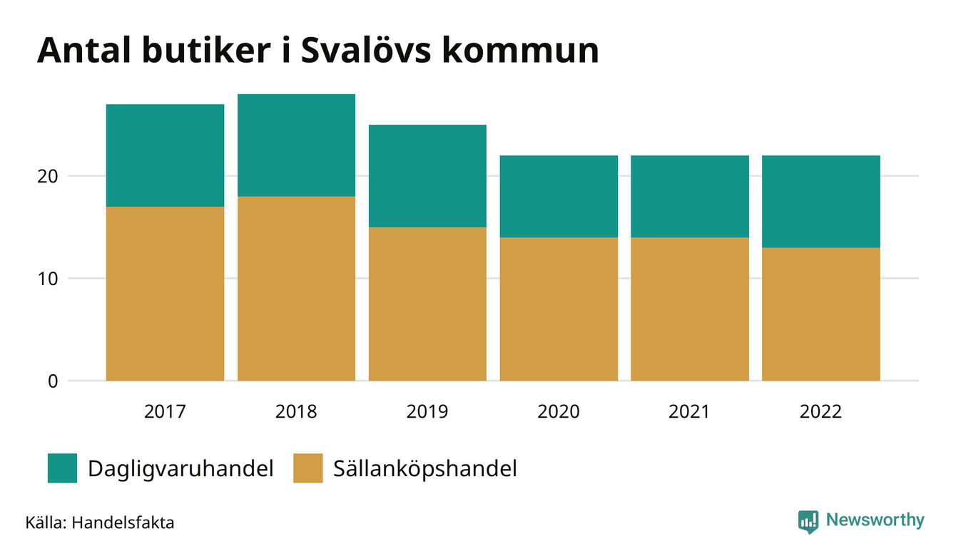 I Svalöv rör det sig om små tal. Den 30 november 2022 fanns 22 butiker i kommunen, vilket är lika många som året innan men fem färre än 2017.