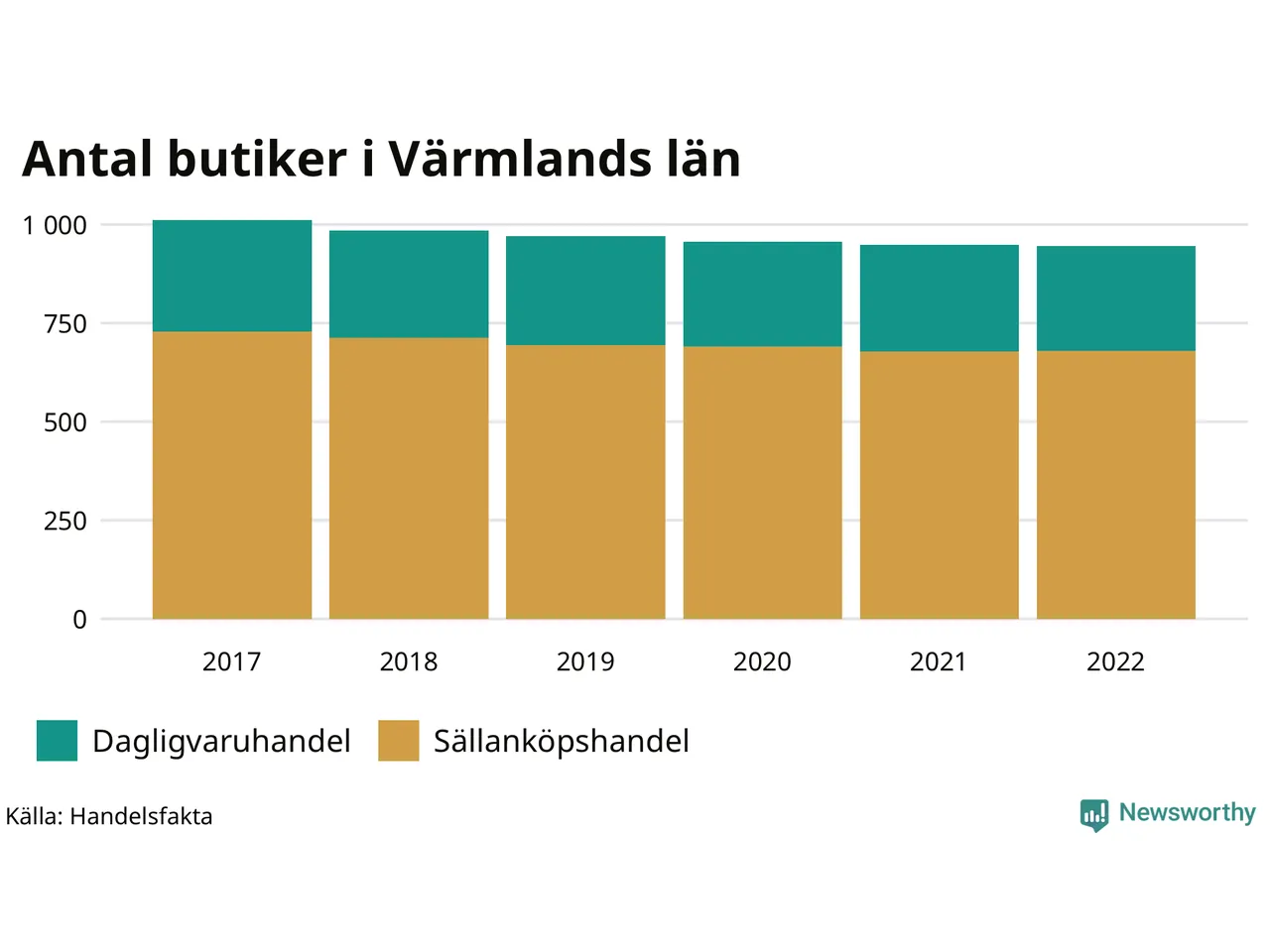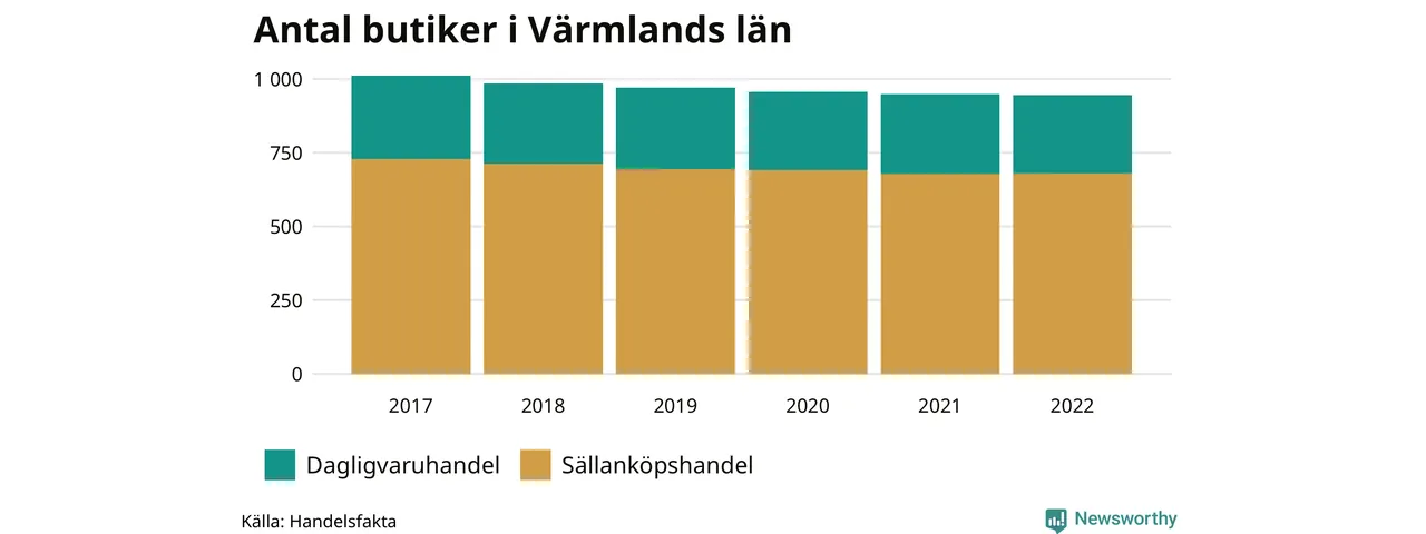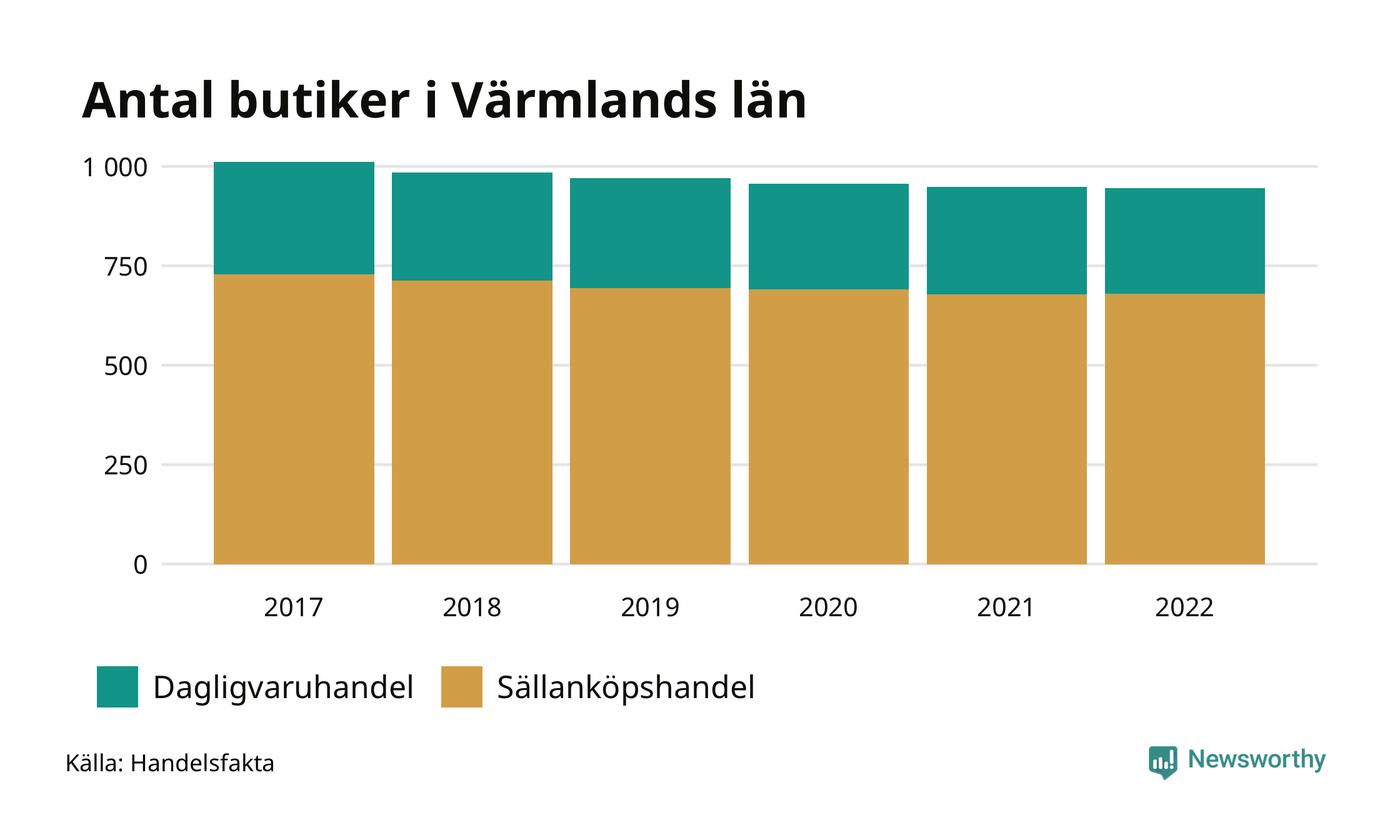Samma utveckling ses i Värmlands län. Den 30 november 2022 fanns 946 butiker i länet, vilket är tre färre än året innan och 66 färre än 2017.