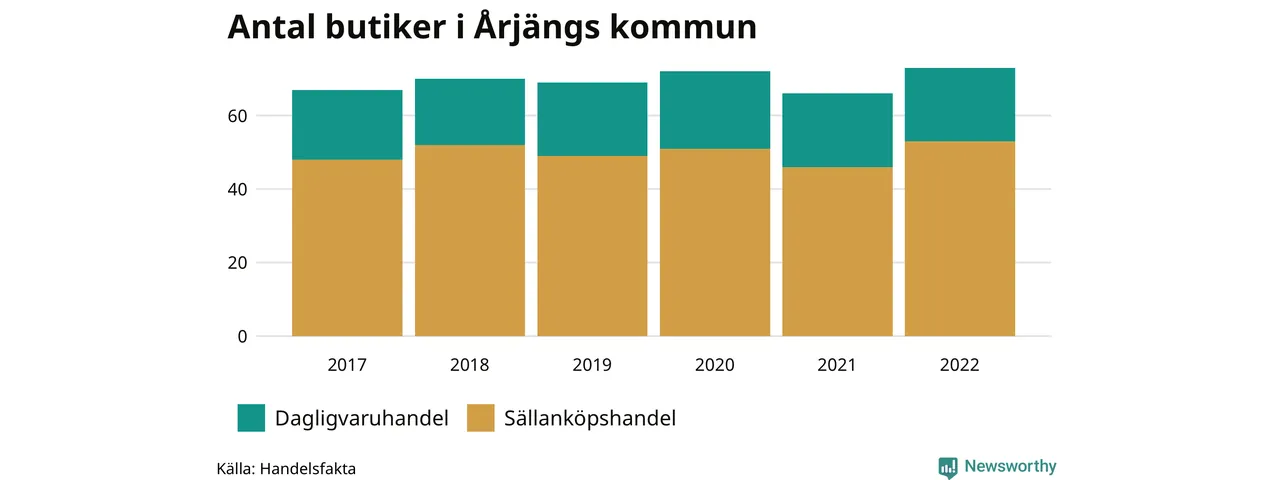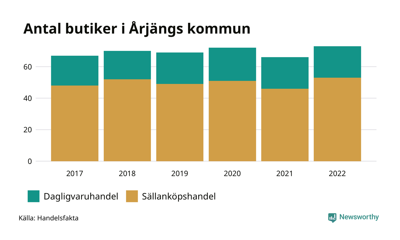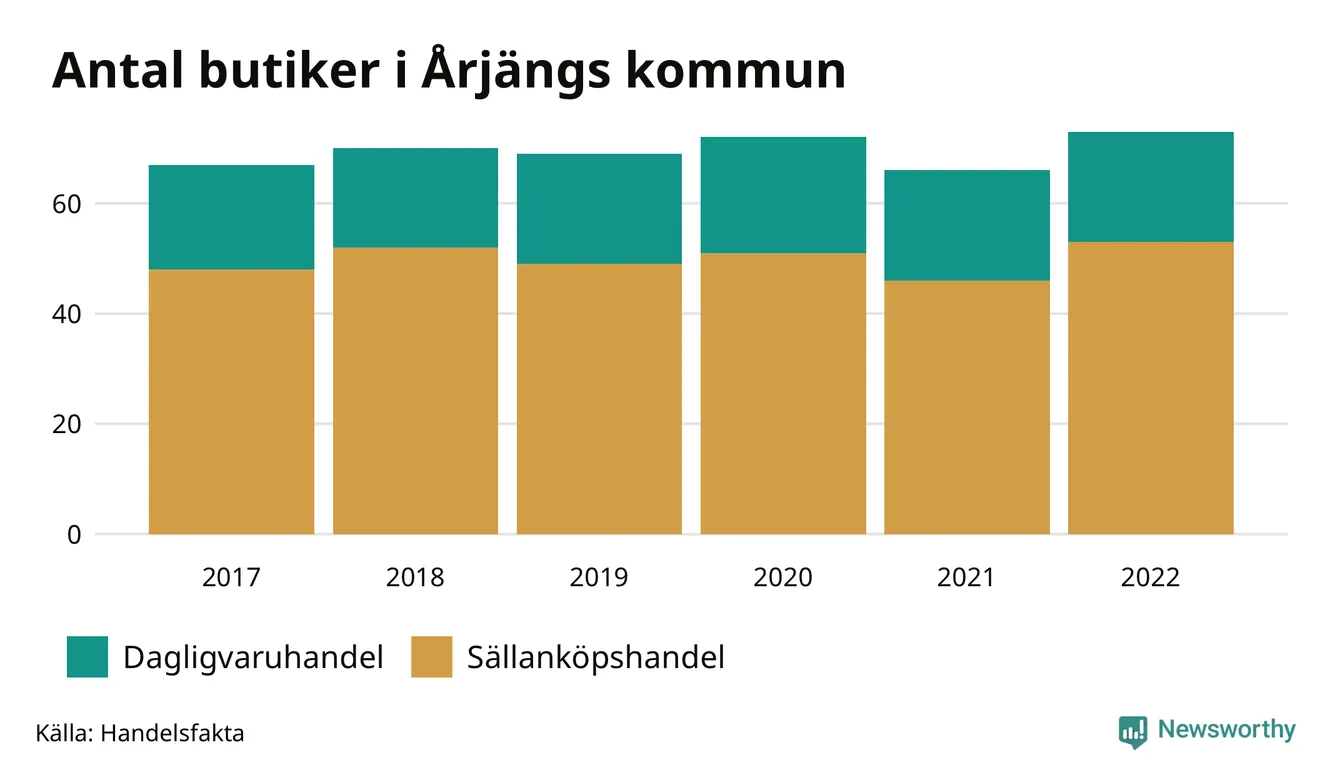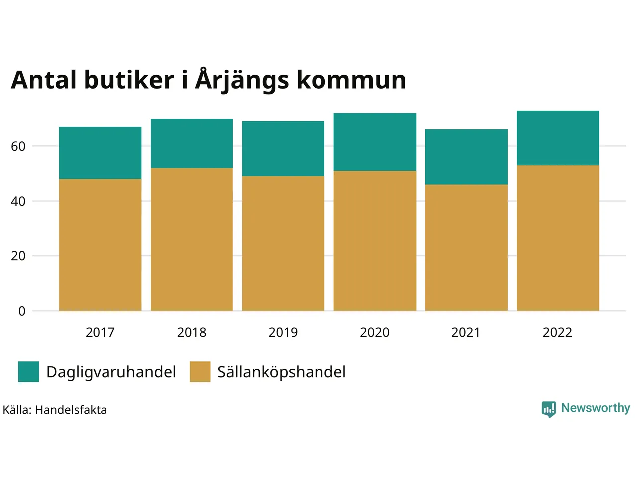 I Årjängs kommun har antalet butiker däremot ökat. Den 30 november 2022 fanns 73 butiker i kommunen, vilket är sju fler än året innan och sex fler än 2017.