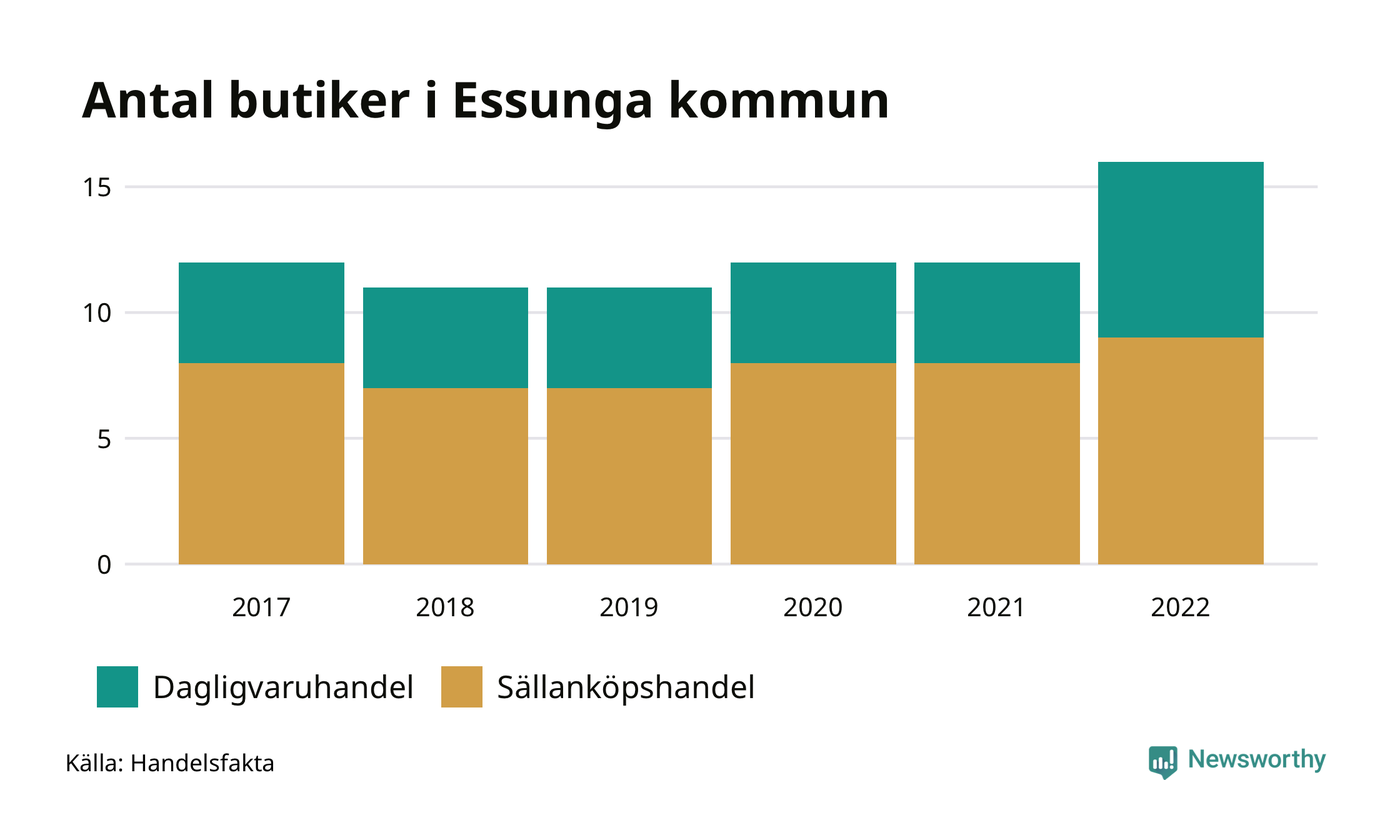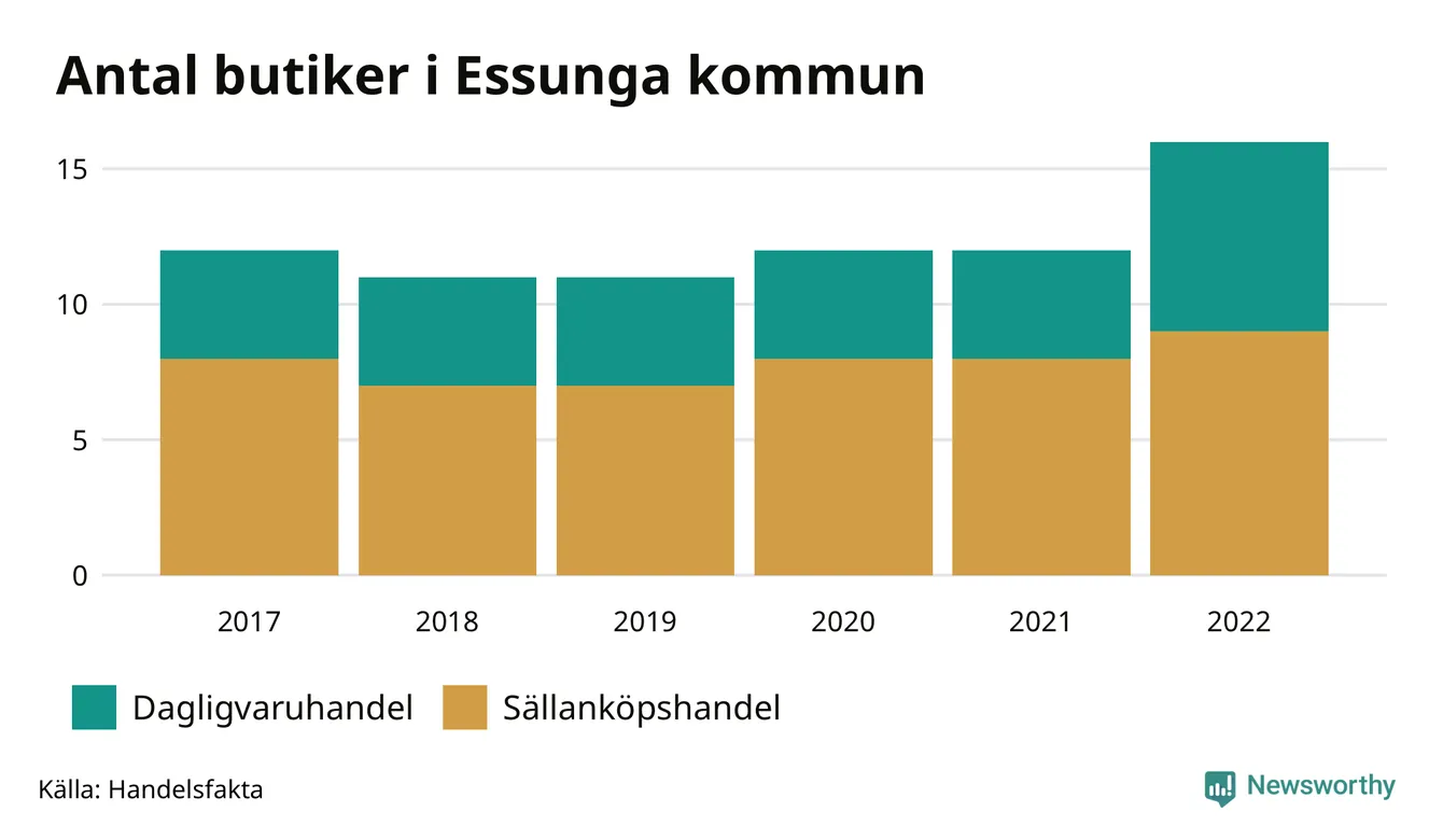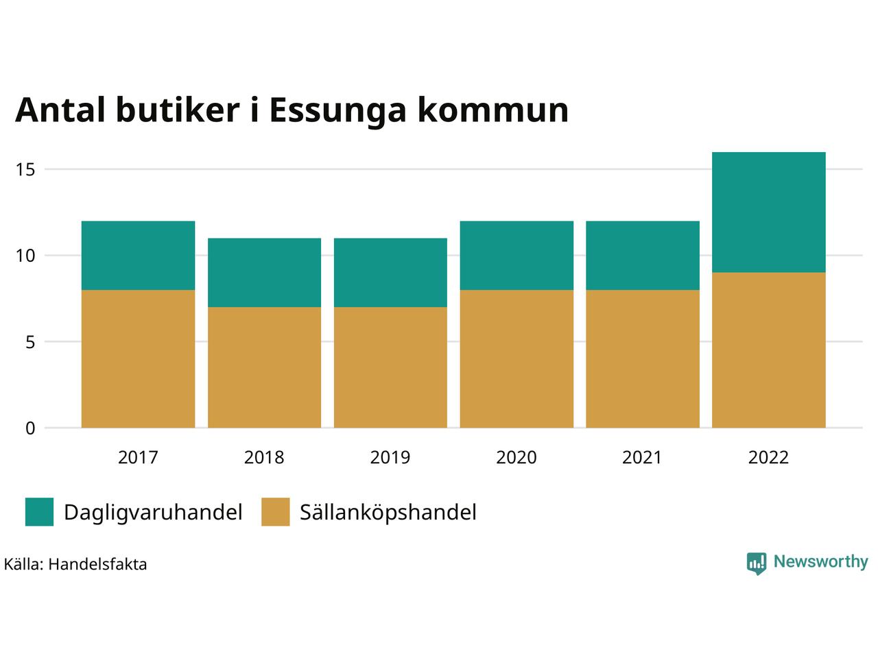 I Essunga rör det sig om små tal. Den 30 november 2022 fanns 16 butiker i kommunen, vilket är fyra fler än året innan och fyra fler än 2017.