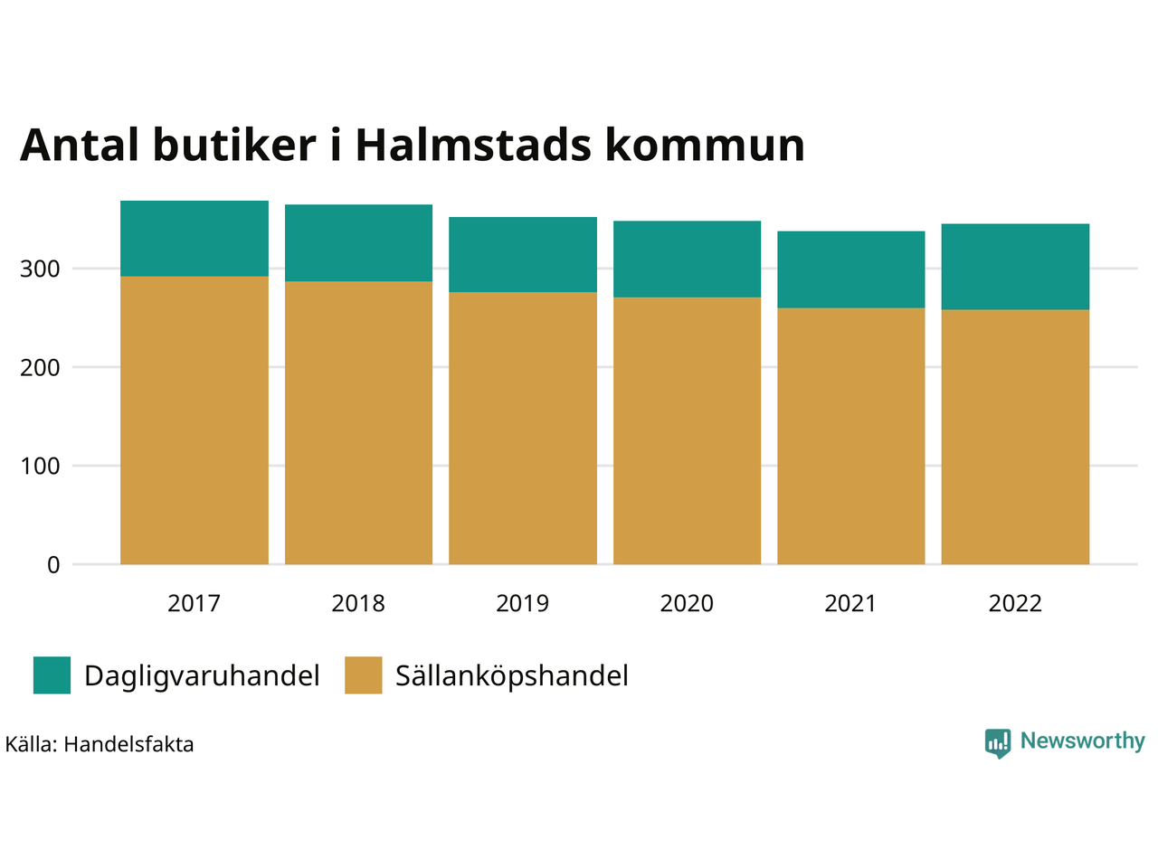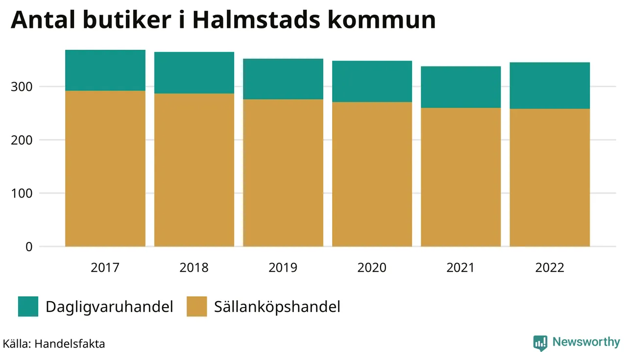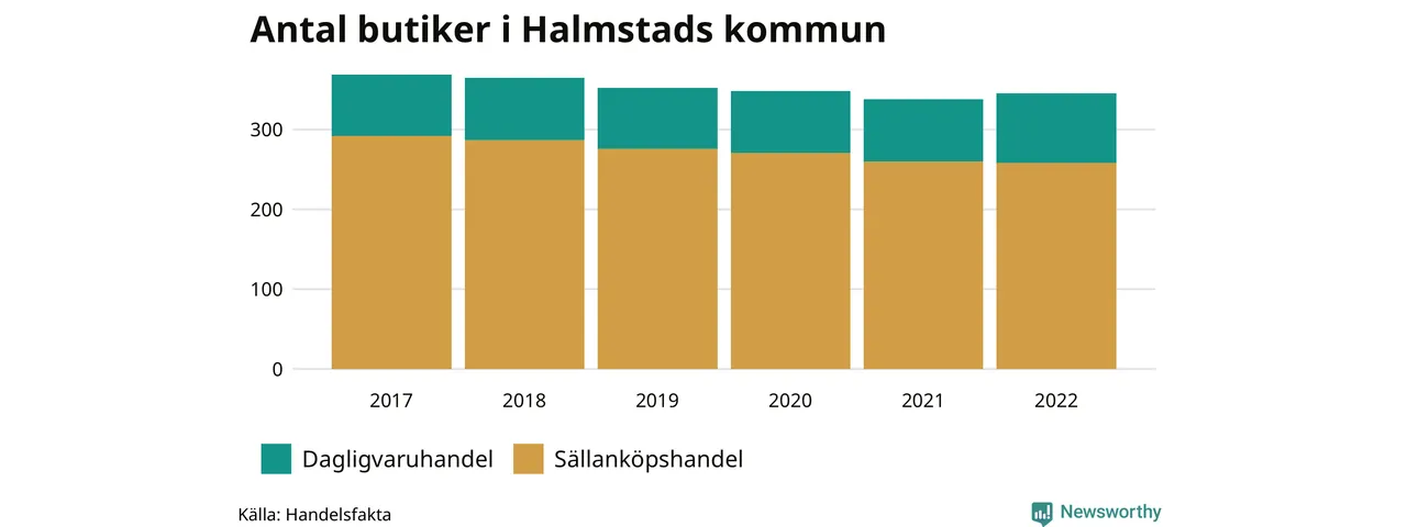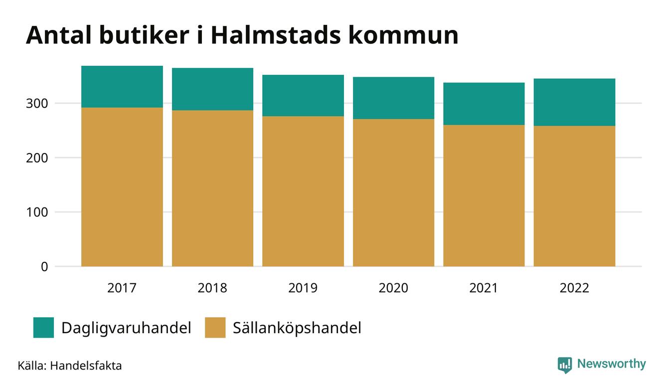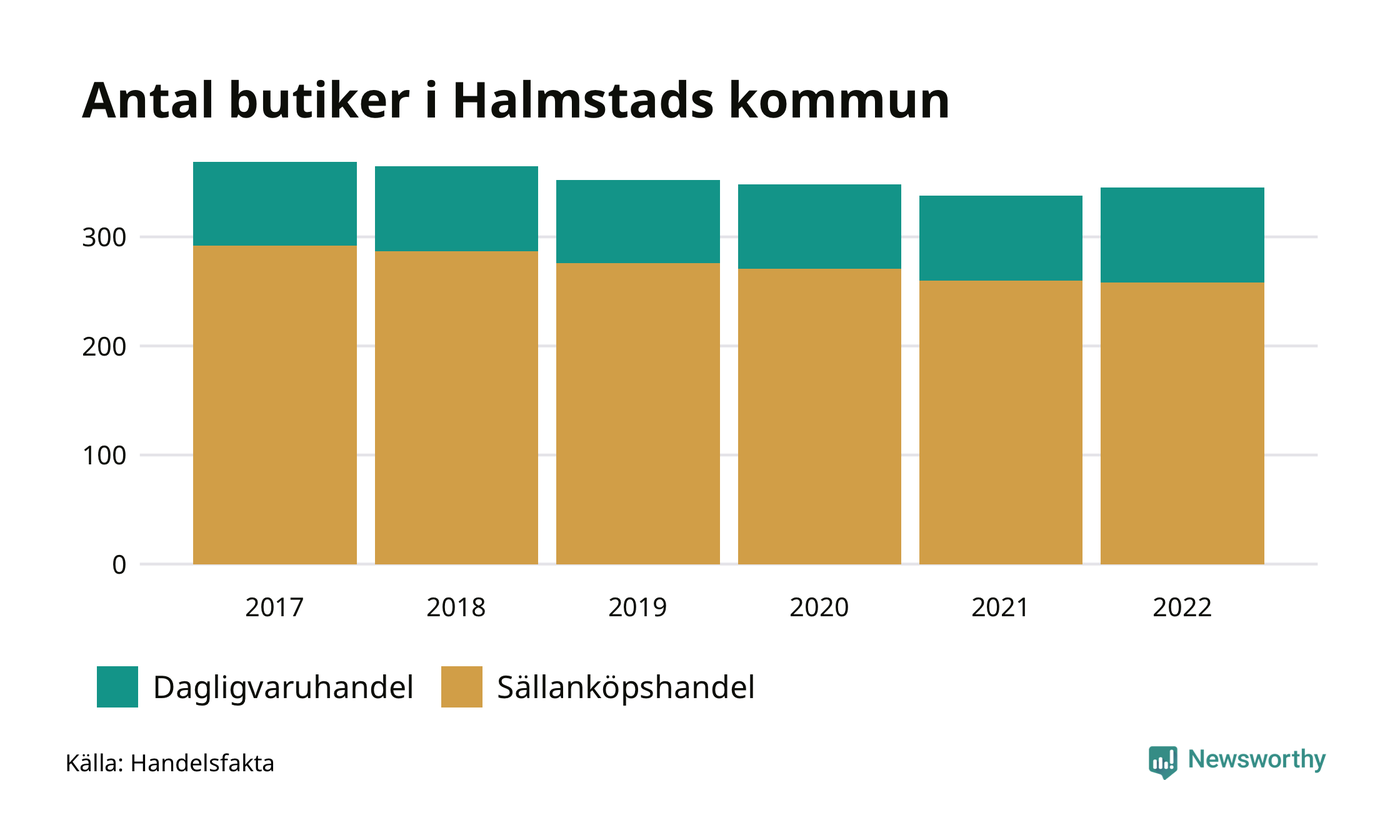 Av butikerna i Halmstad kategoriseras 87 som dagligvaruhandel, till exempel matbutiker. Det är tio fler än 2017. 258 butiker faller under kategorin sällanköp, till exempel kläd- och bygghandel, vilket är 34 färre än 2017.