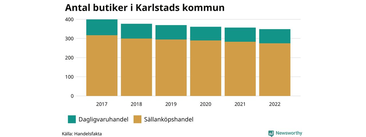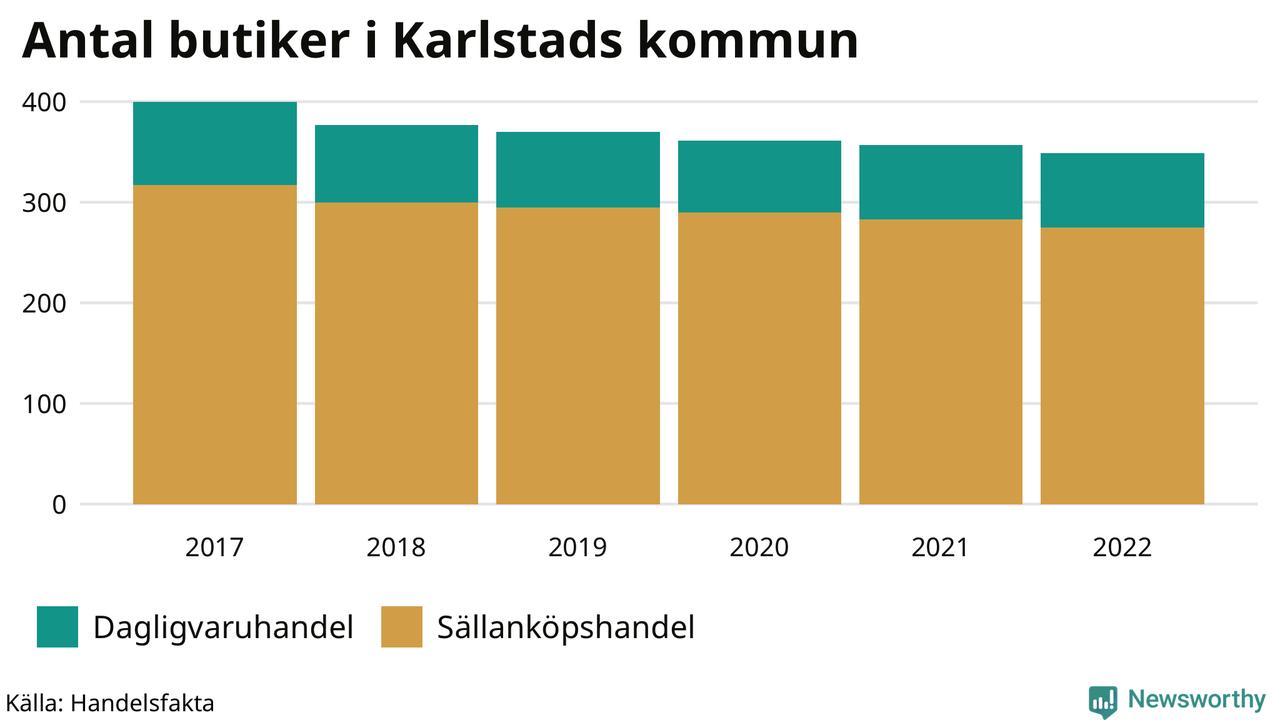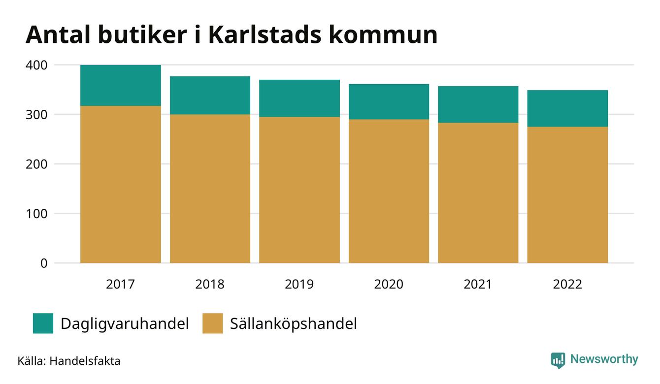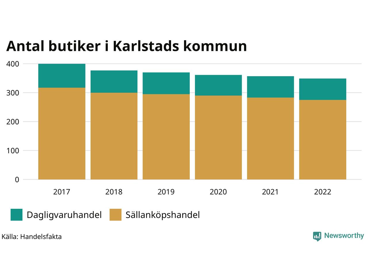I Karlstads kommun har utvecklingen gått ännu fortare. Här har var åttonde butik försvunnit. Den 30 november 2022 fanns 349 butiker i kommunen, vilket är åtta färre än året innan och 51 färre än 2017.