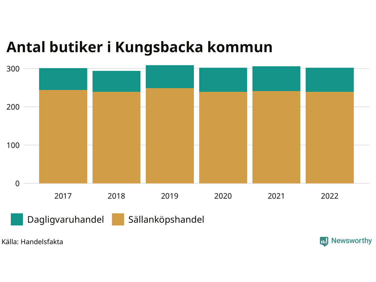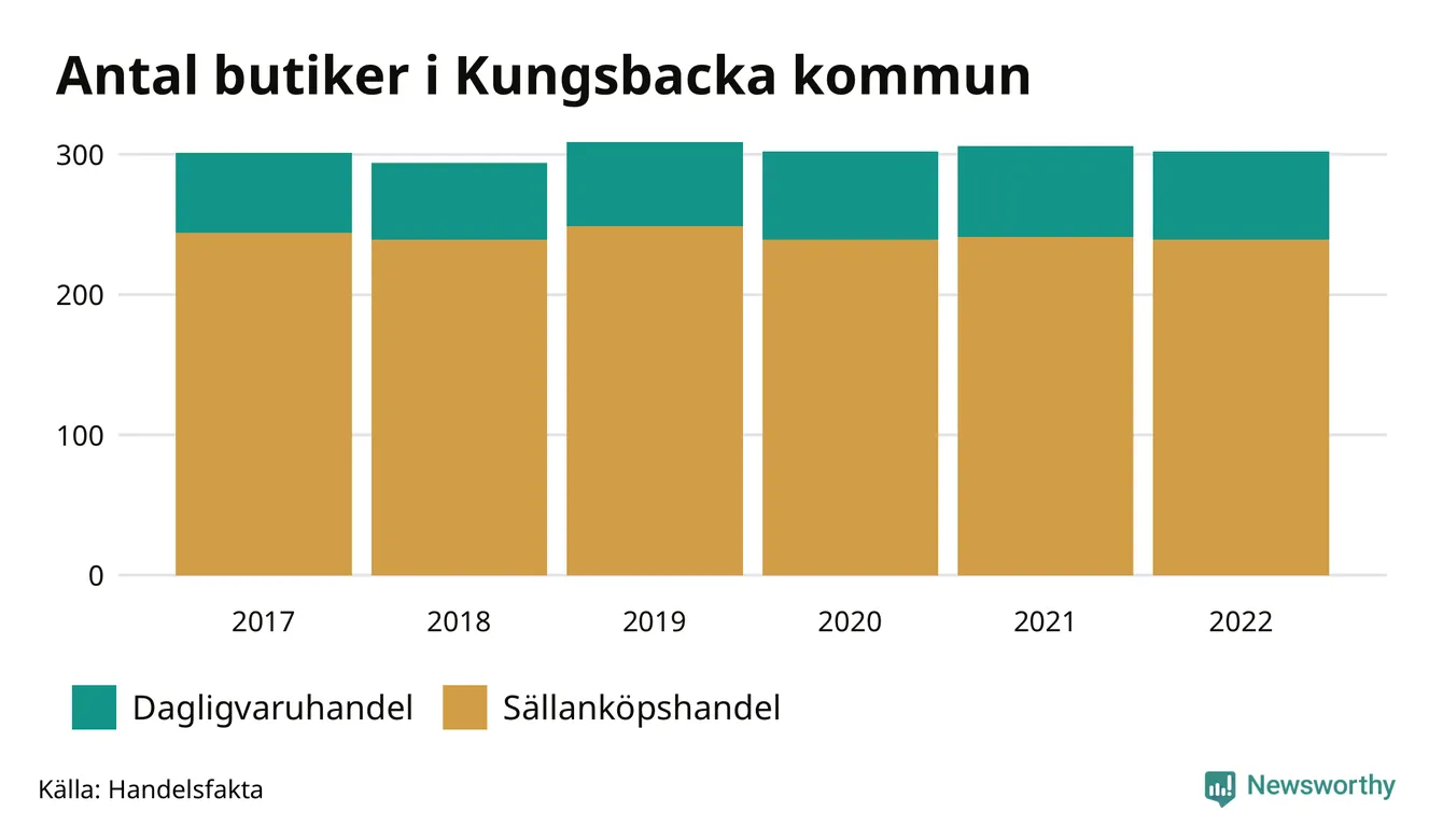 Av butikerna i Kungsbacka kategoriseras 62 som dagligvaruhandel, till exempel matbutiker. Det är sex fler än 2017. 239 butiker faller under kategorin sällanköp, till exempel kläd- och bygghandel, vilket är fem färre än 2017.