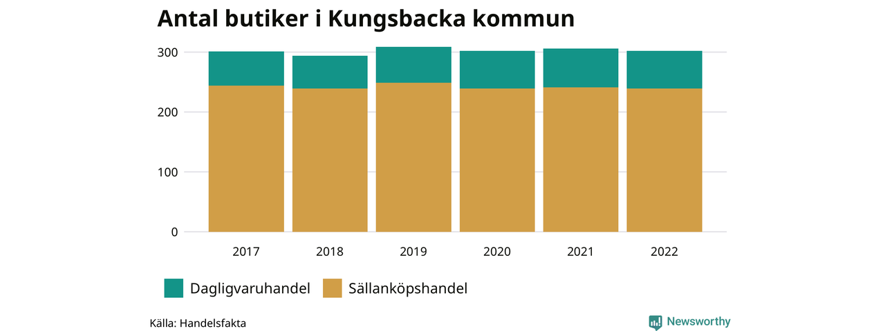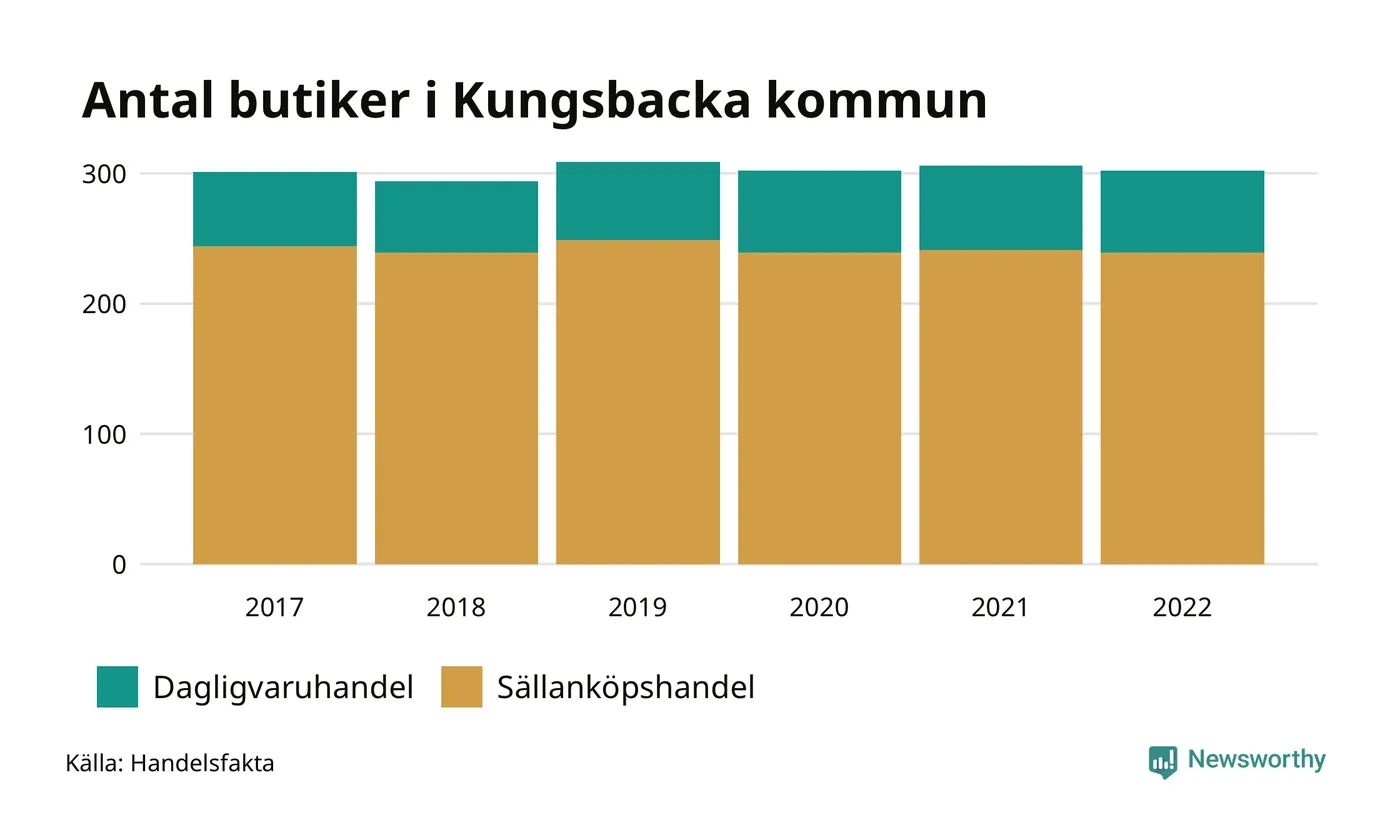 I Kungsbacka kommun har förändringarna varit relativt små. Den 30 november 2022 fanns 302 butiker i kommunen, vilket är fyra färre än året innan men en fler än 2017.