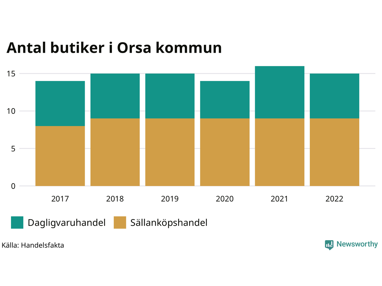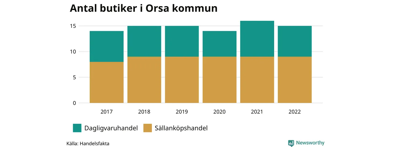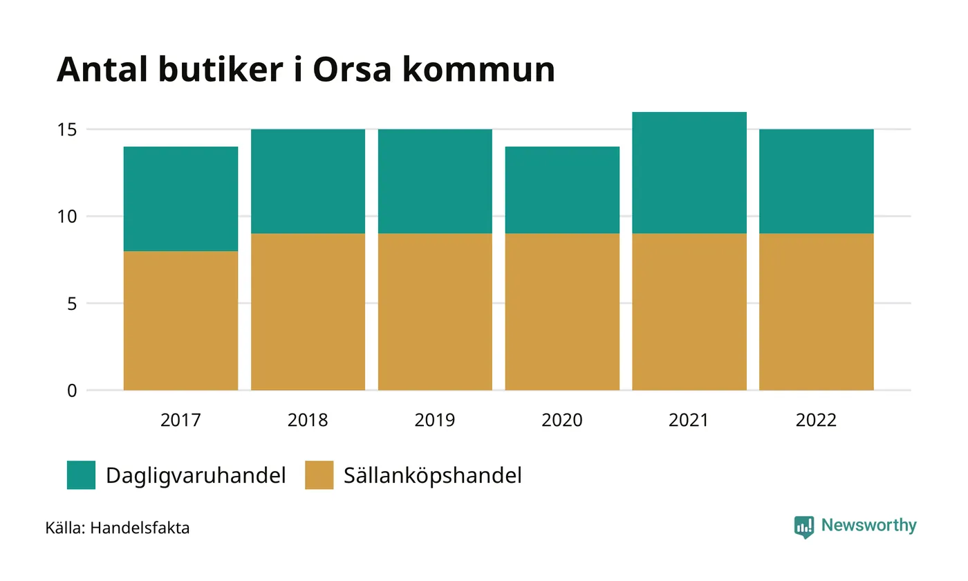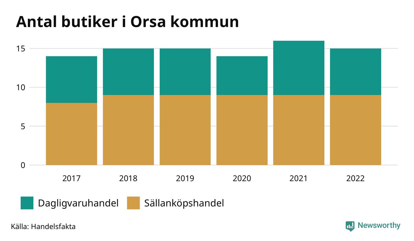 I Orsa rör det sig om små tal. Den 30 november 2022 fanns 15 butiker i kommunen, vilket är en färre än året innan men en fler än 2017.