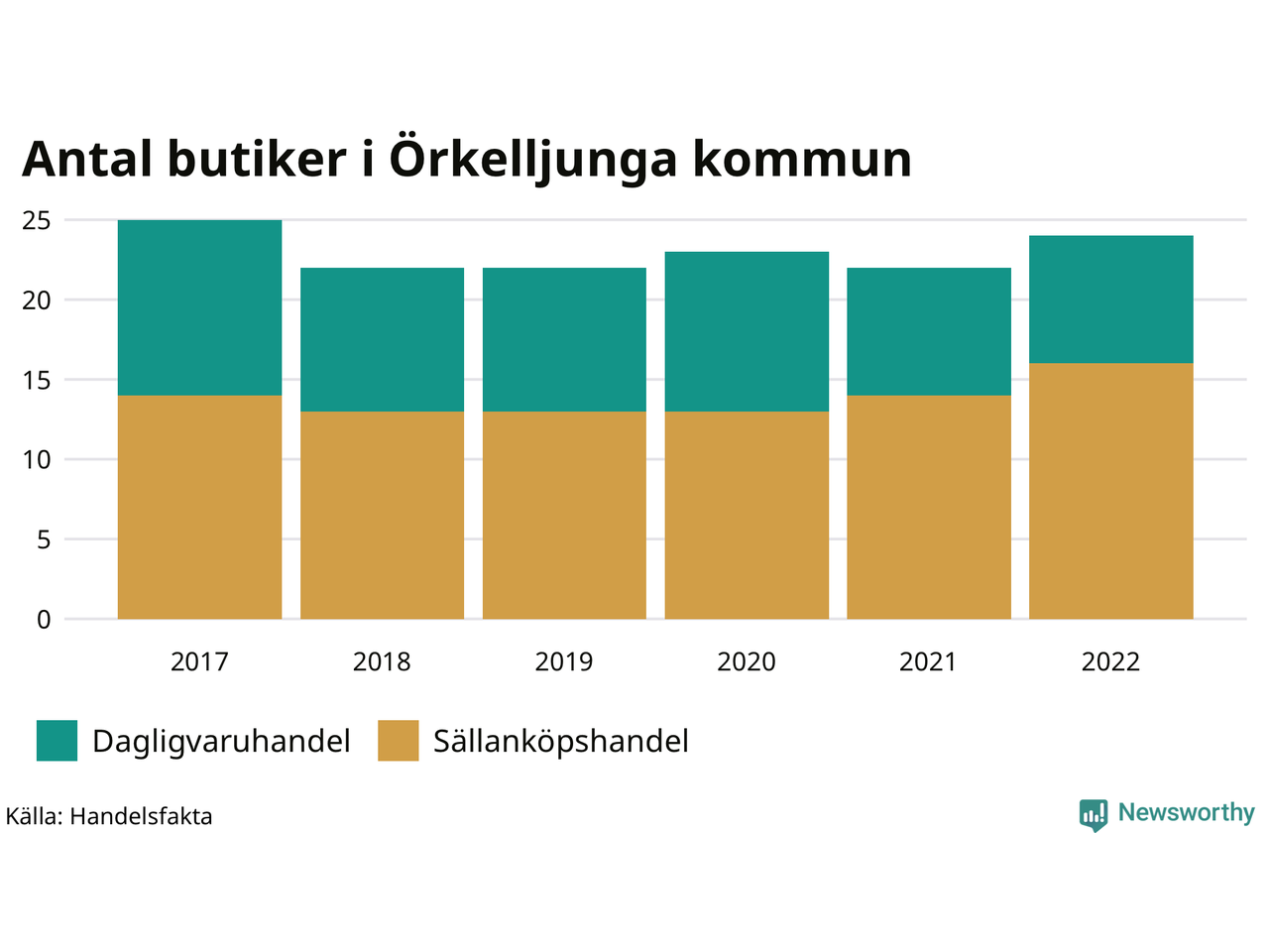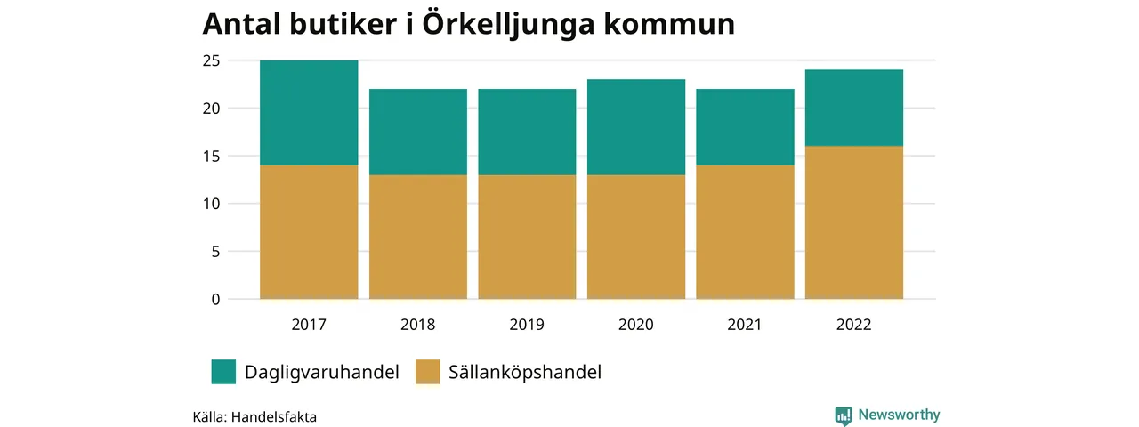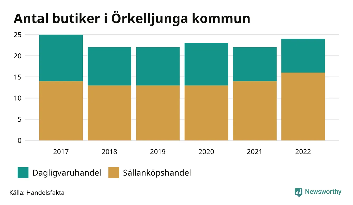 Butikerna blir allt färre i landet, sedan 2017 har antalet minskat med 7 procent. I Örkelljunga kommun fanns 24 butiker 2022 – jämfört med 25 stycken fem år tidigare.