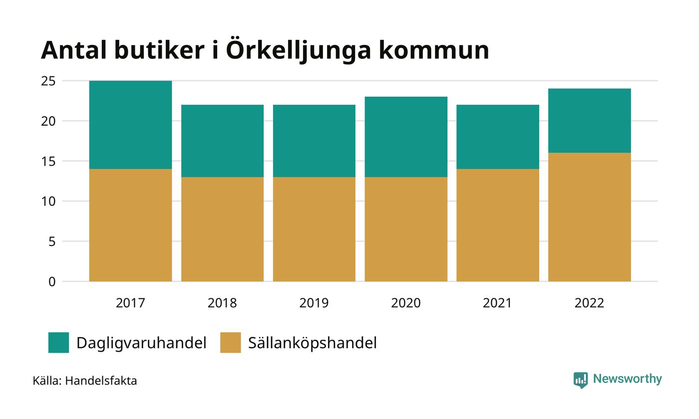 I Örkelljunga rör det sig om små tal. Den 30 november 2022 fanns 24 butiker i kommunen, vilket är två fler än året innan men en färre än 2017.
