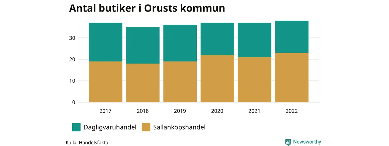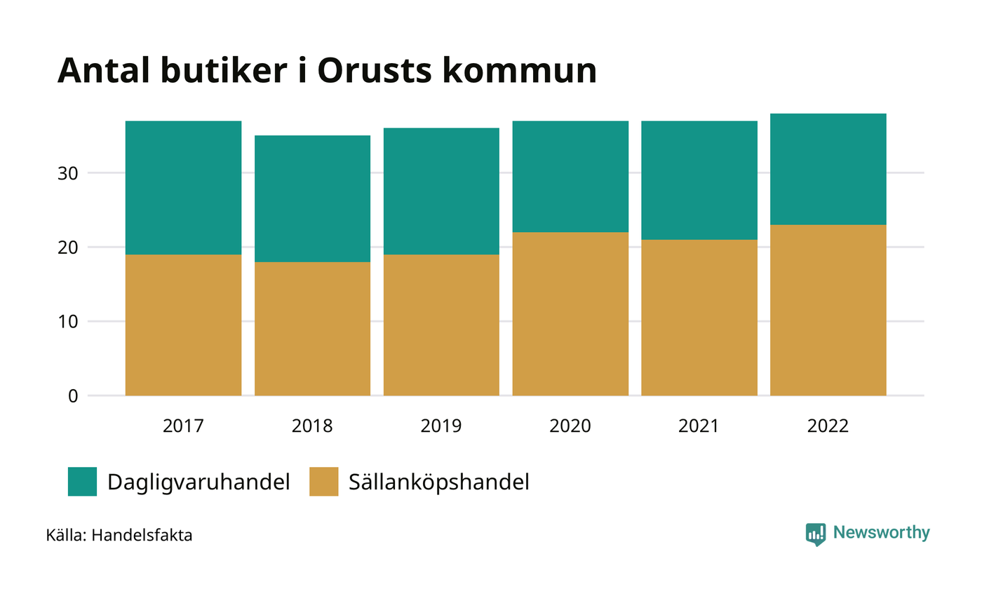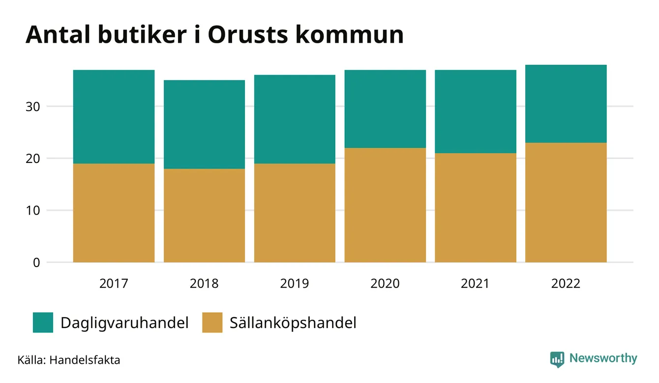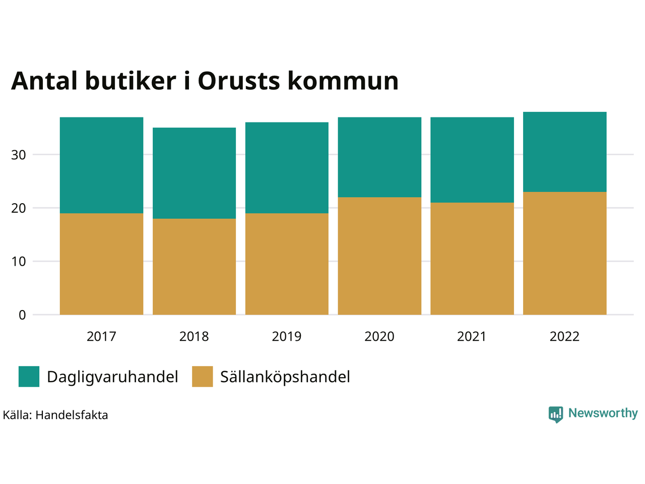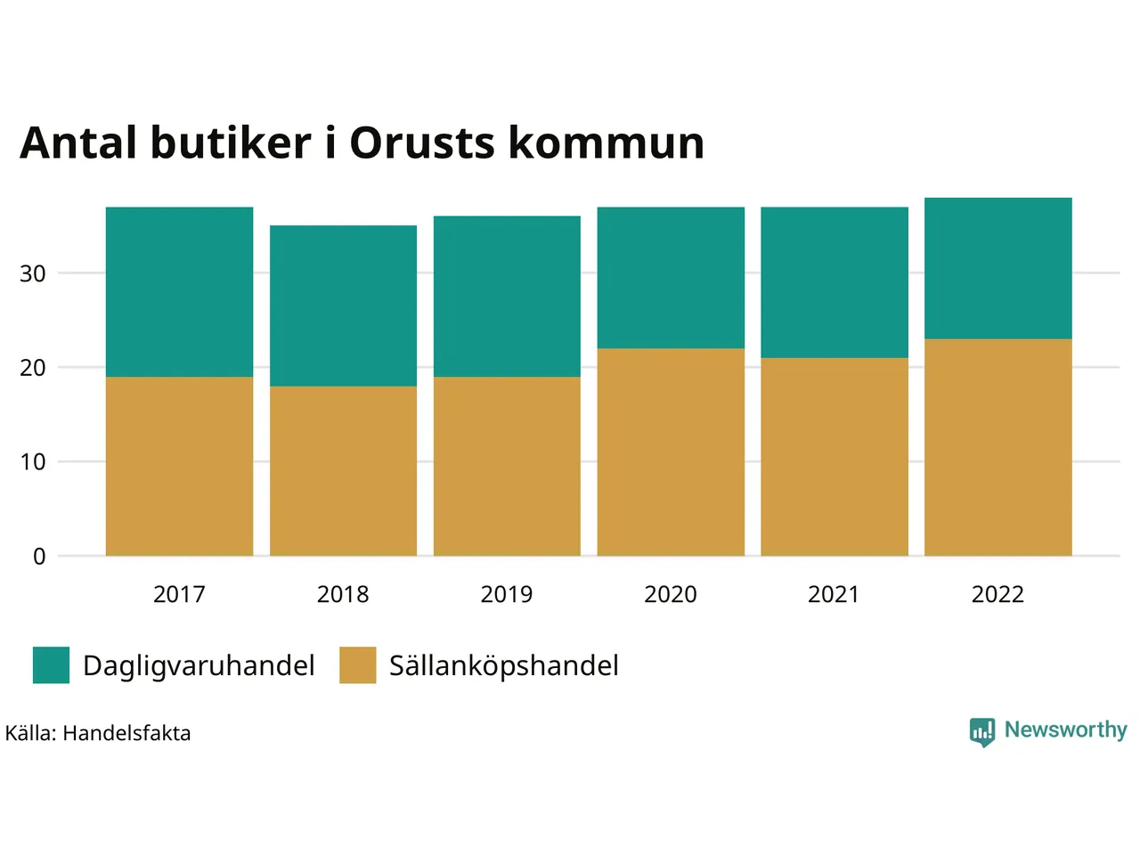 I Orusts kommun har förändringarna varit relativt små. Den 30 november 2022 fanns 38 butiker i kommunen, vilket är en fler än året innan och en fler än 2017.