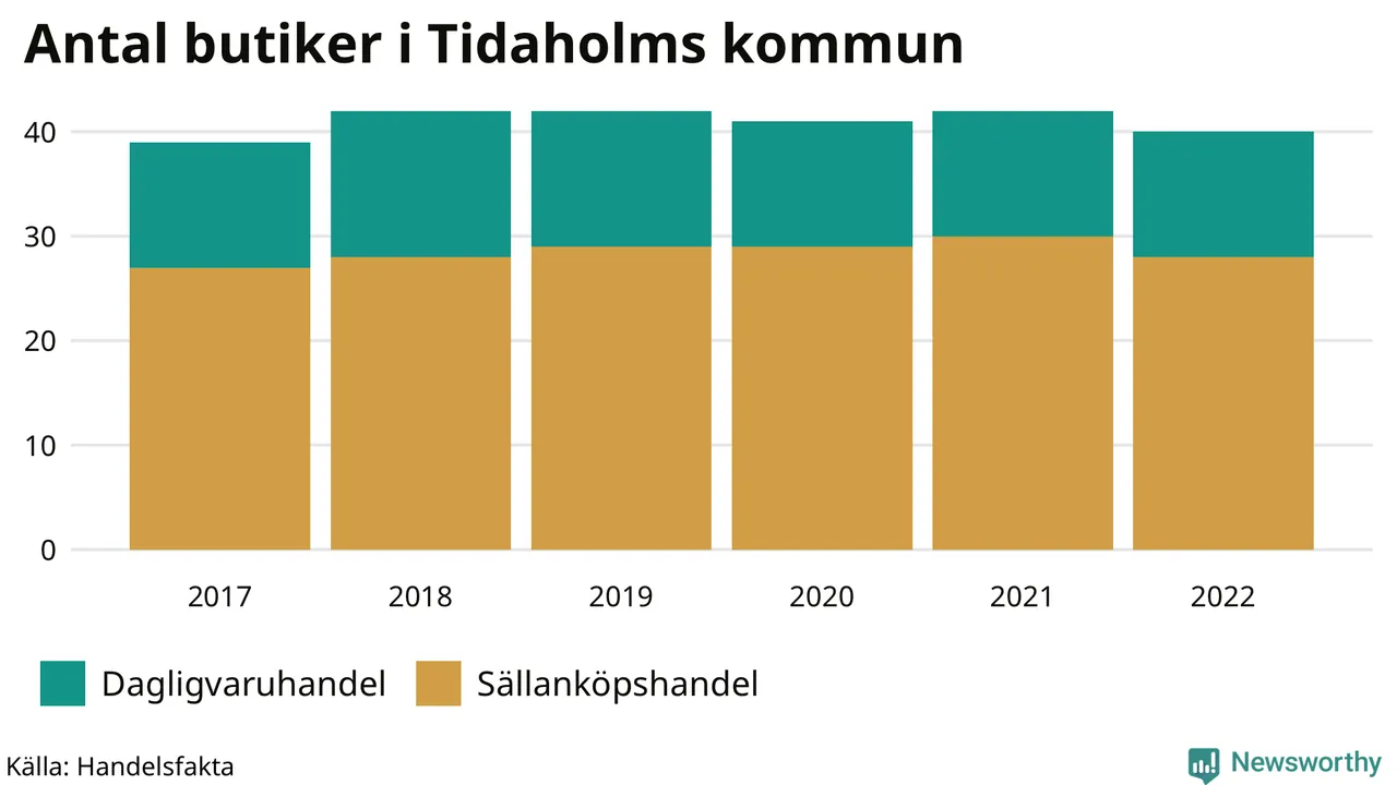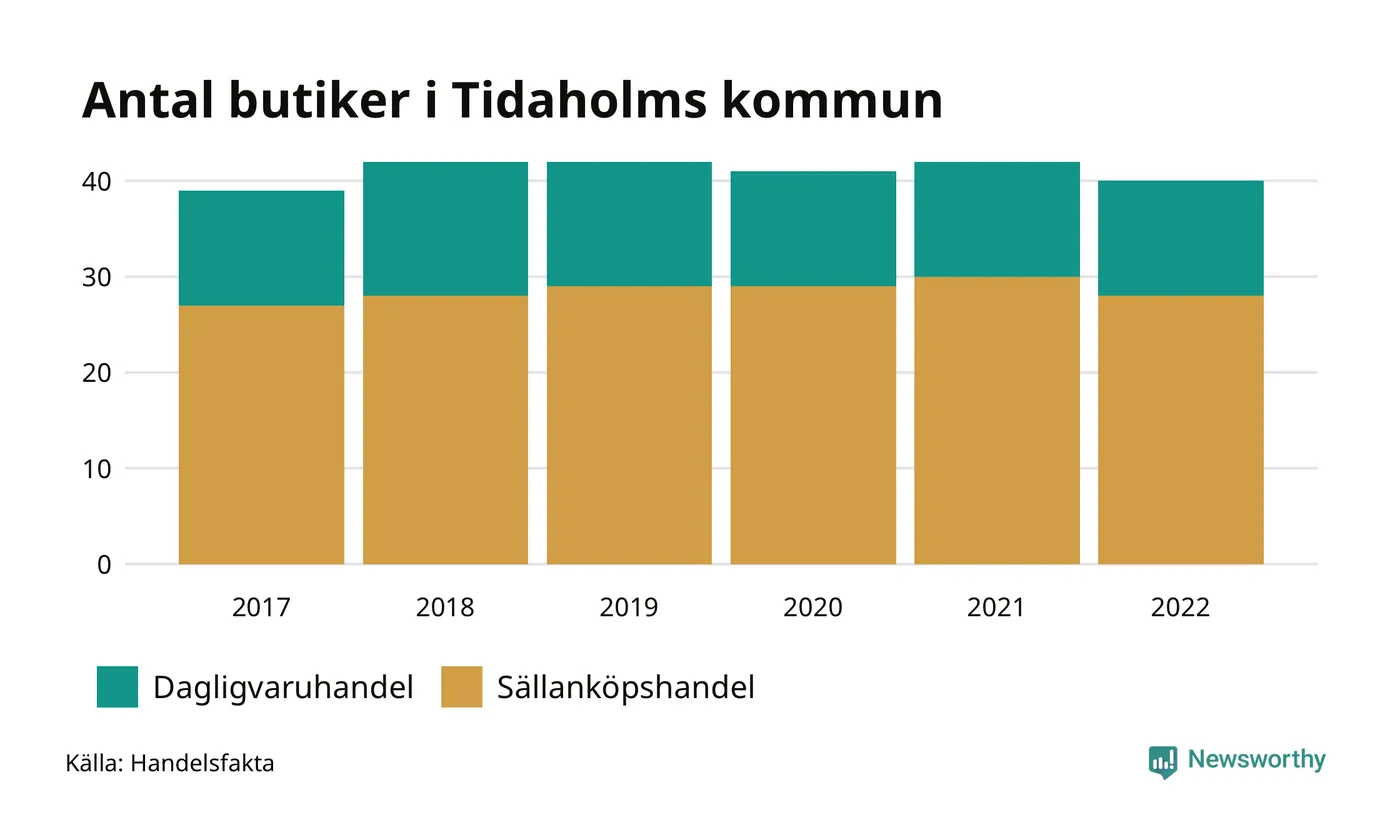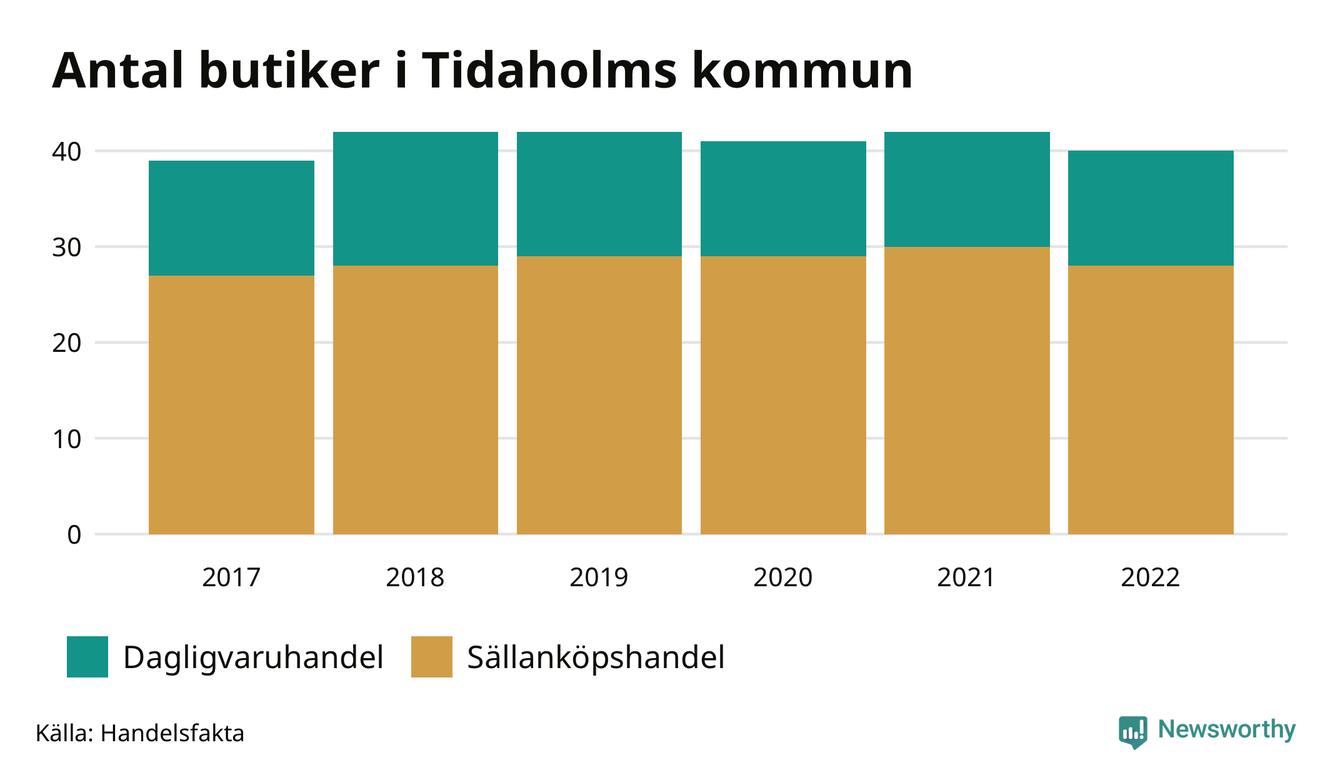 I Tidaholms kommun har förändringarna varit relativt små. Den 30 november 2022 fanns 40 butiker i kommunen, vilket är två färre än året innan men en fler än 2017.