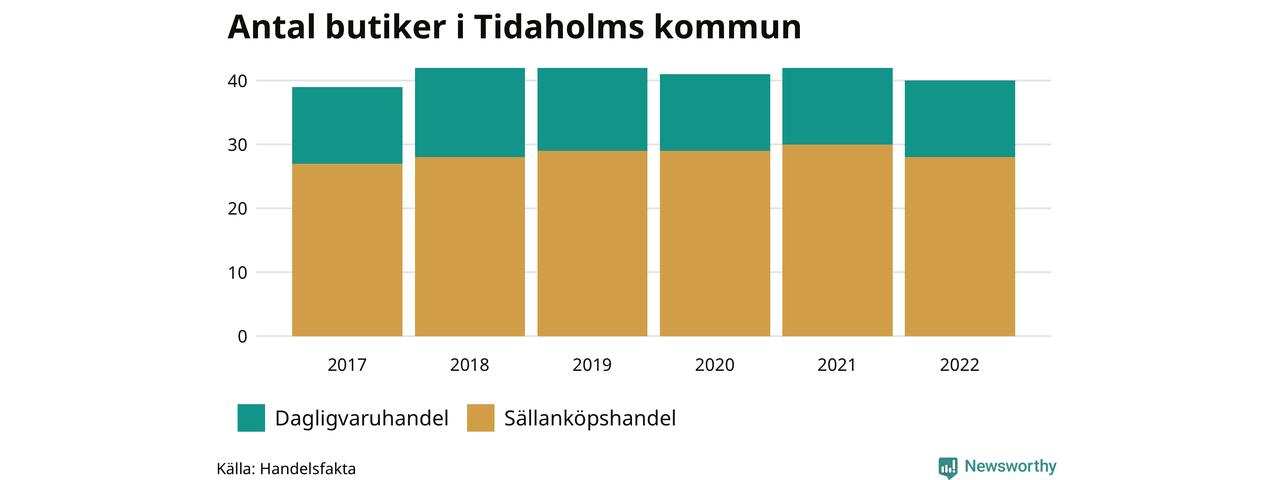 Av butikerna i Tidaholm kategoriseras tolv som dagligvaruhandel, till exempel matbutiker. Det är lika många som 2017. 28 butiker faller under kategorin sällanköp, till exempel kläd- och bygghandel, vilket är en fler än 2017.