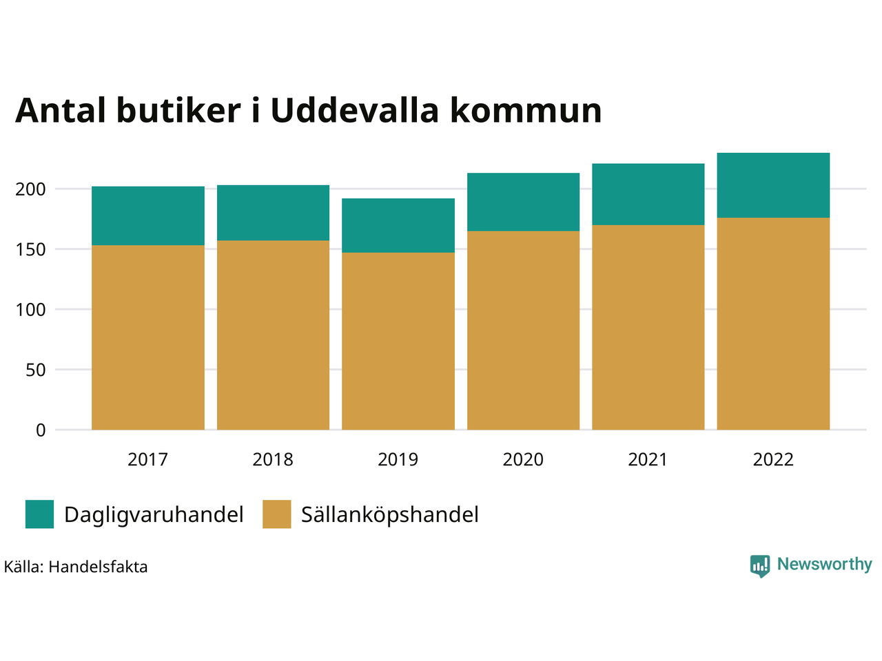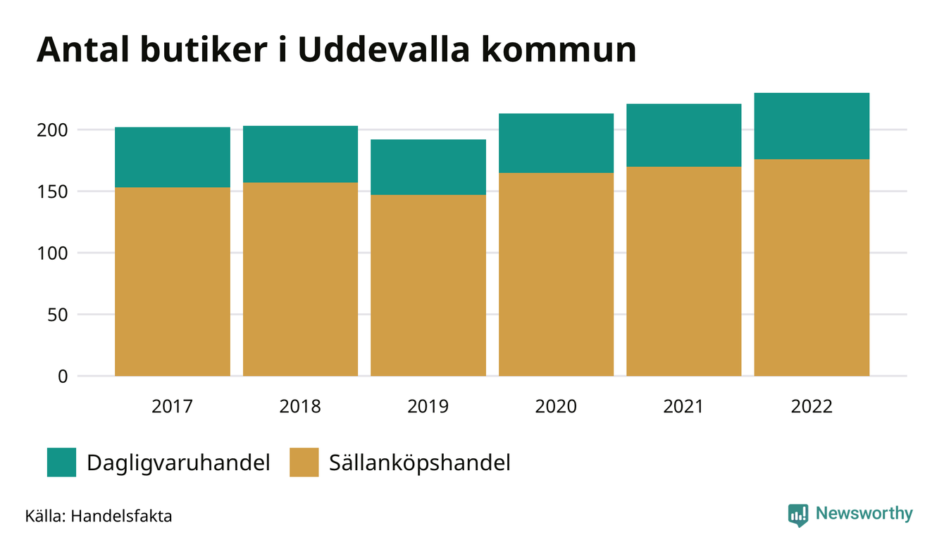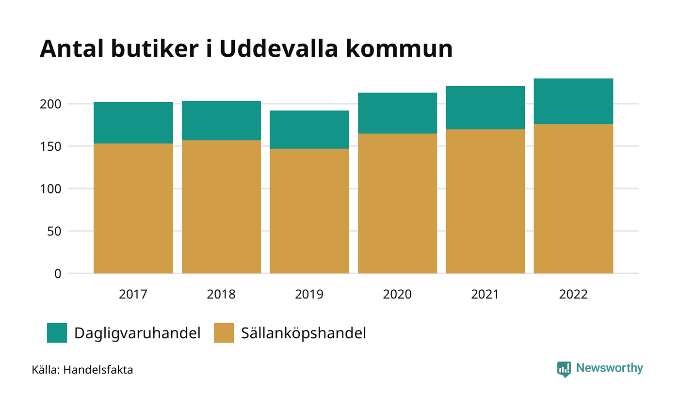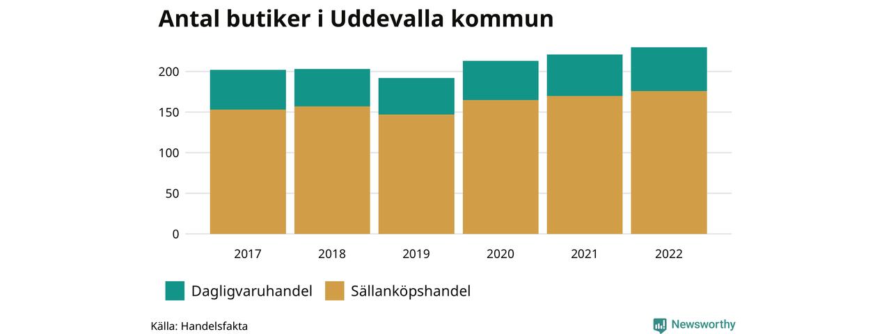 I Uddevalla kommun har antalet butiker däremot ökat. Den 30 november 2022 fanns 230 butiker i kommunen, vilket är nio fler än året innan och 28 fler än 2017.