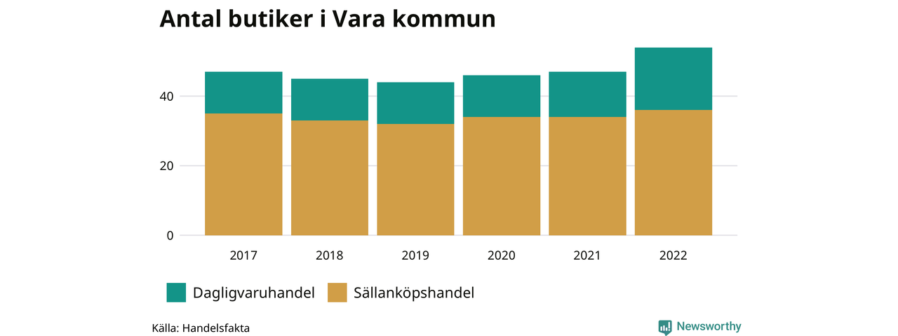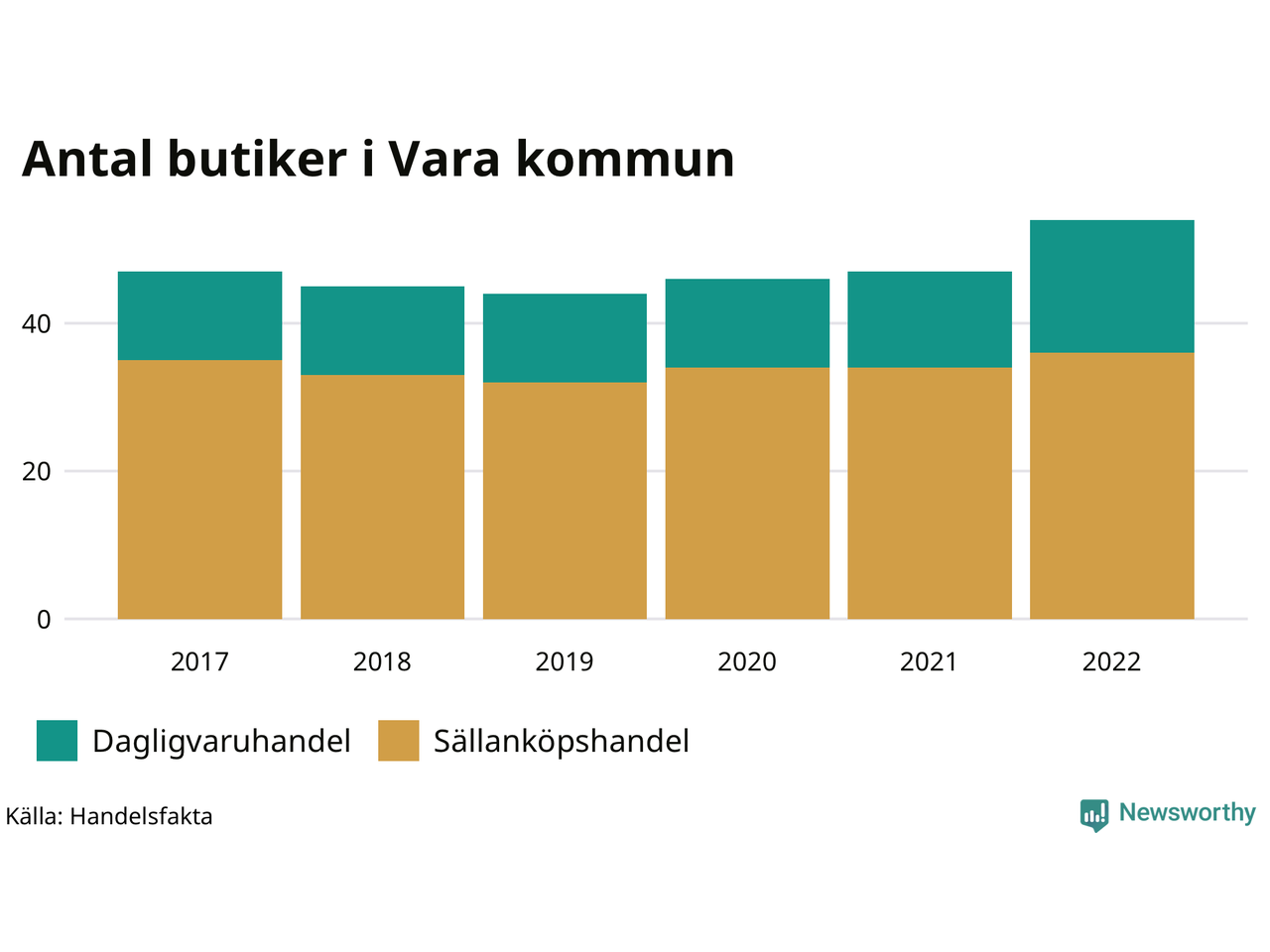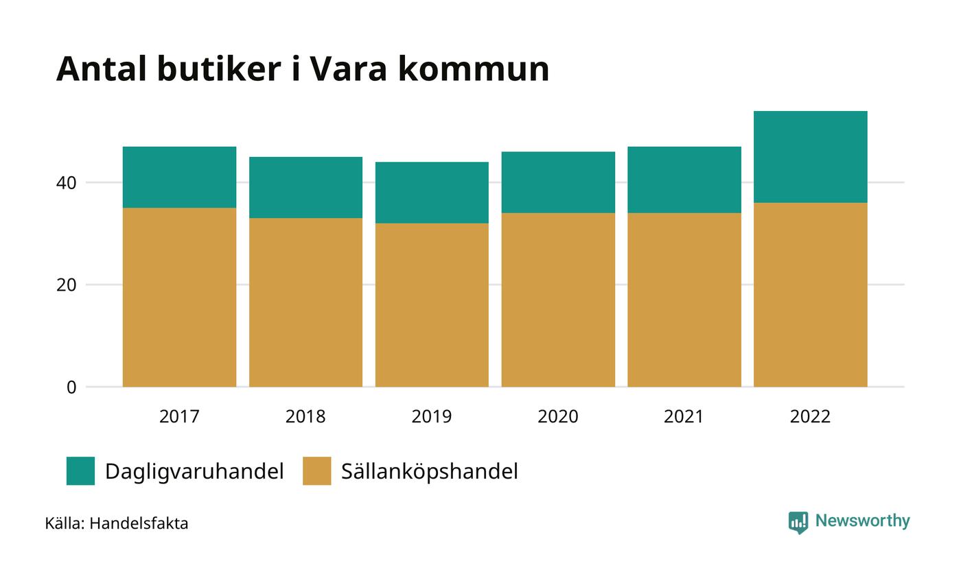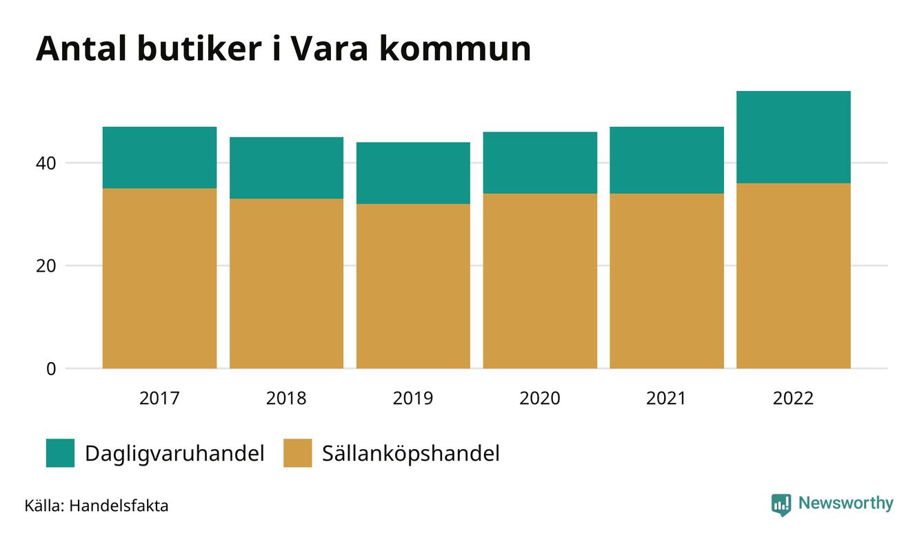 I Vara kommun har antalet butiker däremot ökat. Den 30 november 2022 fanns 54 butiker i kommunen, vilket är sju fler än året innan och sju fler än 2017.