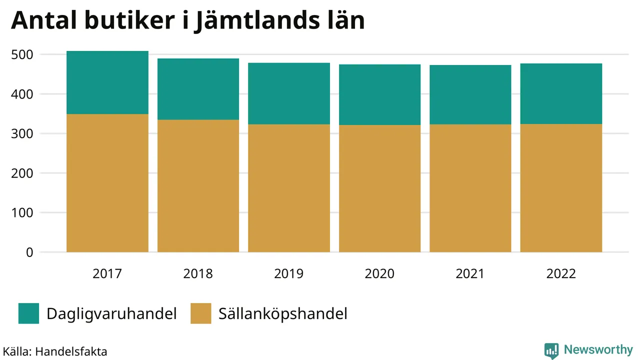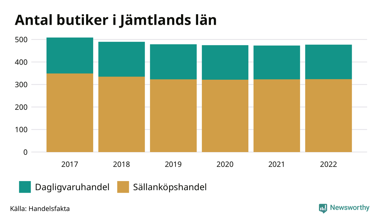 I Jämtland som helhet har antalet butiker minskat från 509 till 477 mellan 2017 och 2022. Bara en kommun, Härjedalens kommun, hade fler butiker 2022 än 2017.
