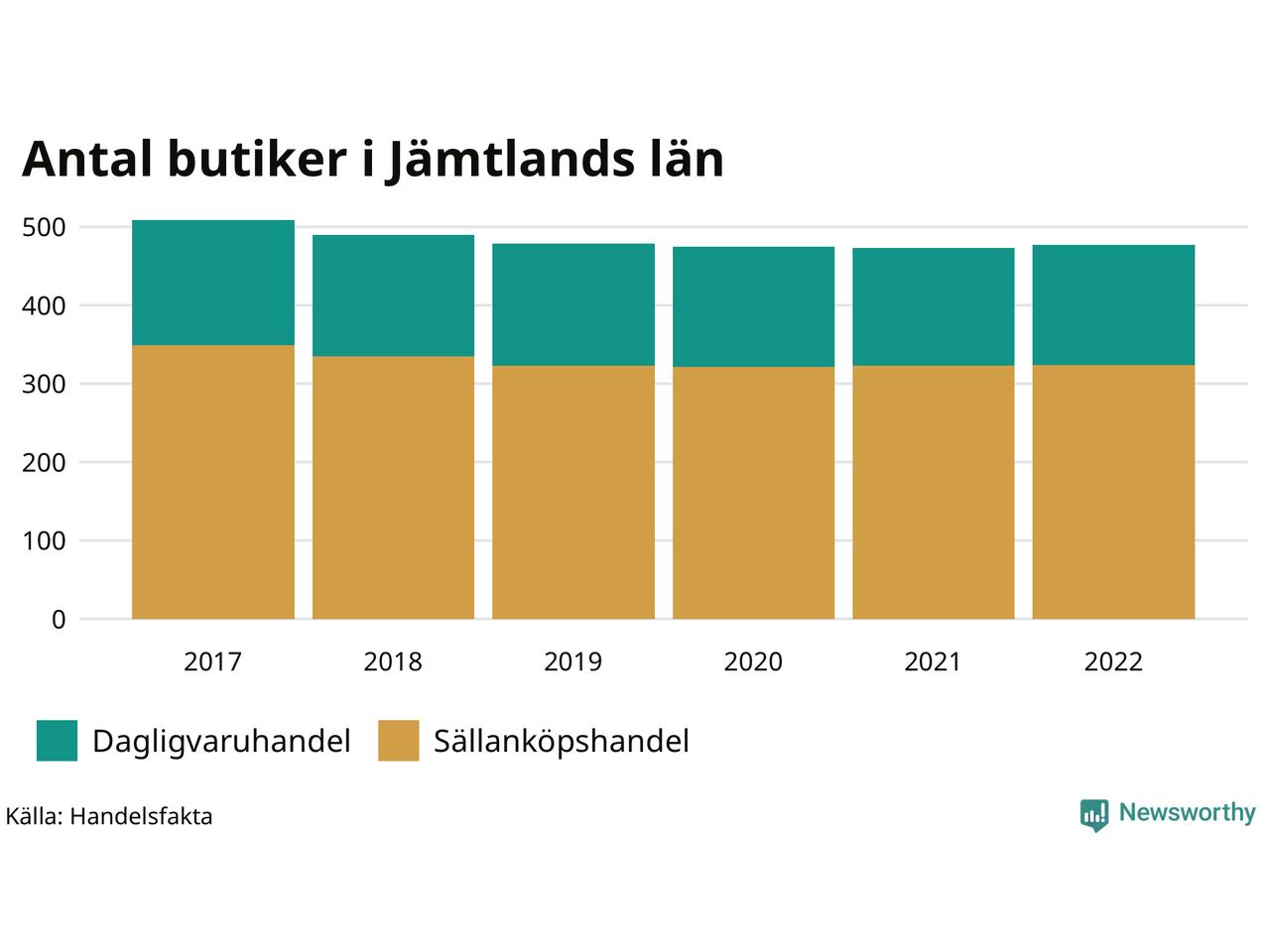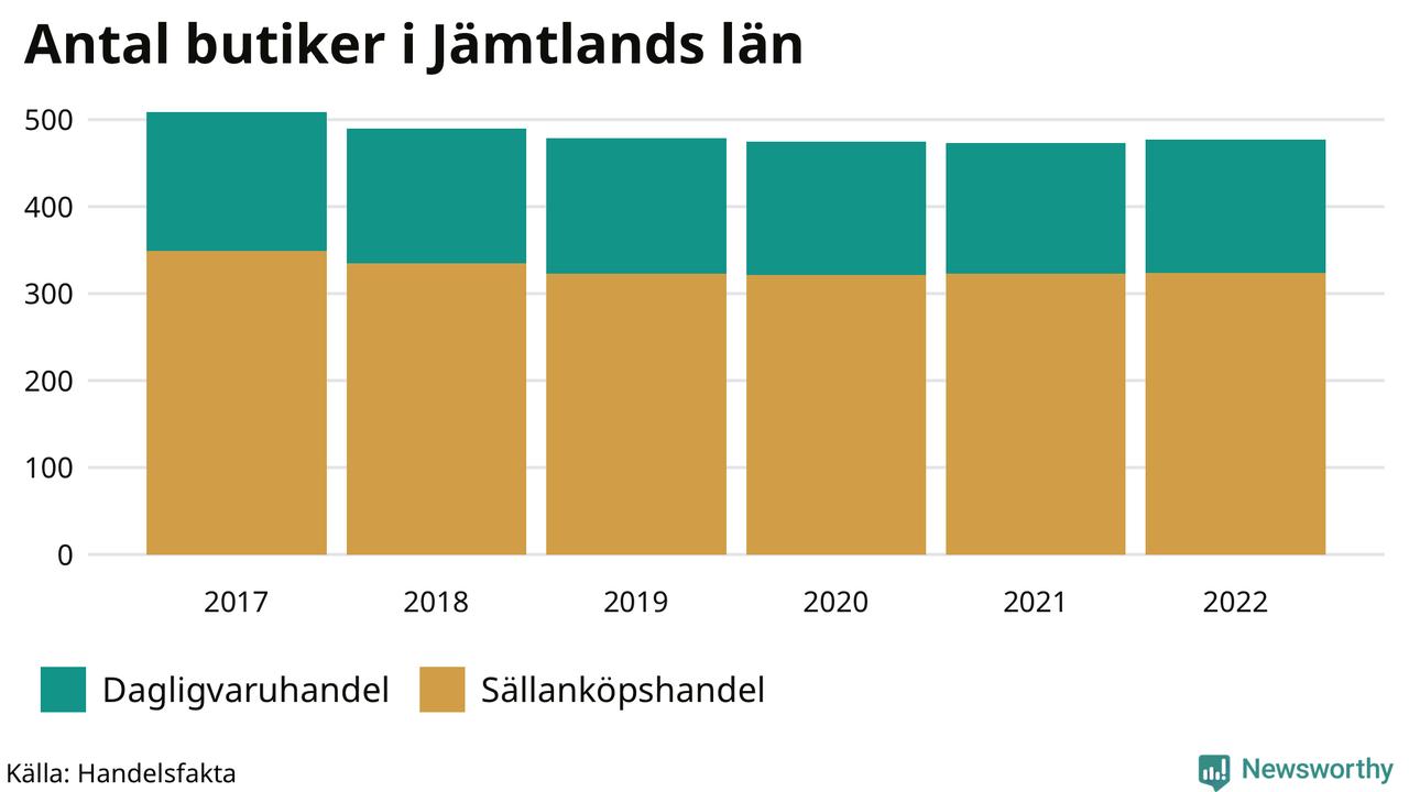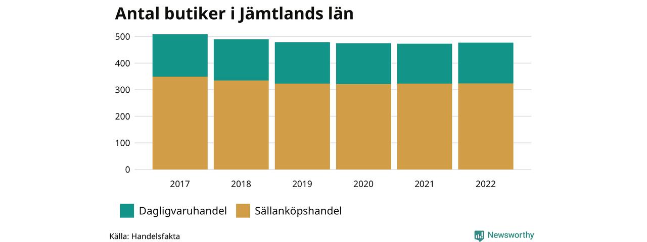 Samma utveckling ses i Jämtlands län. Den 30 november 2022 fanns 477 butiker i länet, vilket är fyra fler än året innan men 32 färre än 2017.