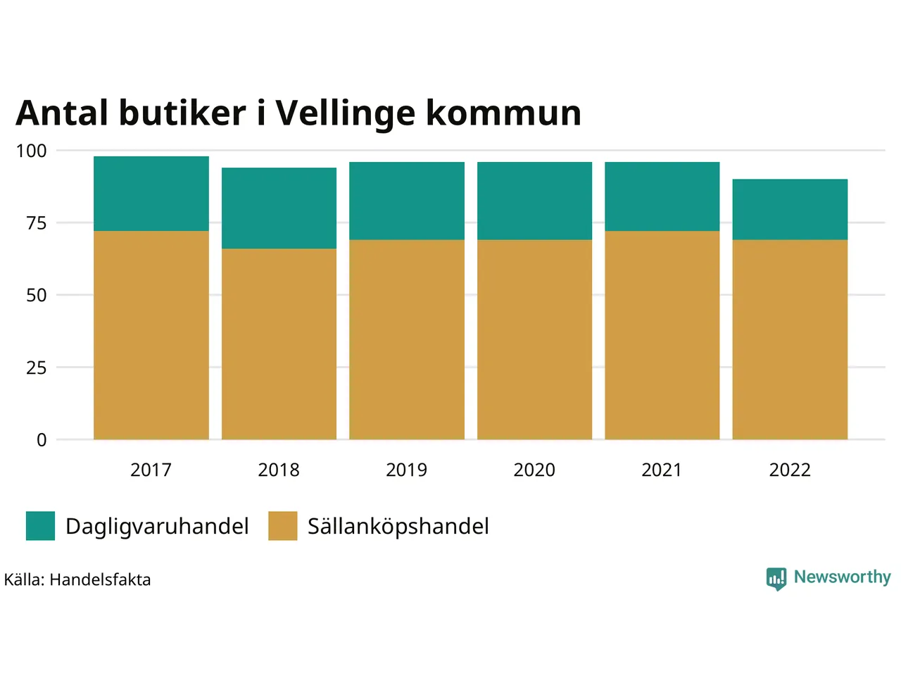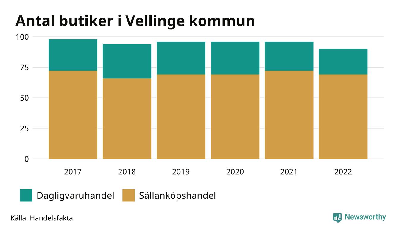 Samma utveckling ses i Vellinge kommun. Den 30 november 2022 fanns 90 butiker i kommunen, vilket är sex färre än året innan och åtta färre än 2017.