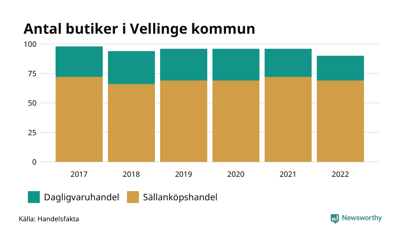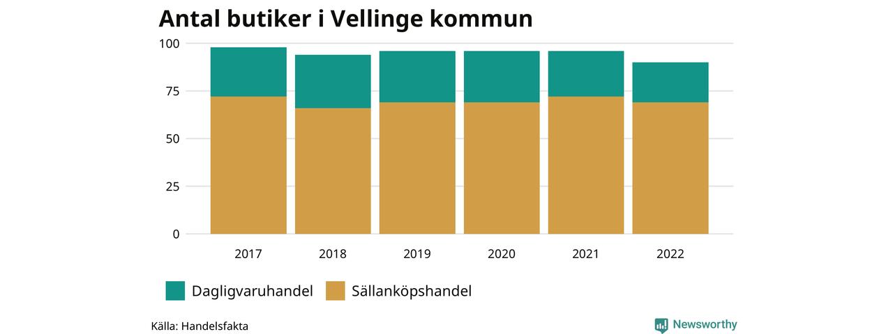 Flest butiker har försvunnit bland dem som kategoriseras som daglivaruhandeln, till exempel matbutiker. 2017 fanns 26 sådana butiker i kommunen – 2022 var de 21. Sällanköpshandeln, där bland annat kläd- och elektronikaffärer ingår, har minskat från 72 till 69 butiker.