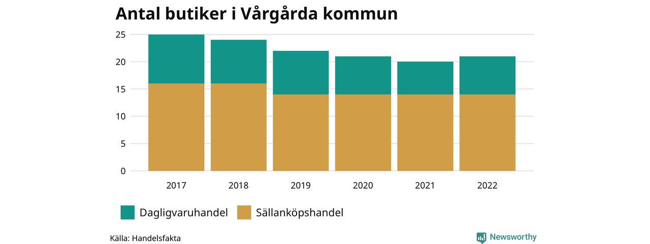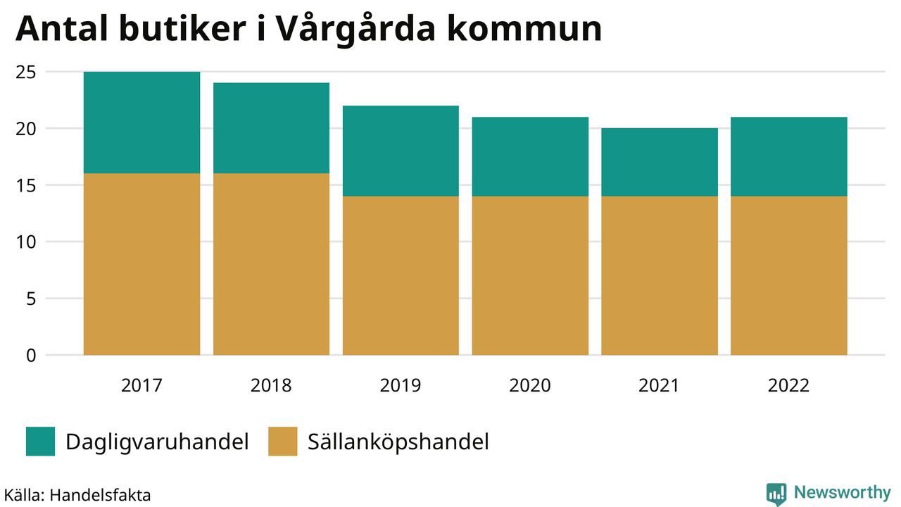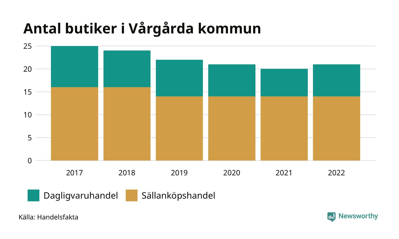 I Vårgårda rör det sig om små tal. Den 30 november 2022 fanns 21 butiker i kommunen, vilket är en fler än året innan men fyra färre än 2017.