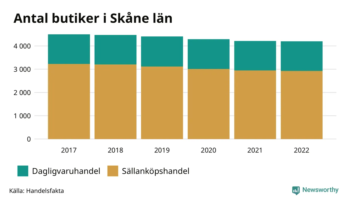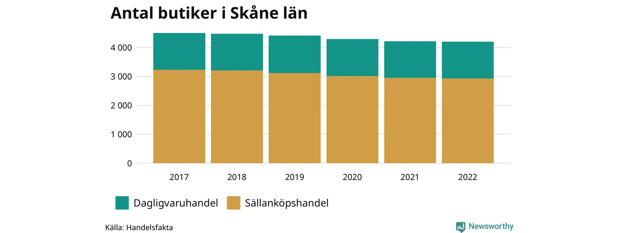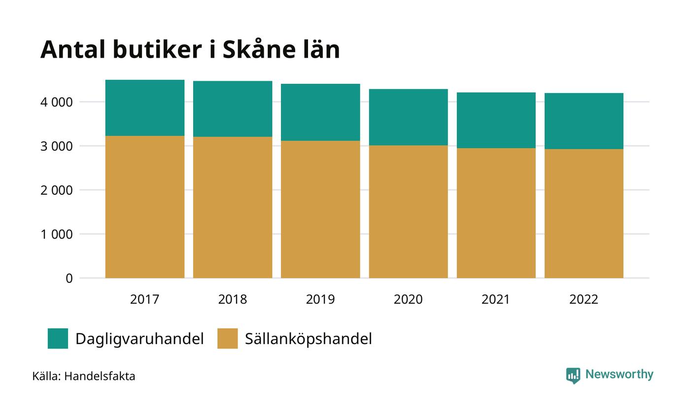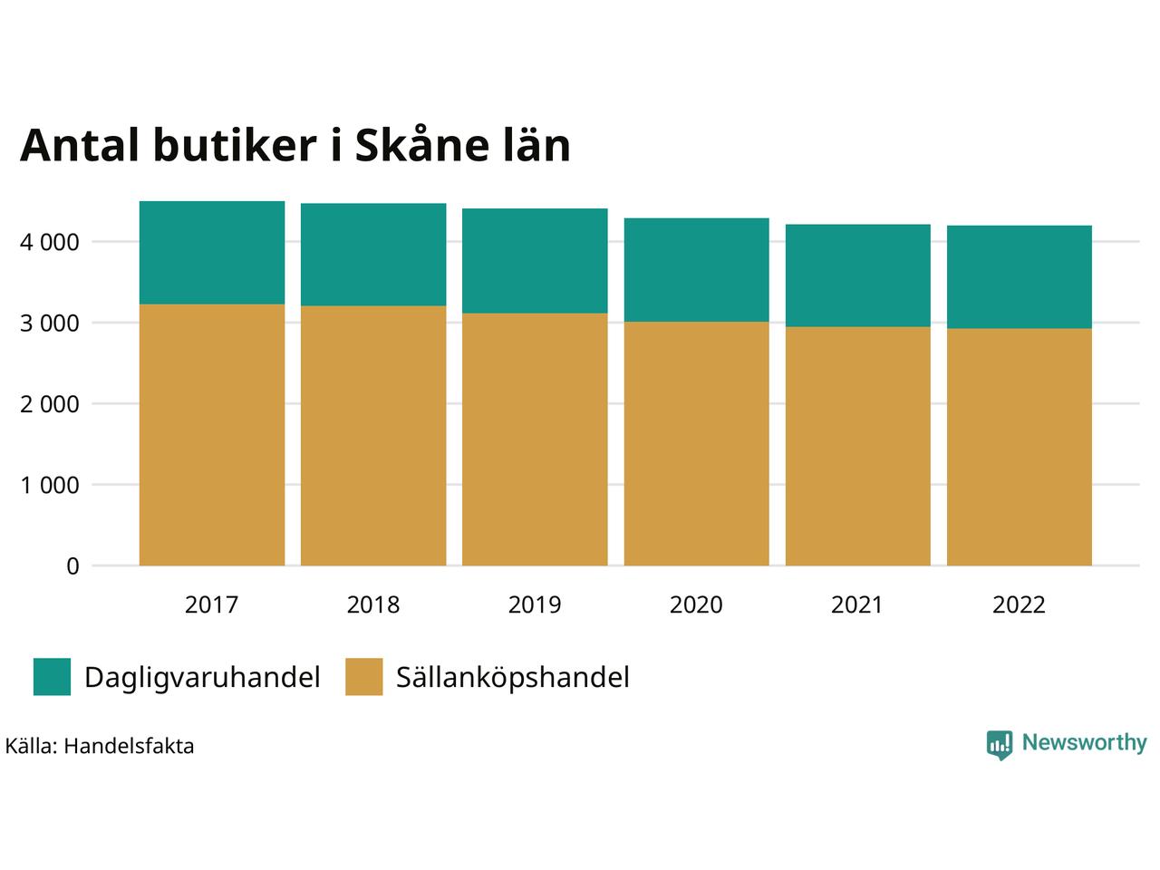 Samma utveckling ses i Skåne län. Den 30 november 2022 fanns 4 201 butiker i länet, vilket är nio färre än året innan och 301 färre än 2017.