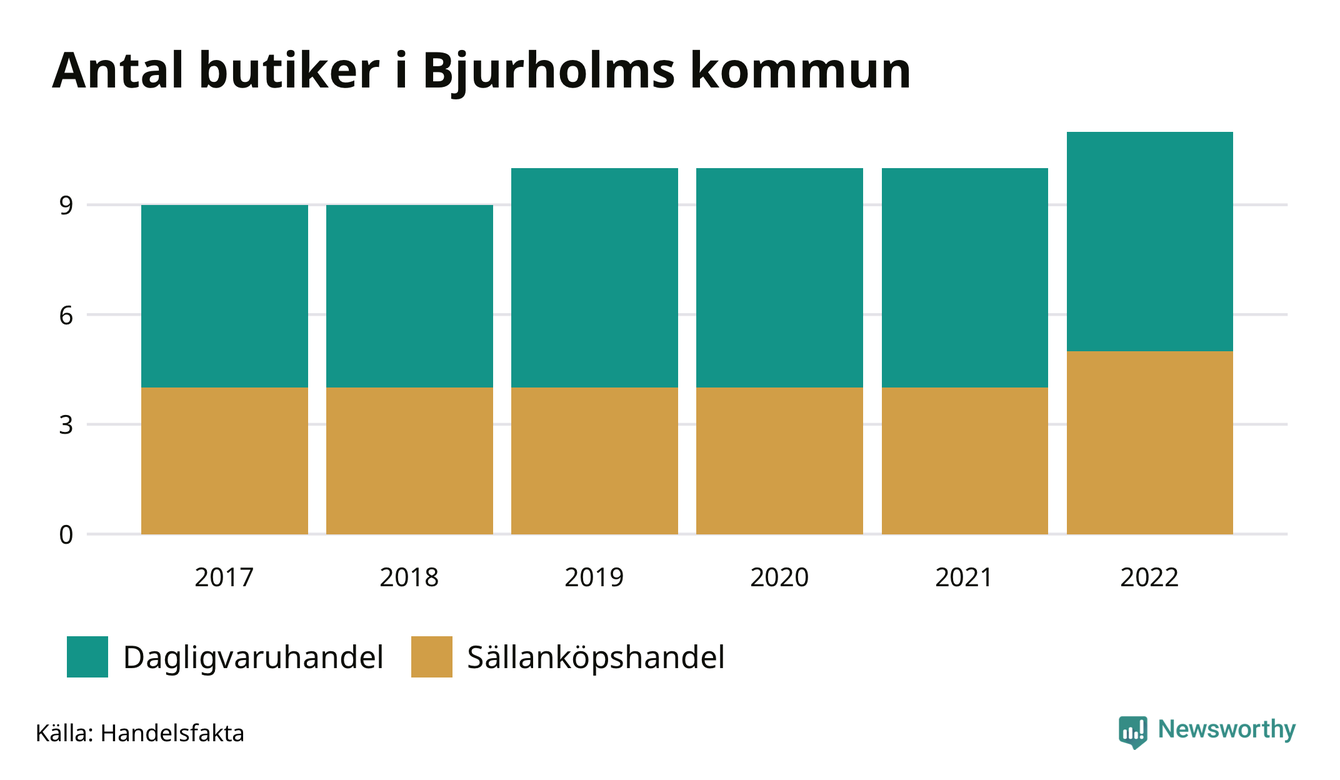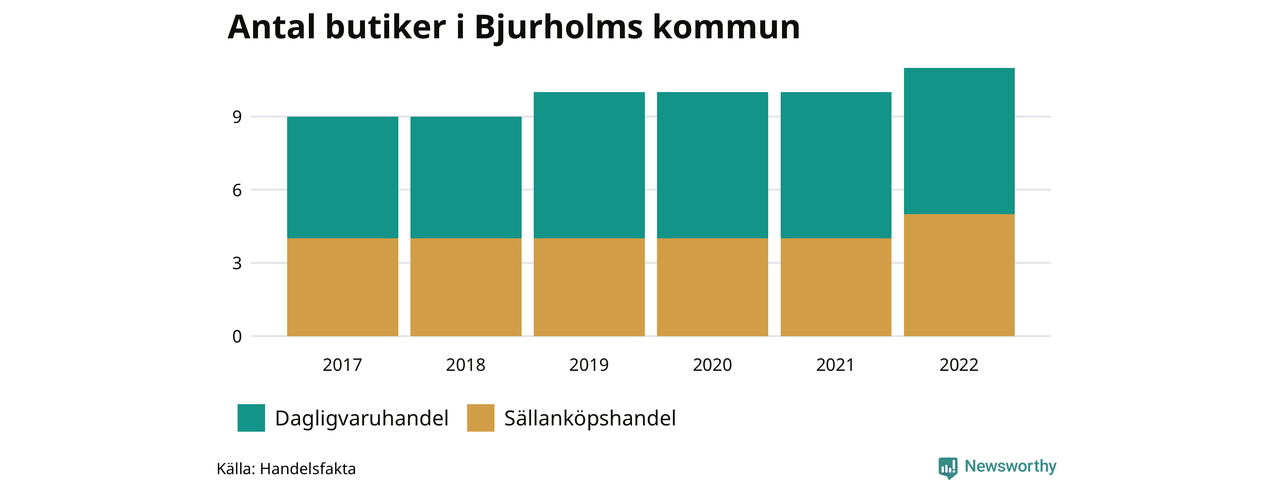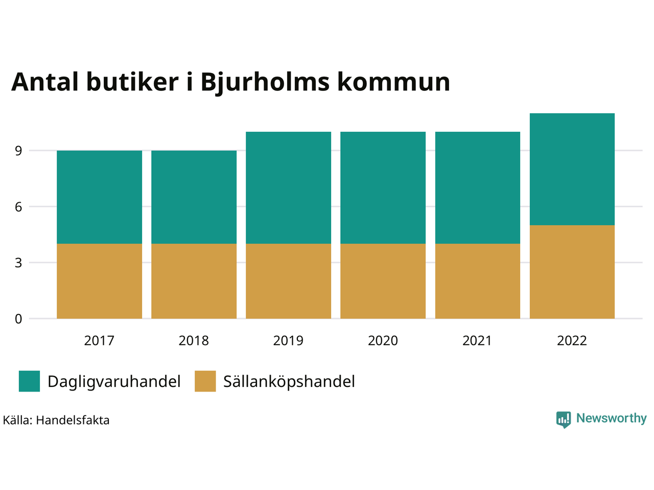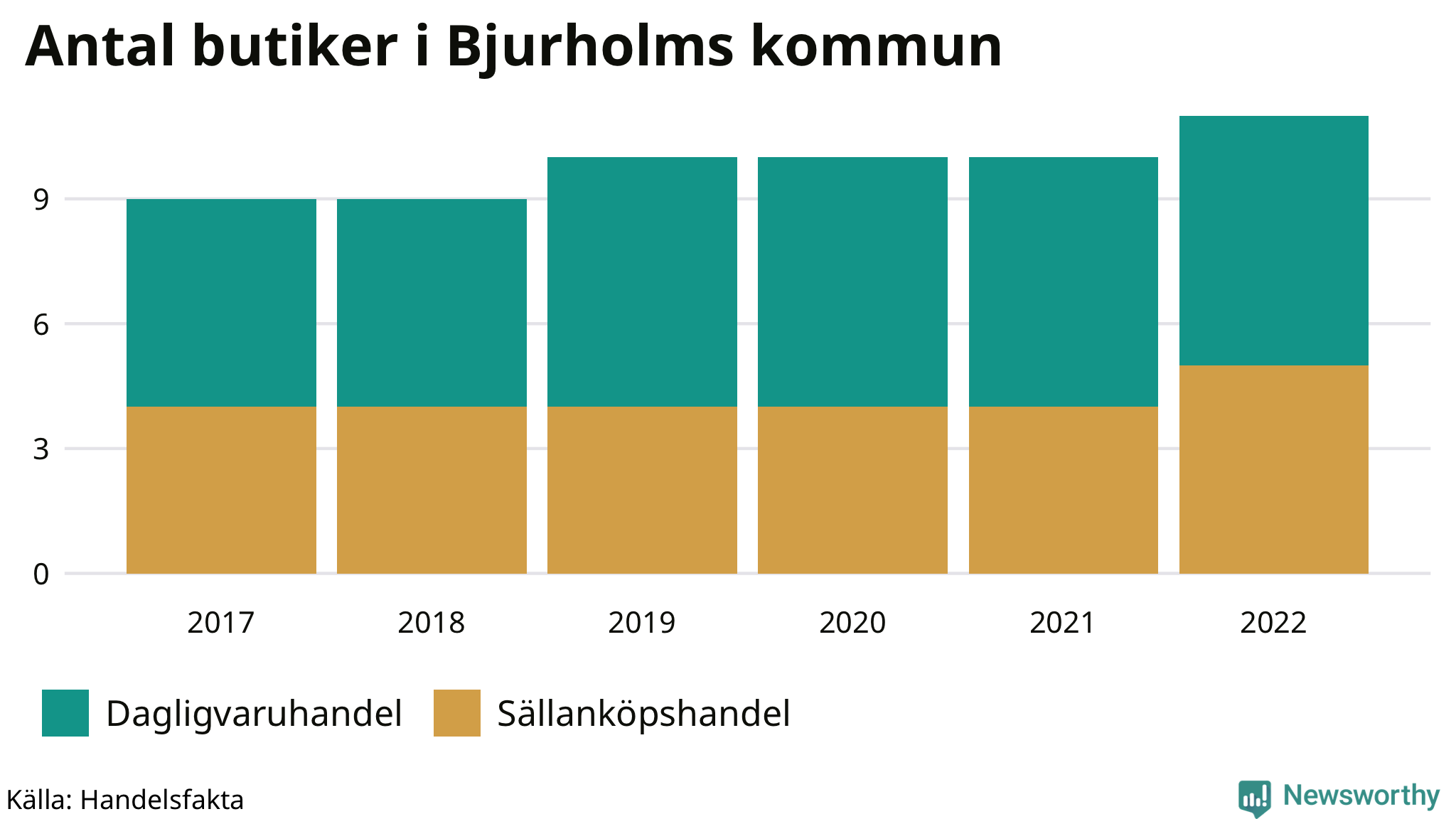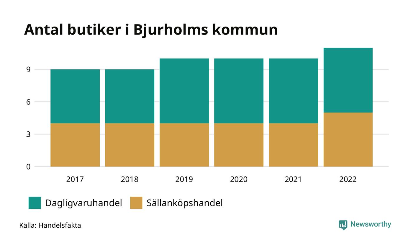 I Bjurholm rör det sig om små tal. Den 30 november 2022 fanns elva butiker i kommunen, vilket är en fler än året innan och två fler än 2017.