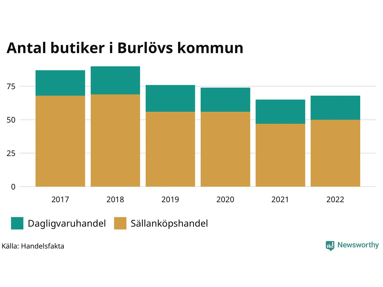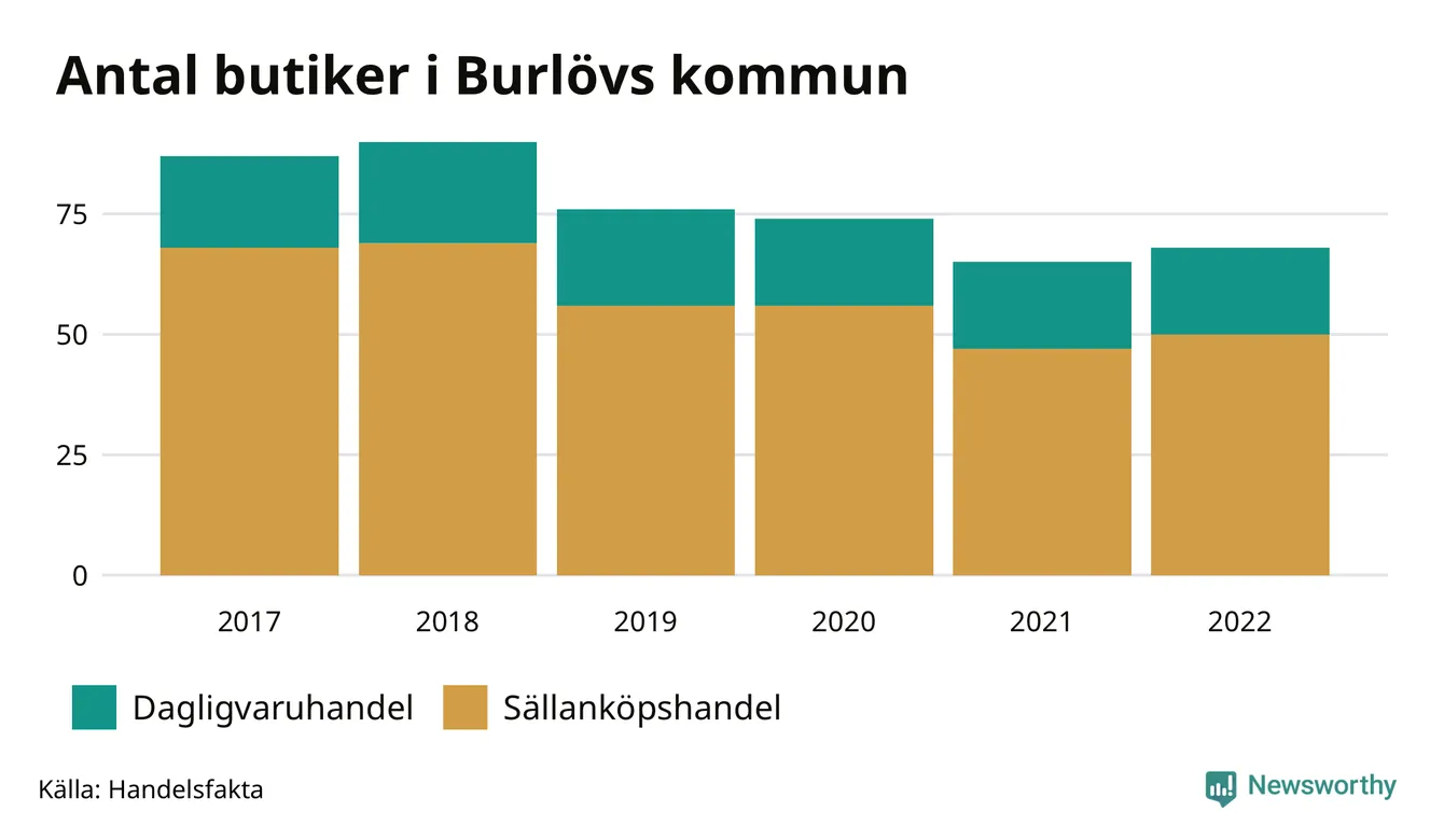 Flest butiker har försvunnit bland dem som kategoriseras som sällanköp, till exempel klädaffärer och bokhandlar. 2017 fanns 68 sådana butiker i kommunen – 2022 var de 50. Dagligvaruhhandeln, där bland annat mataffärer ingår, har minskat från 19 till 18 butiker.