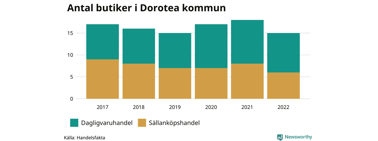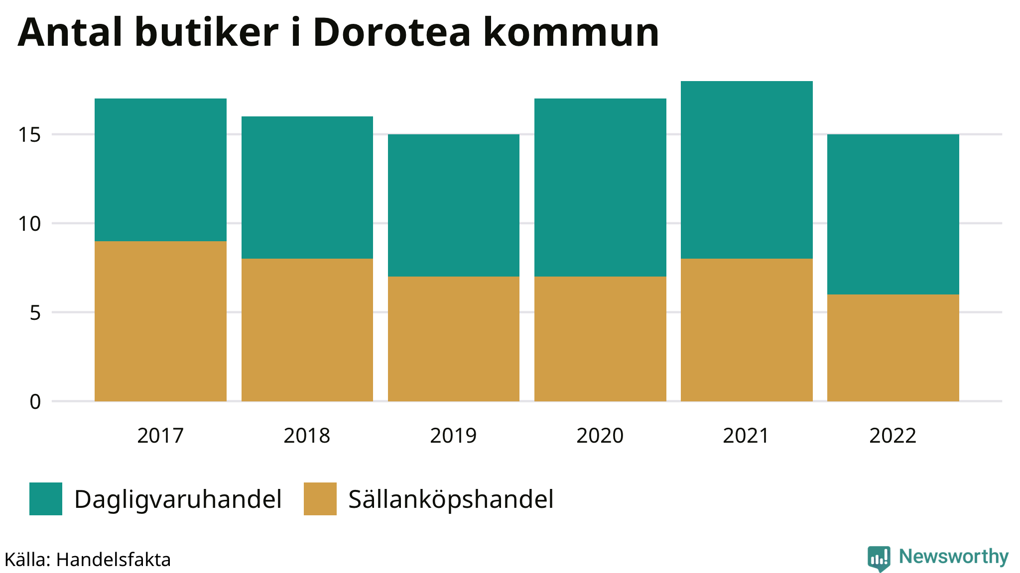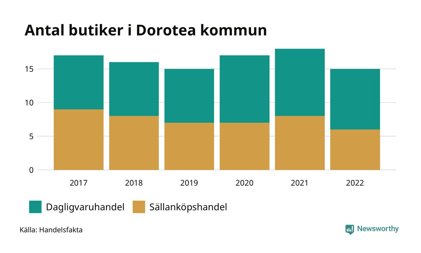 I Dorotea rör det sig om små tal. Den 30 november 2022 fanns 15 butiker i kommunen, vilket är tre färre än året innan och två färre än 2017.