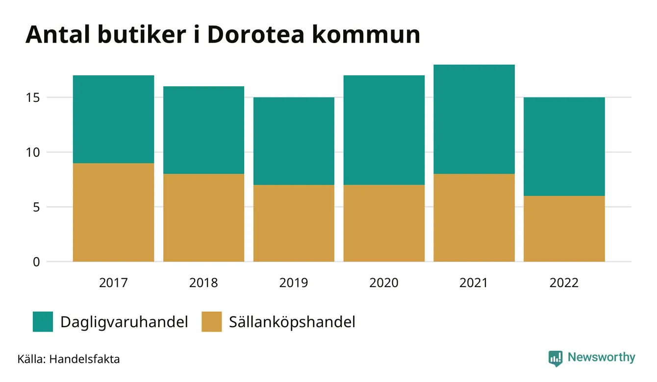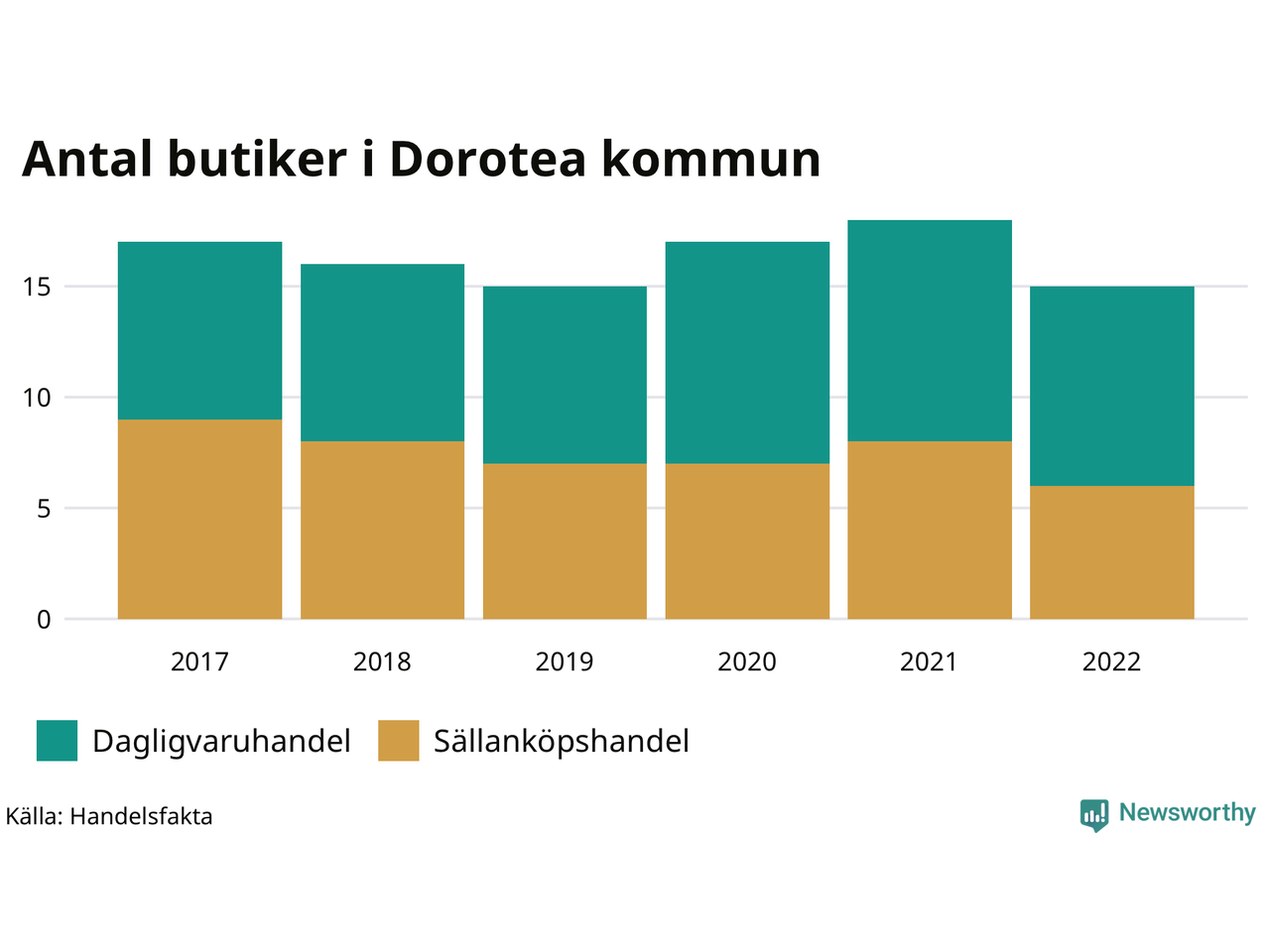 Butikerna blir allt färre i landet, sedan 2017 har antalet minskat med 7 procent. I Dorotea kommun fanns 15 butiker 2022 – jämfört med 17 stycken fem år tidigare.