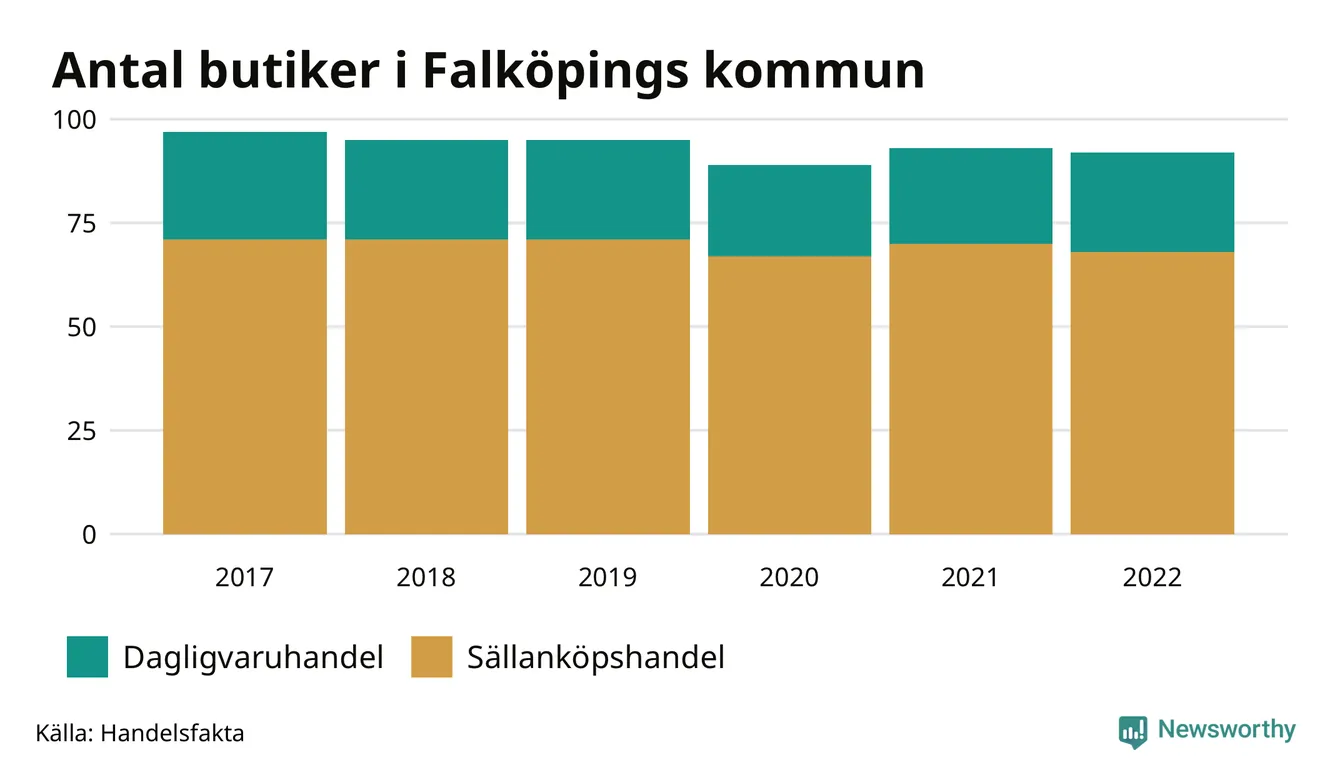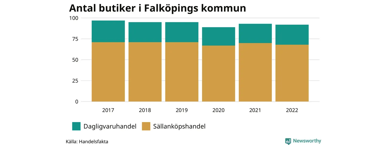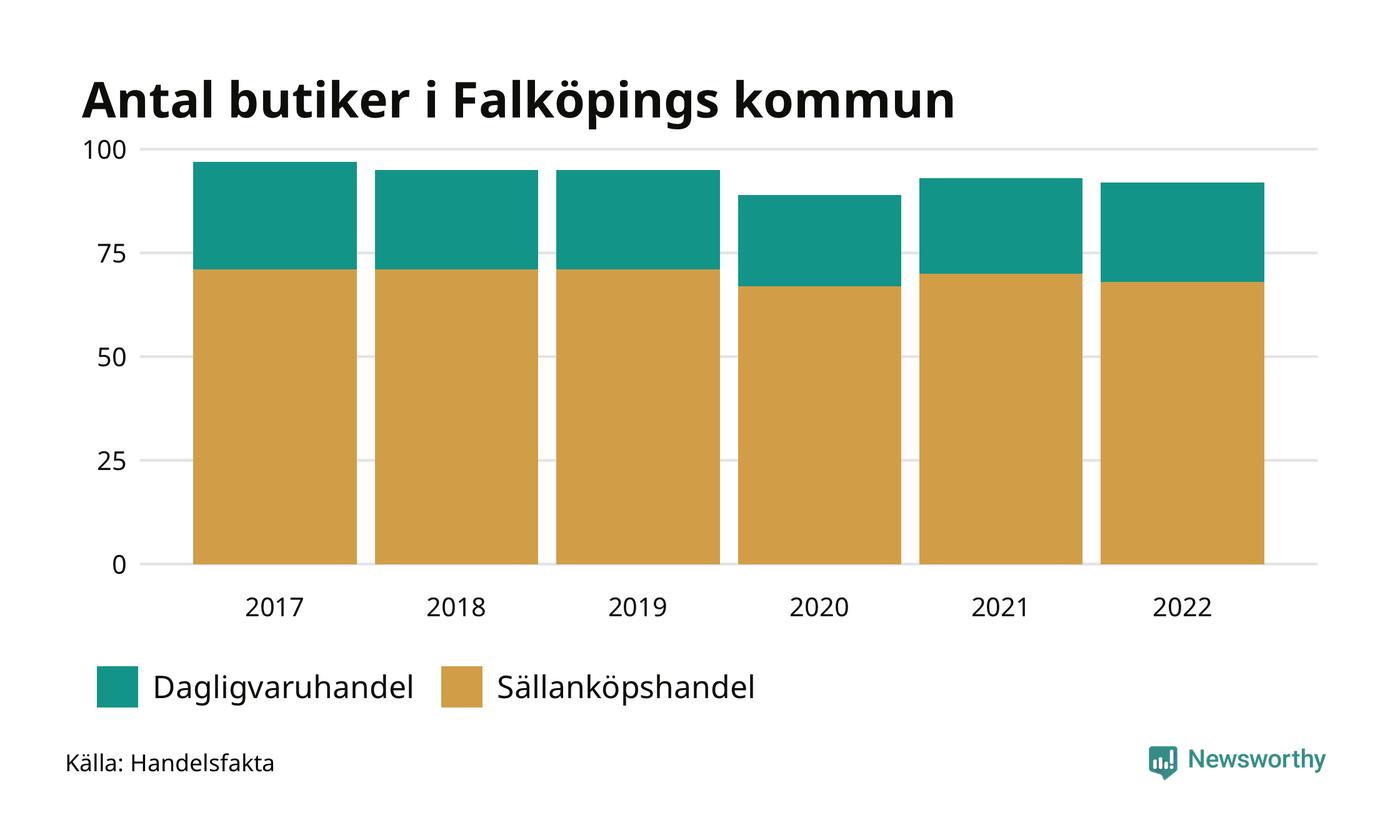Samma utveckling ses i Falköpings kommun, även om det inte gått riktigt lika fort. Den 30 november 2022 fanns 92 butiker i kommunen, vilket är en färre än året innan och fem färre än 2017.