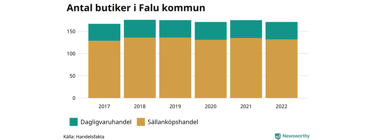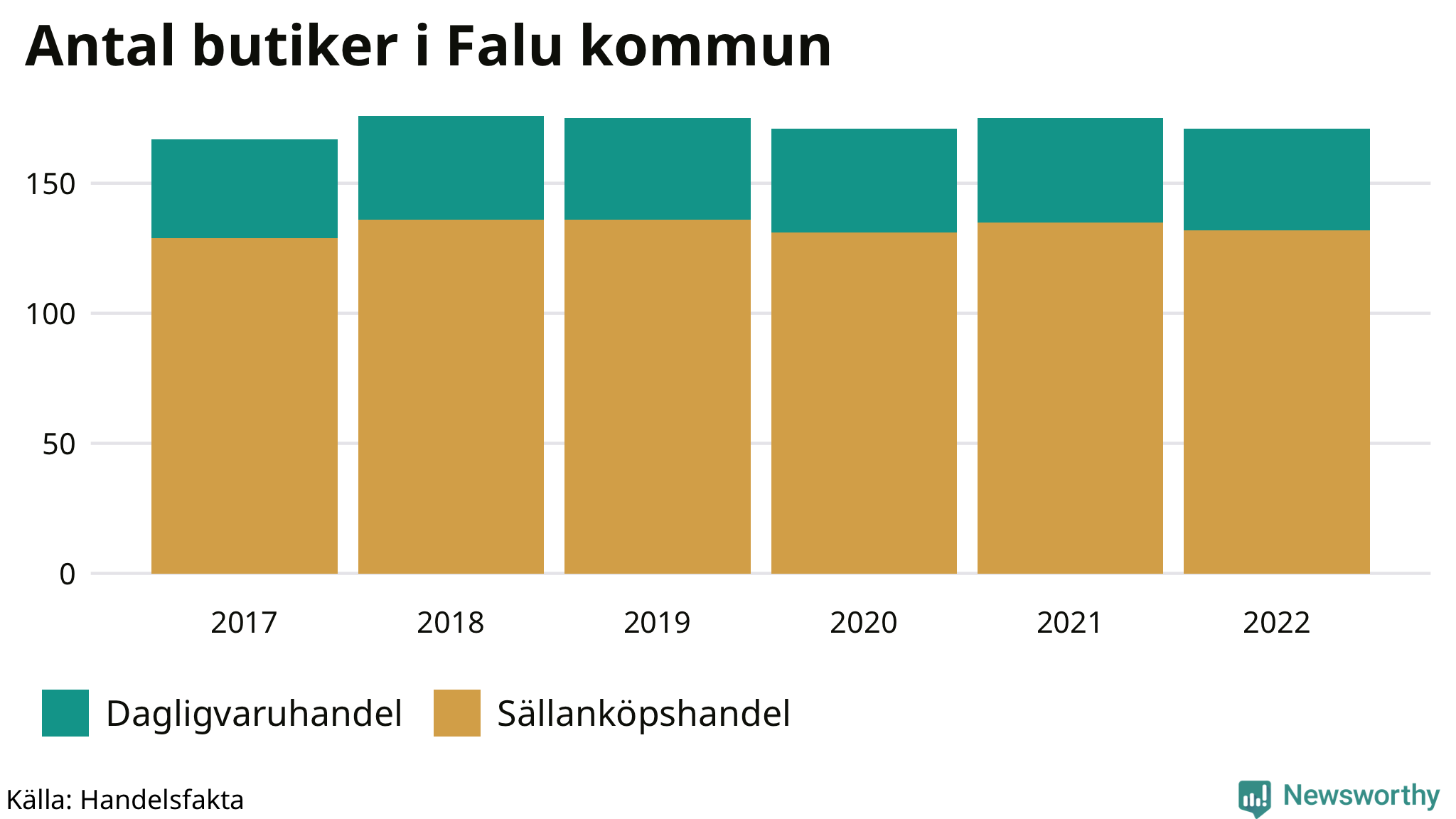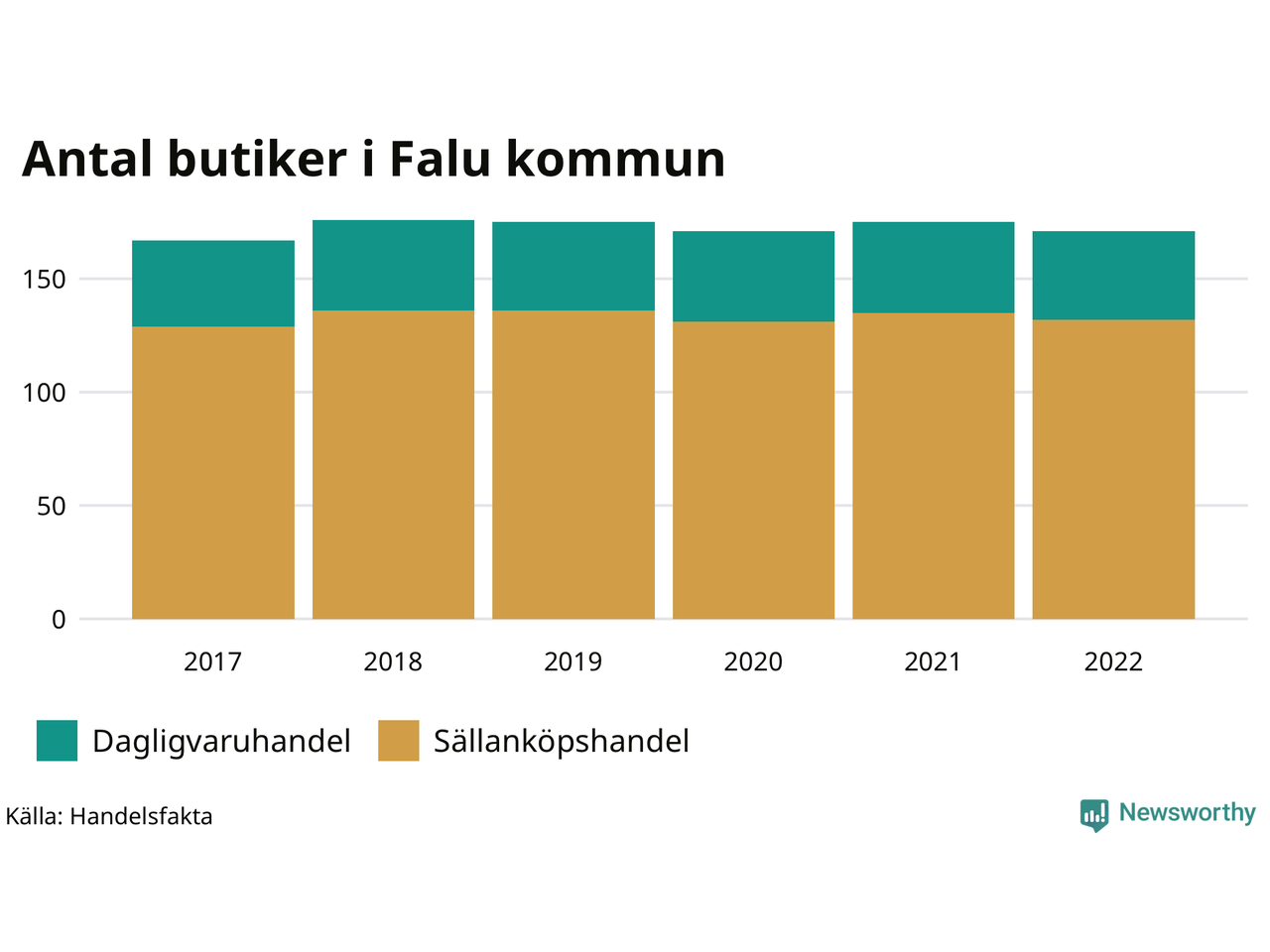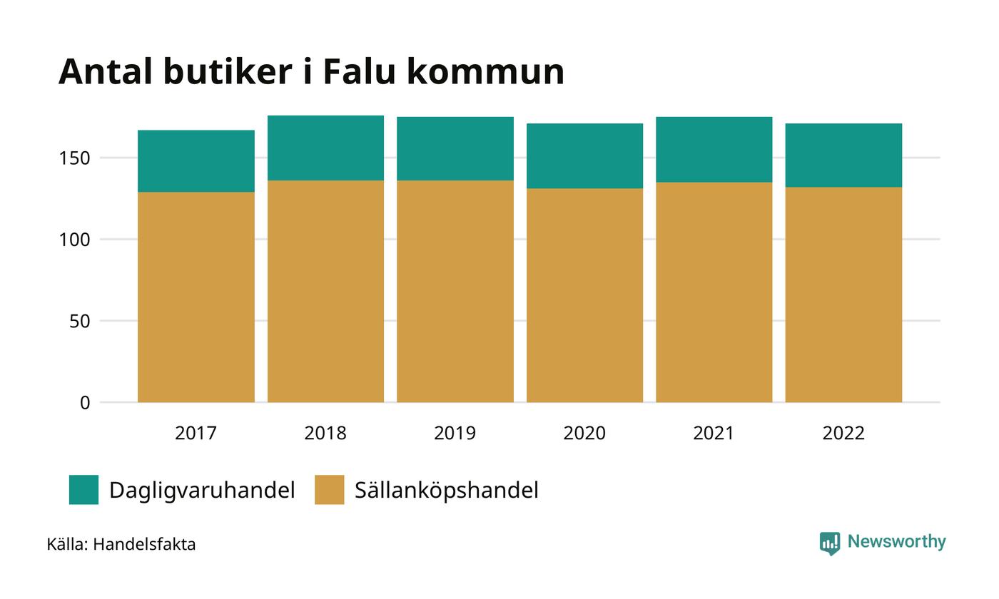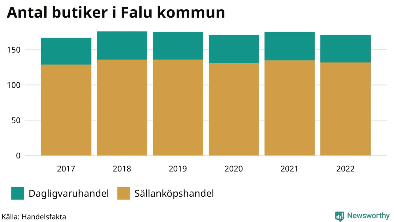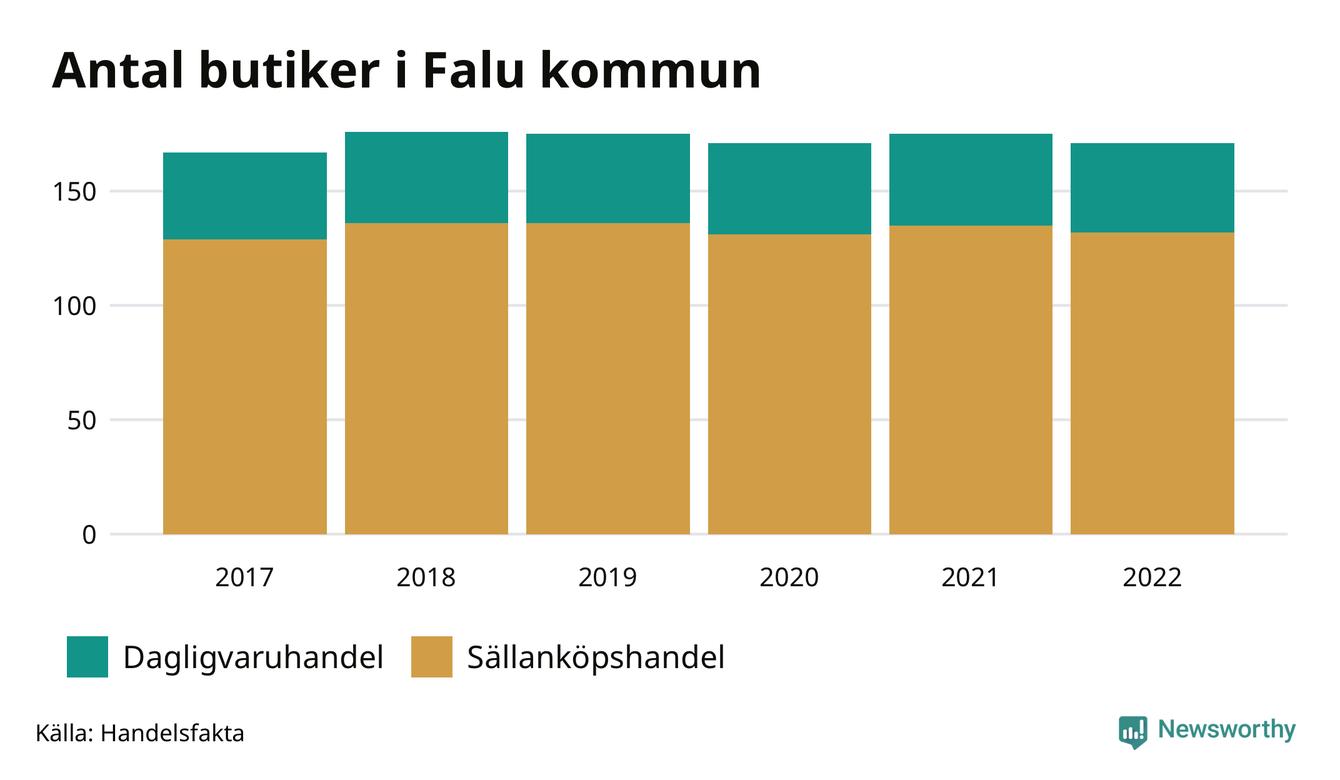 I Falu kommun har antalet butiker däremot ökat. Den 30 november 2022 fanns 171 butiker i kommunen, vilket är fyra färre än året innan men fyra fler än 2017.