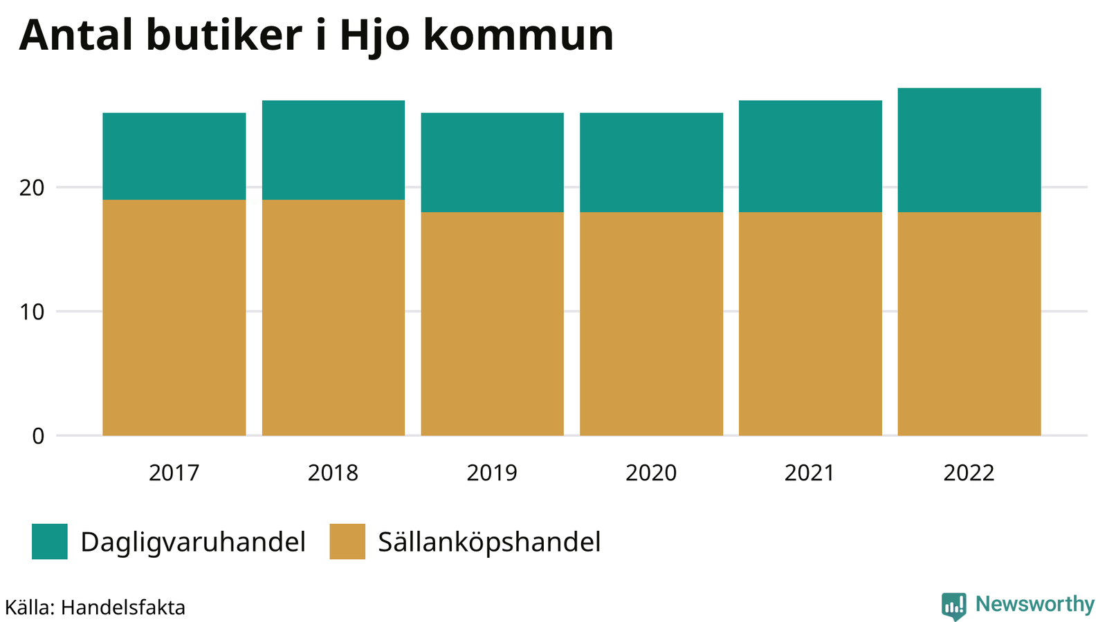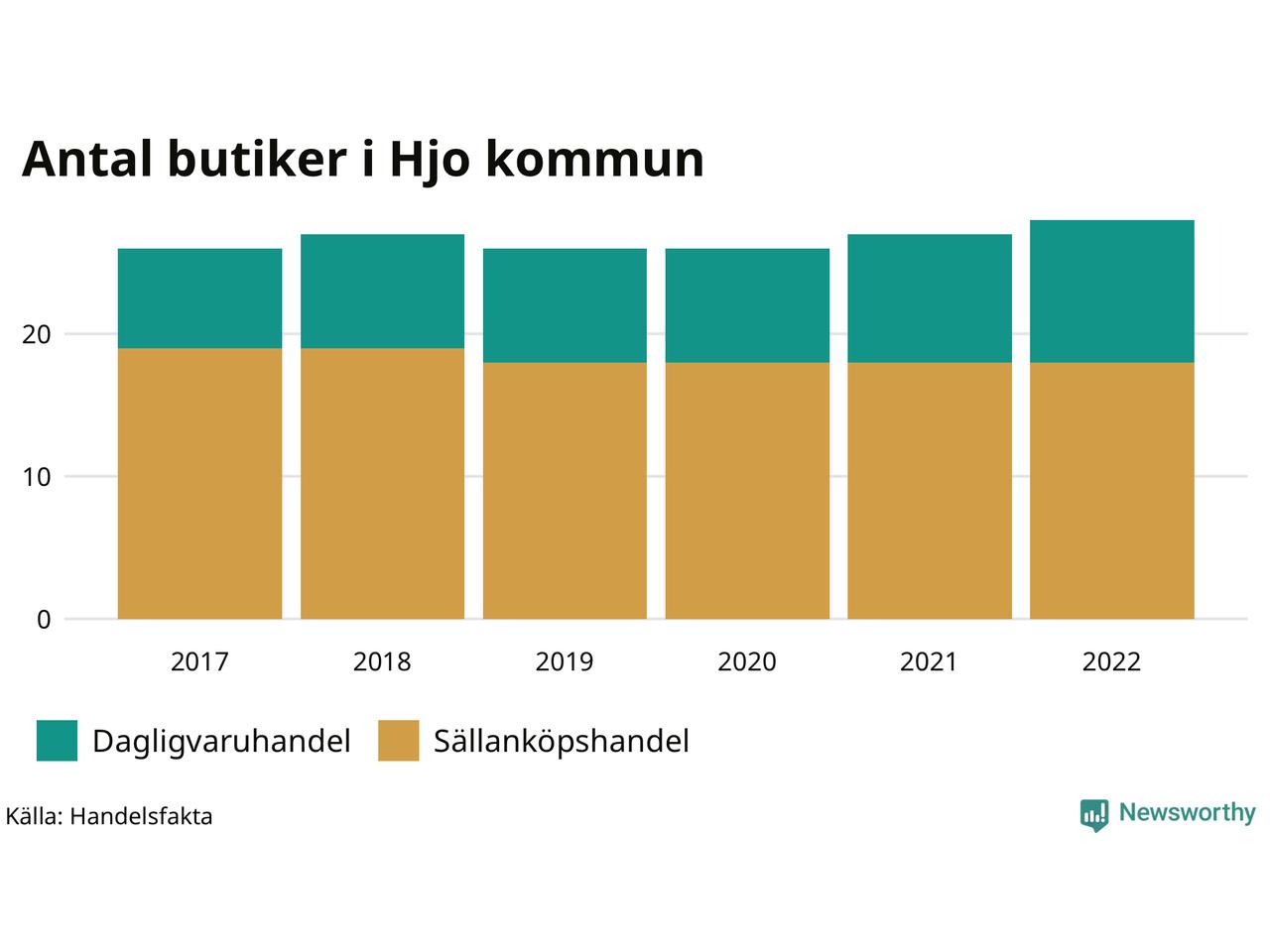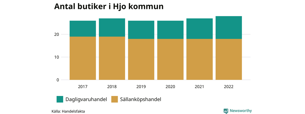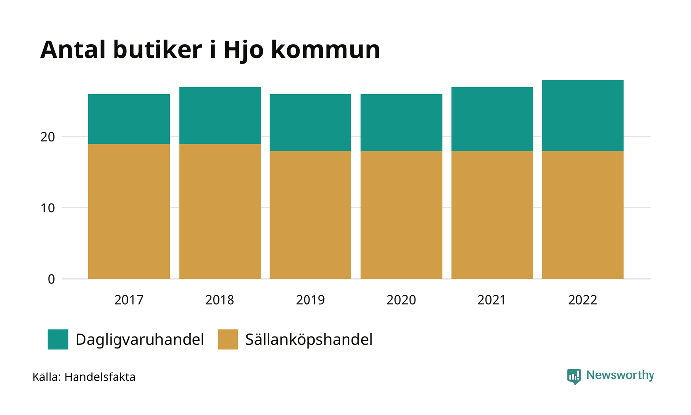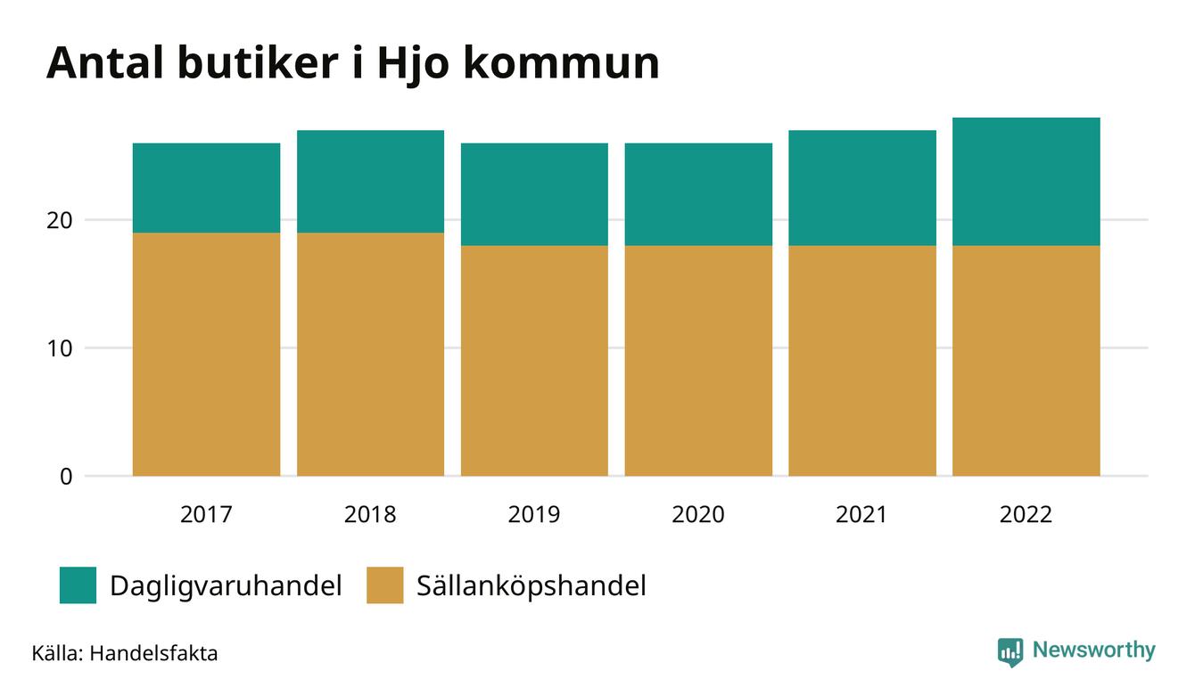 I Hjo rör det sig om små tal. Den 30 november 2022 fanns 28 butiker i kommunen, vilket är en fler än året innan och två fler än 2017.