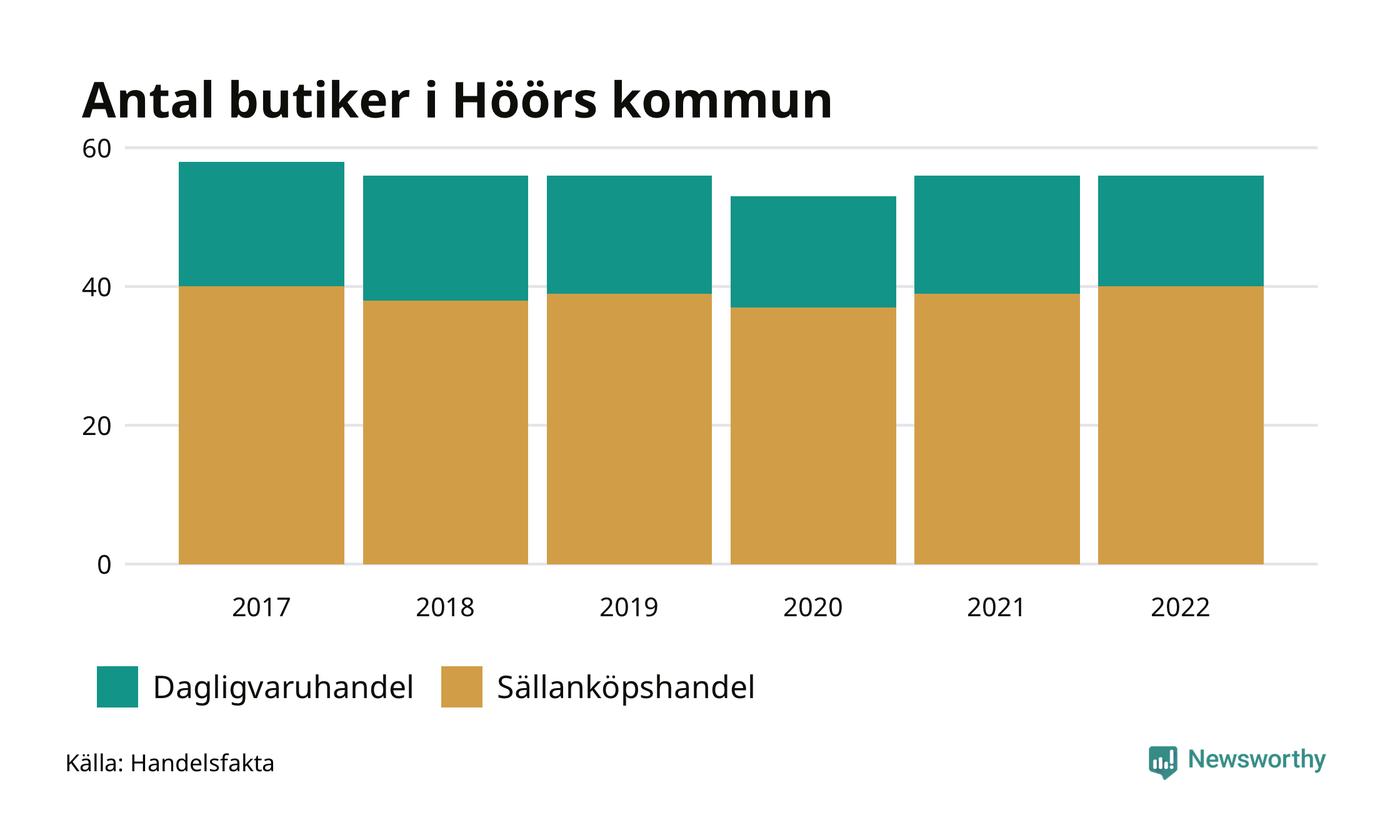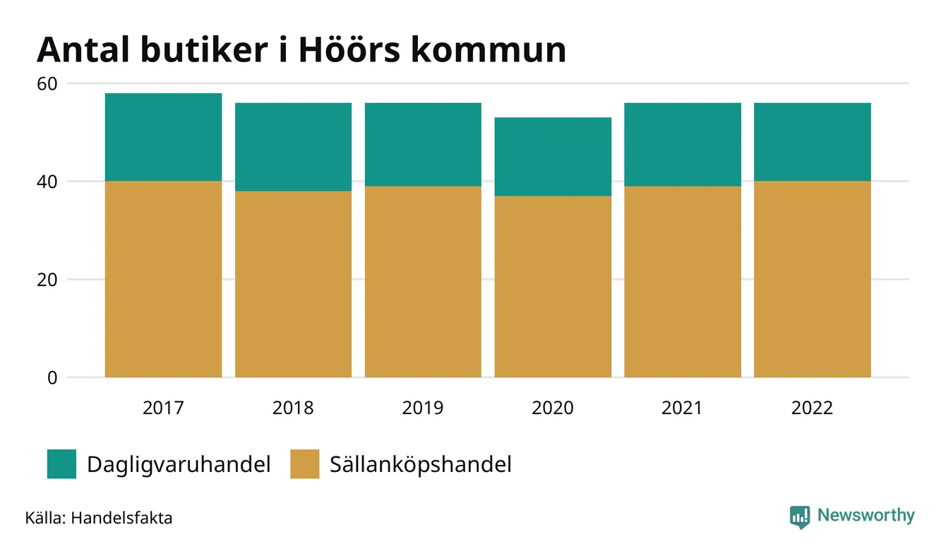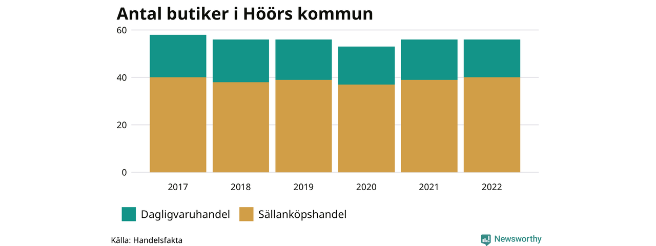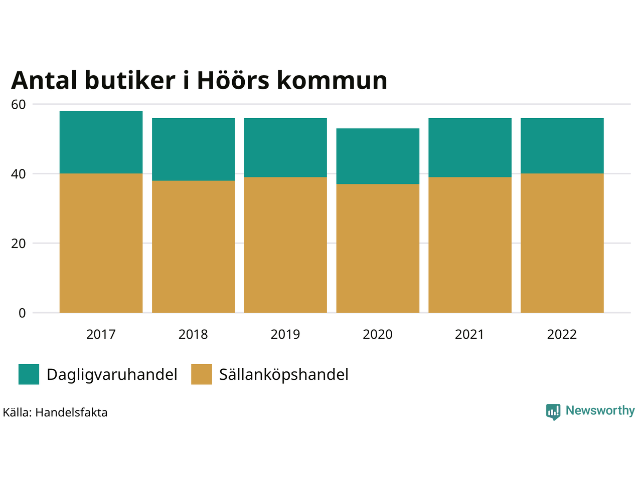 I Höörs kommun har förändringarna varit relativt små. Den 30 november 2022 fanns 56 butiker i kommunen, vilket är lika många som året innan men två färre än 2017.