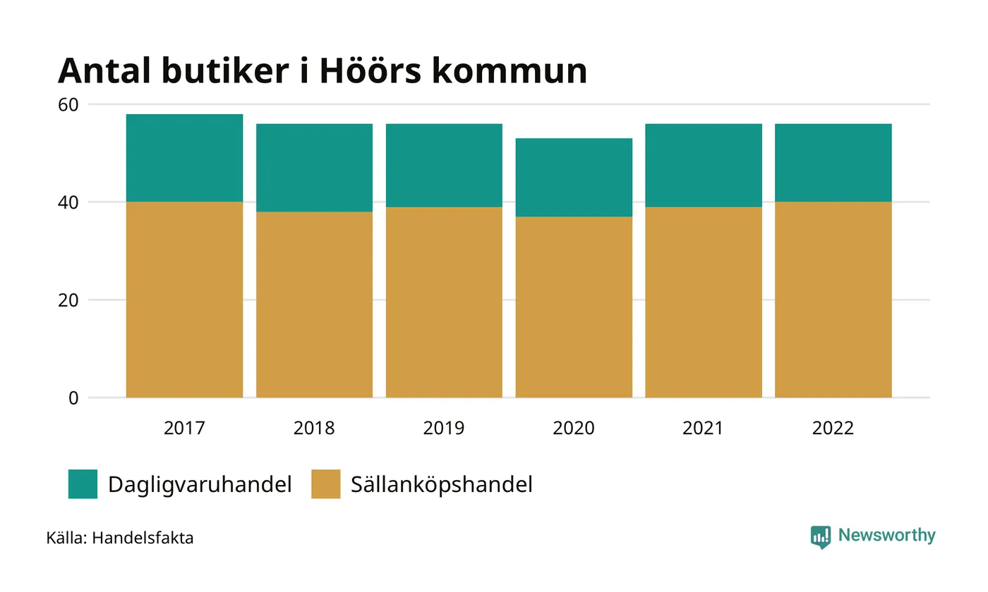 Av butikerna i Höör kategoriseras 16 som dagligvaruhandel, till exempel matbutiker. Det är två färre än 2017. 40 butiker faller under kategorin sällanköp, till exempel kläd- och bygghandel, även det lika många som 2017.