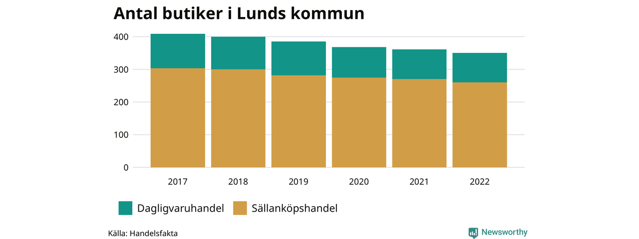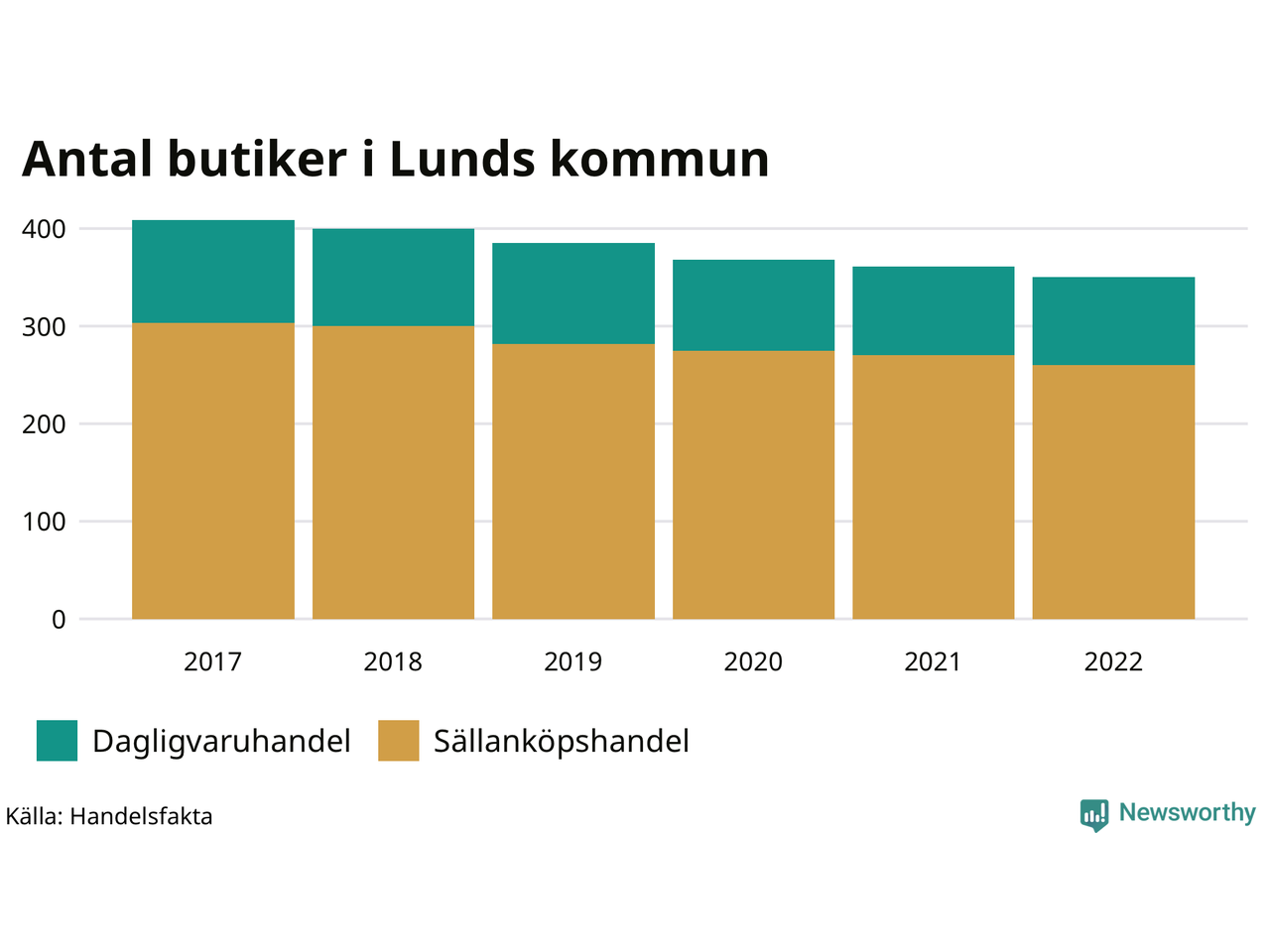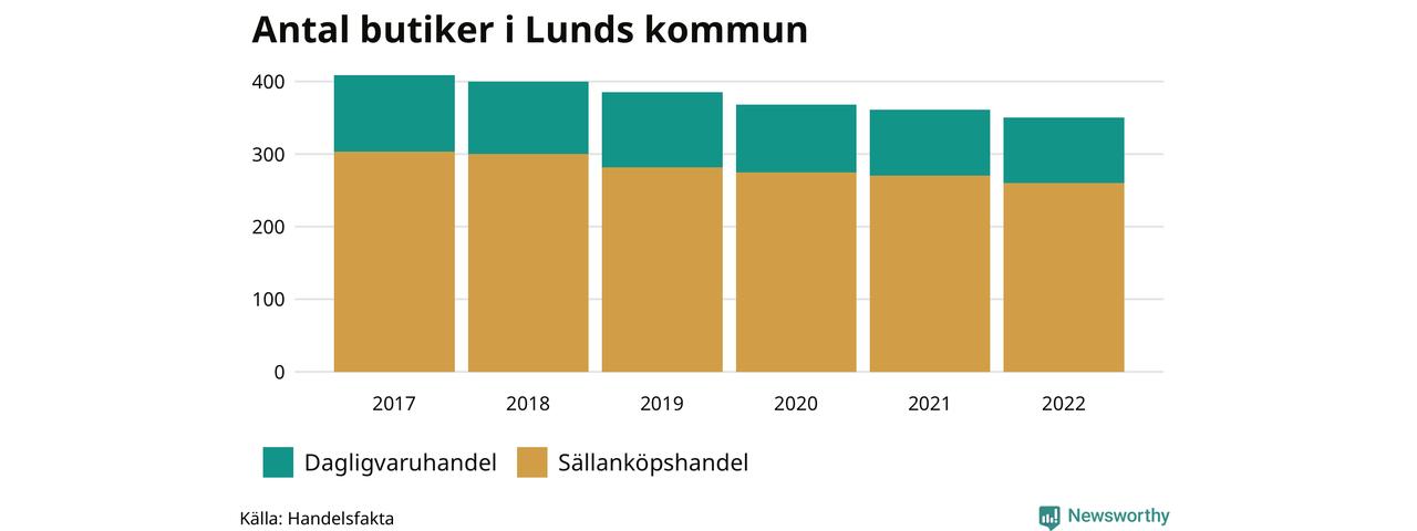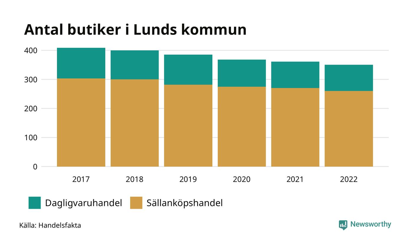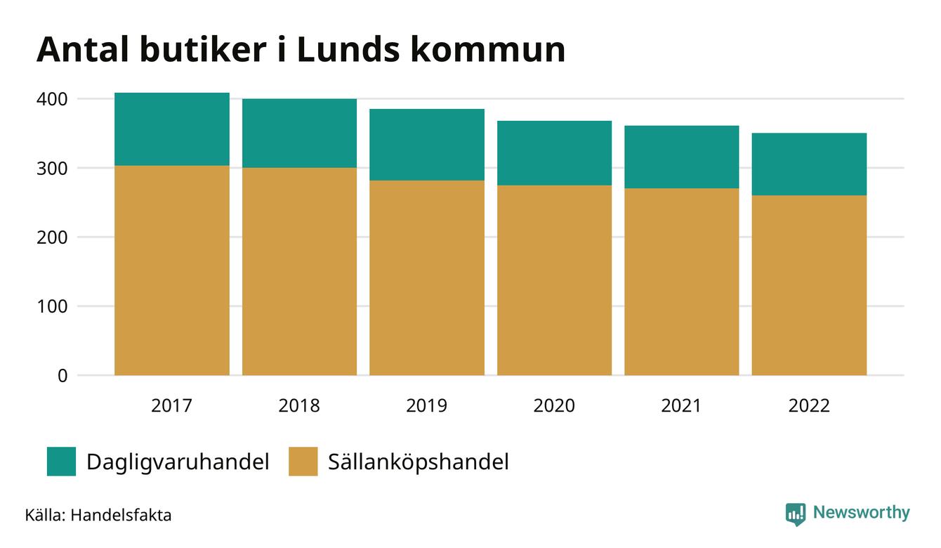 I Lunds kommun har utvecklingen gått ännu fortare. Här har var sjunde butik försvunnit. Den 30 november 2022 fanns 350 butiker i kommunen, vilket är elva färre än året innan och 59 färre än 2017.