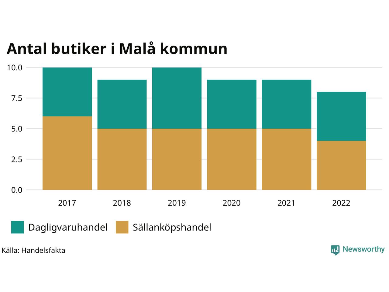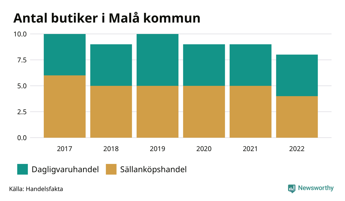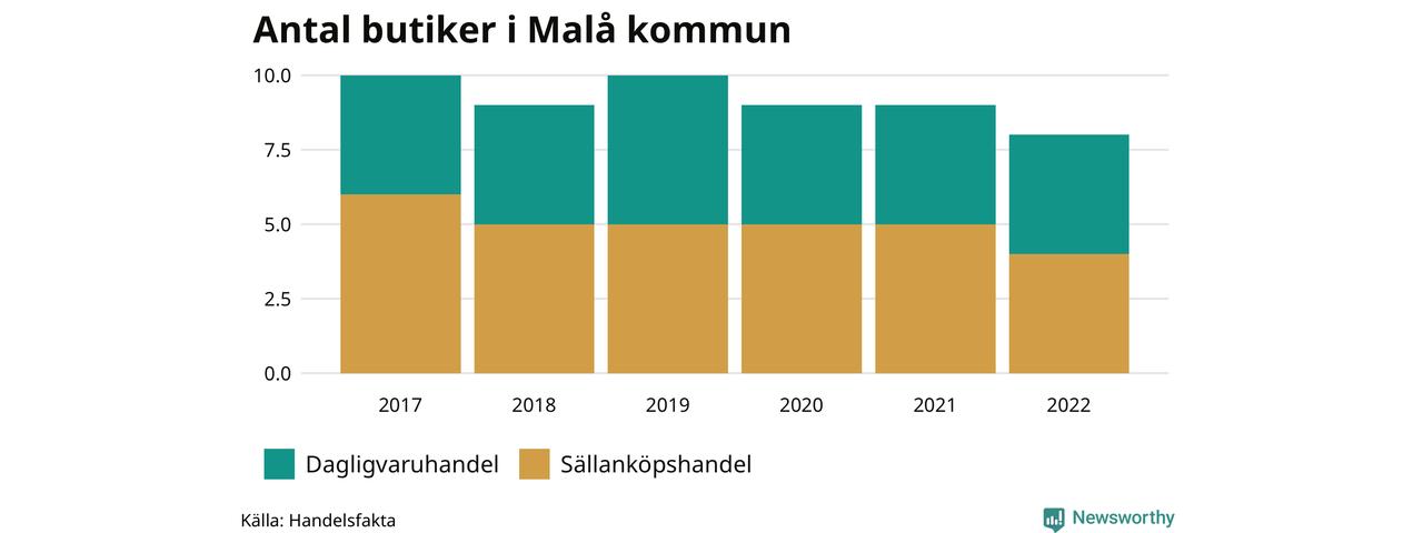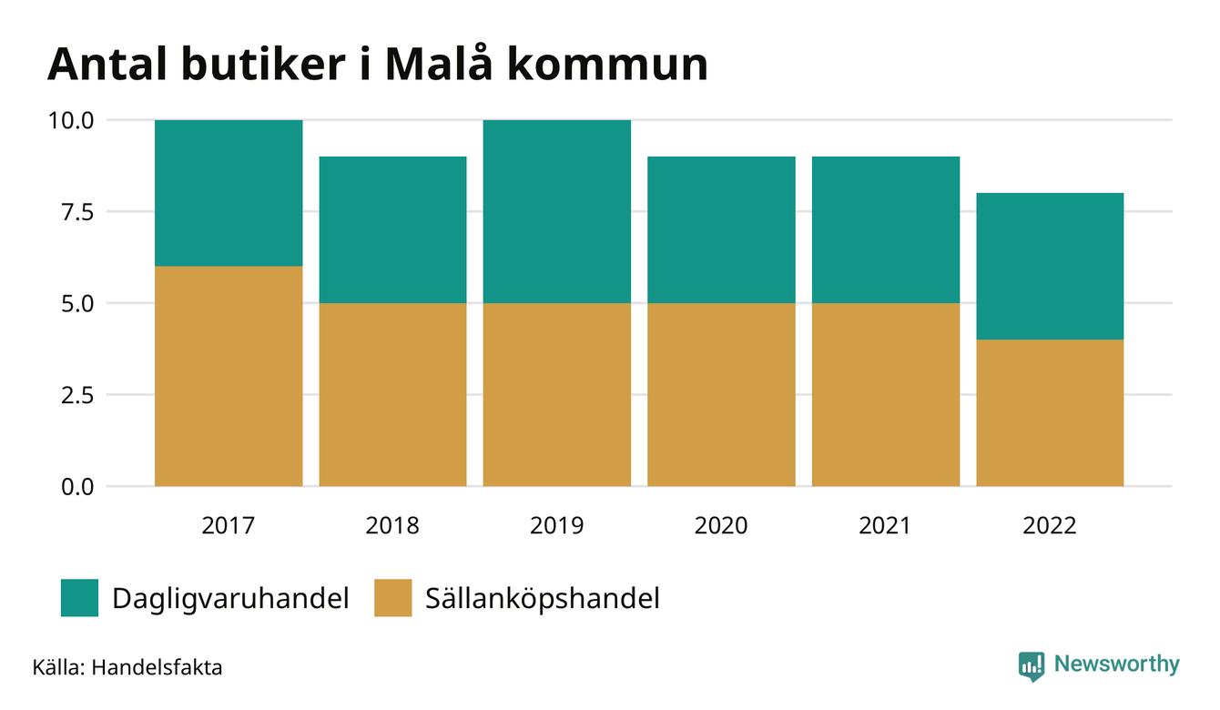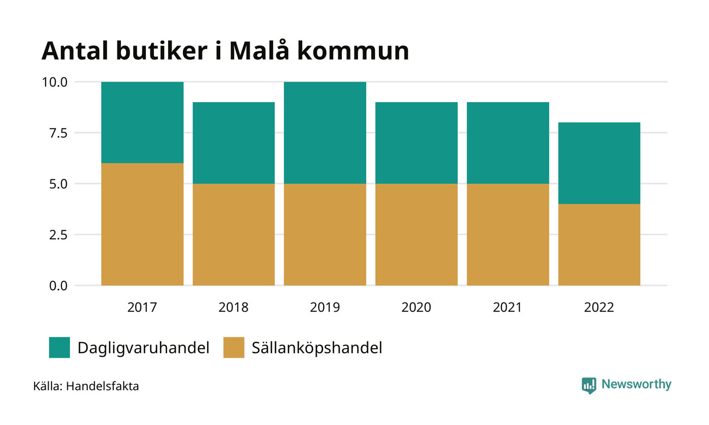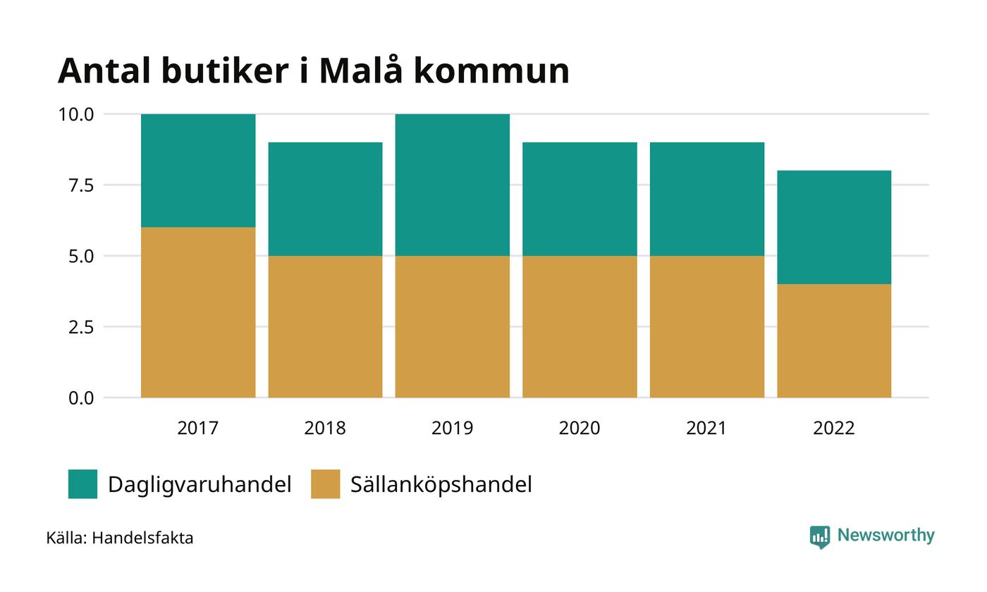 I Malå rör det sig om små tal. Den 30 november 2022 fanns åtta butiker i kommunen, vilket är en färre än året innan och två färre än 2017.