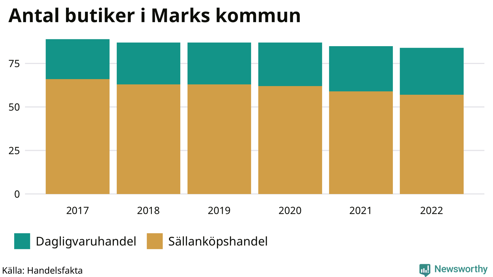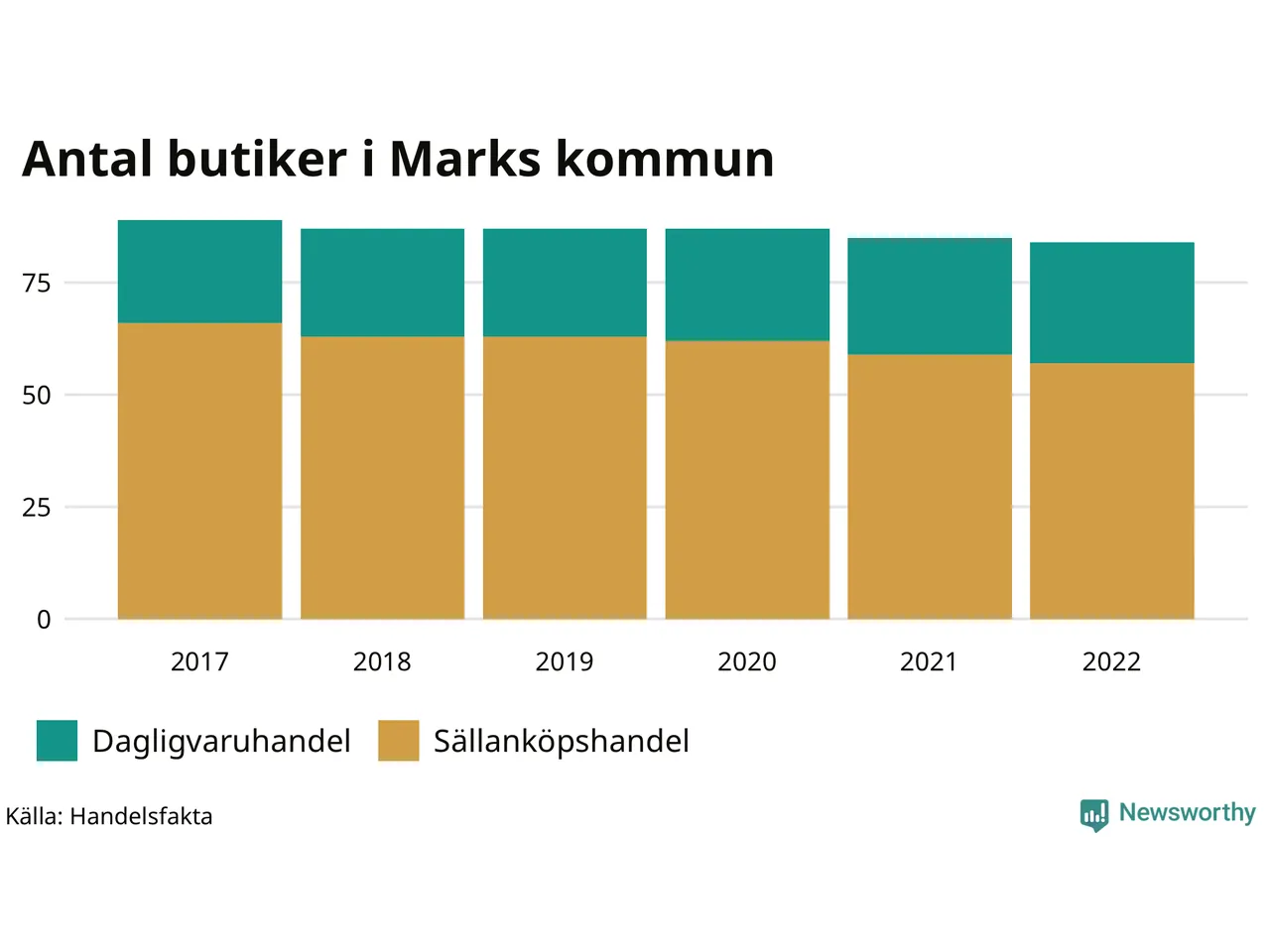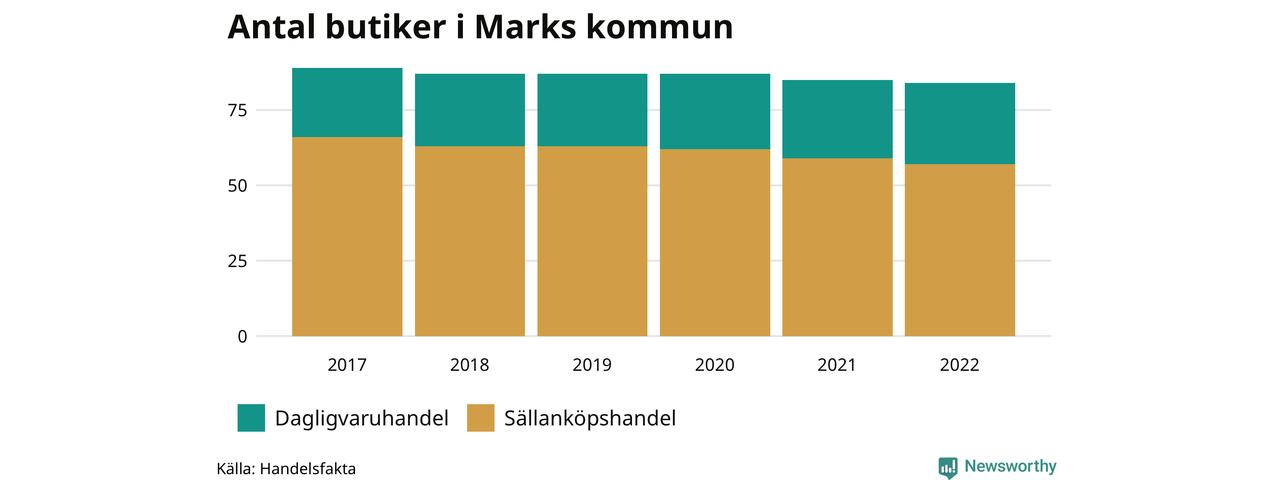 Samma utveckling ses i Marks kommun. Den 30 november 2022 fanns 84 butiker i kommunen, vilket är en färre än året innan och fem färre än 2017.
