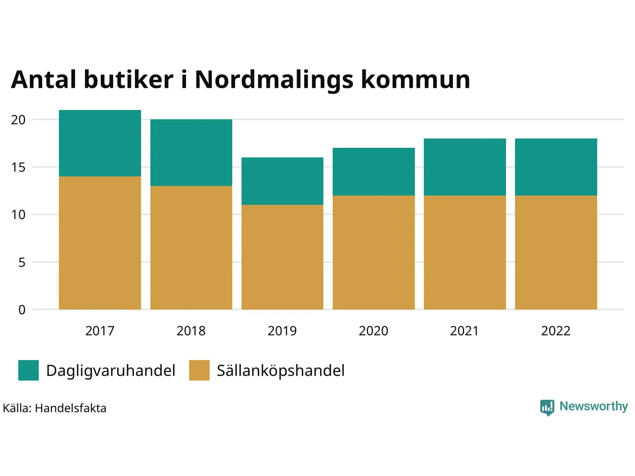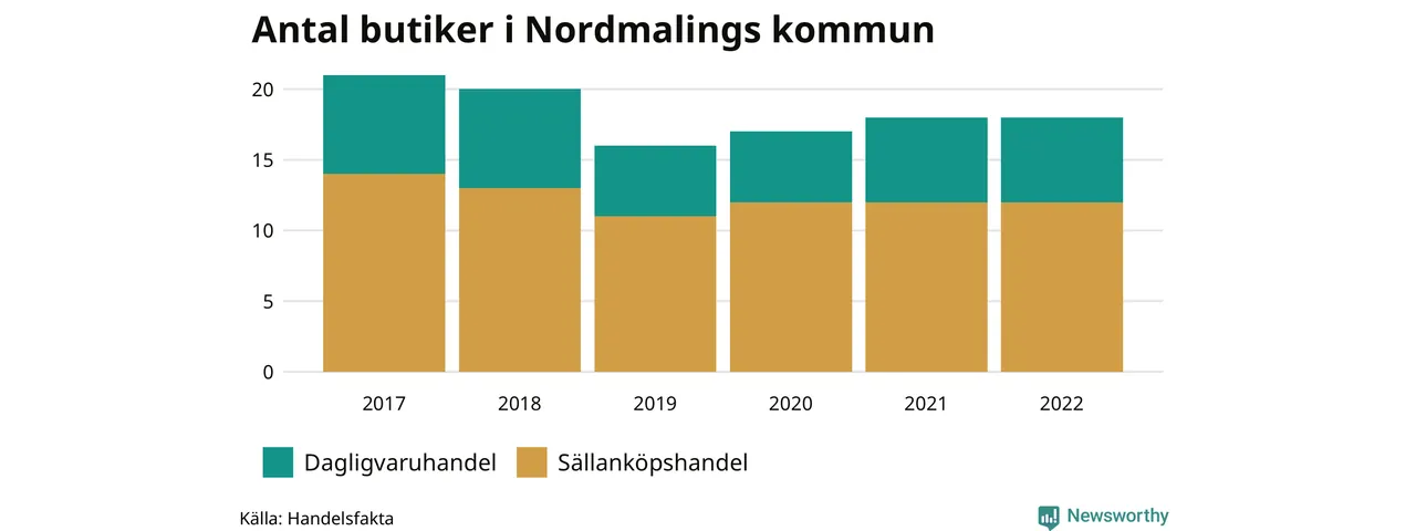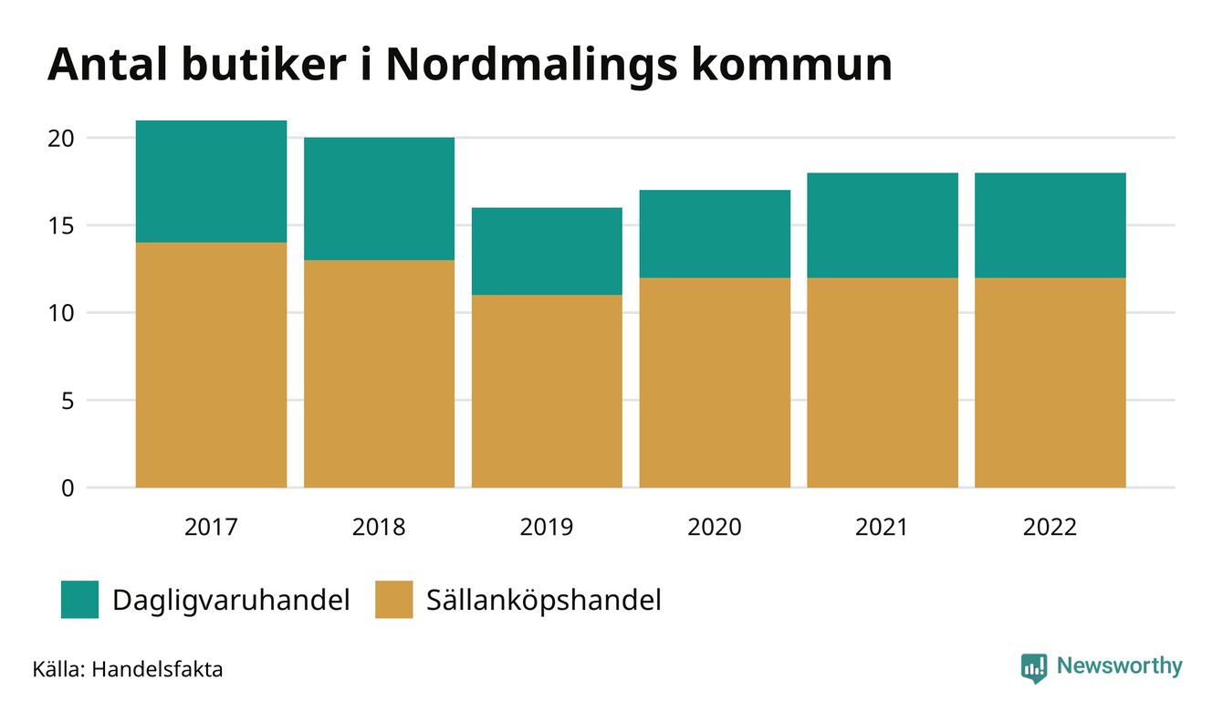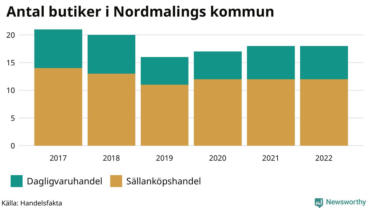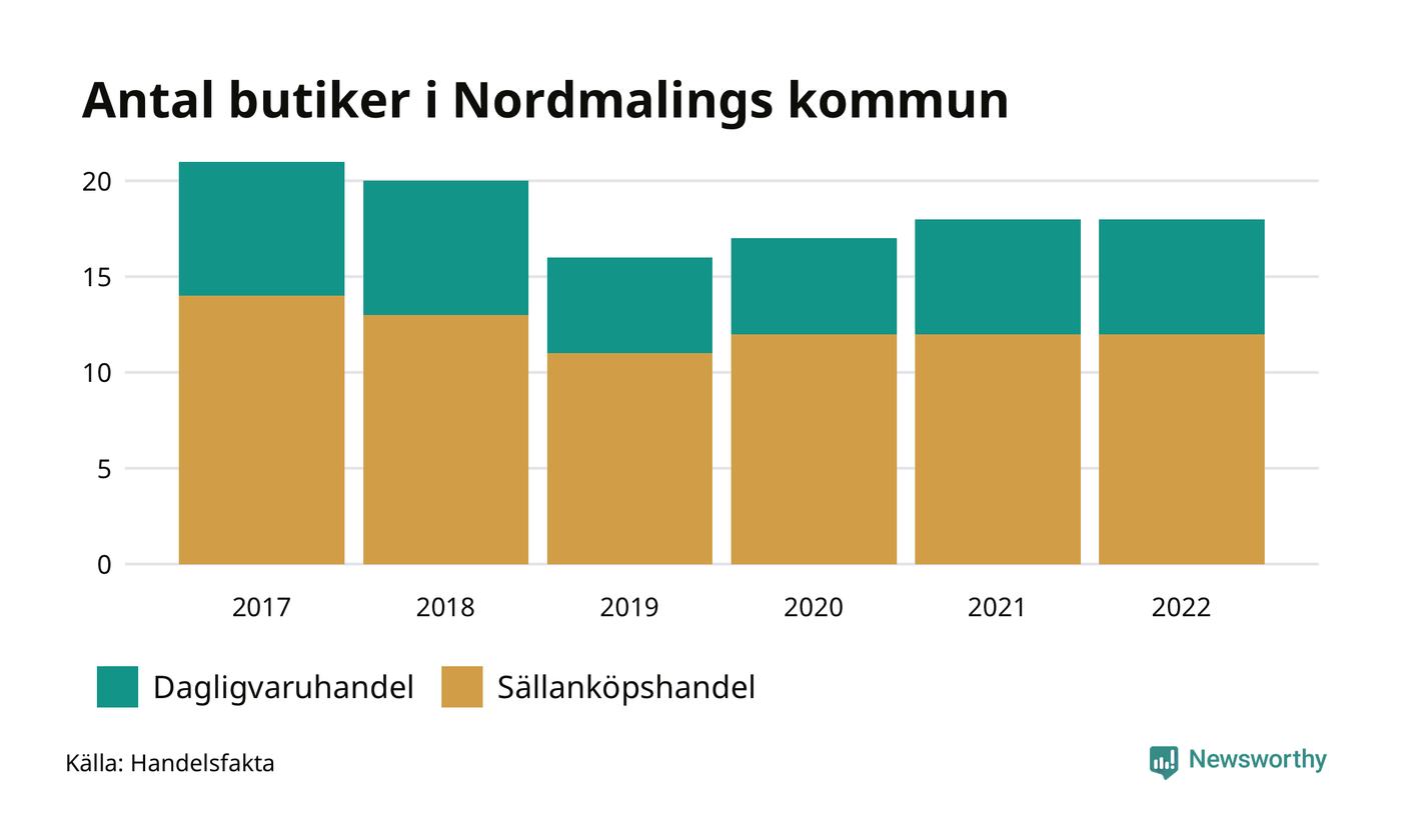 I Nordmaling rör det sig om små tal. Den 30 november 2022 fanns 18 butiker i kommunen, vilket är lika många som året innan men tre färre än 2017.