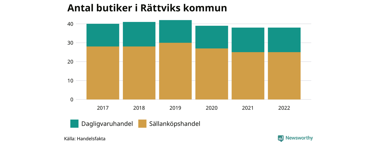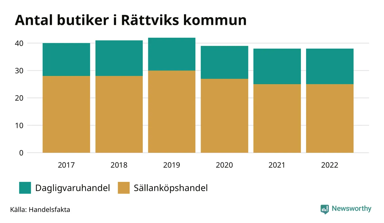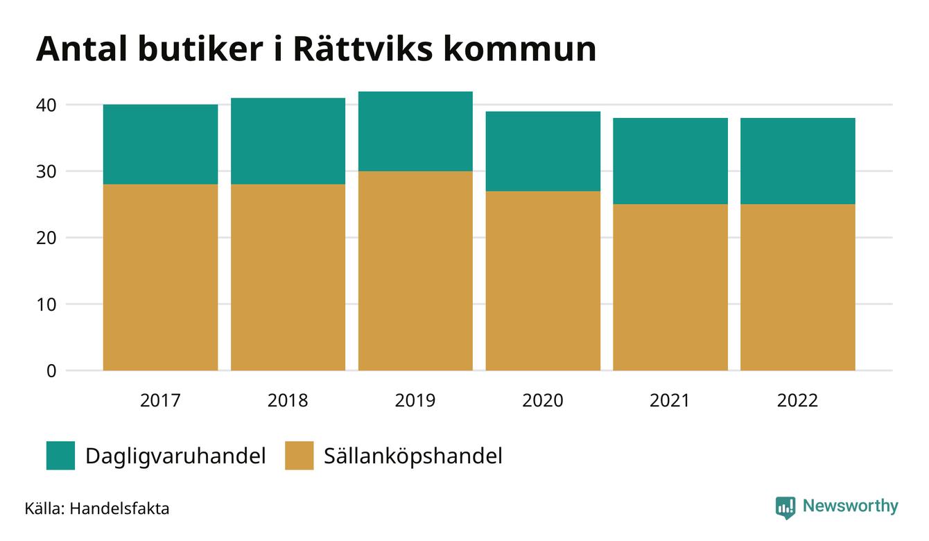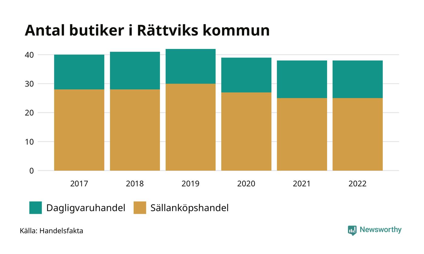 I Rättviks kommun har förändringarna varit relativt små. Den 30 november 2022 fanns 38 butiker i kommunen, vilket är lika många som året innan men två färre än 2017.